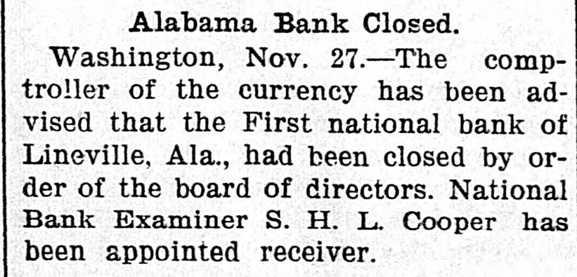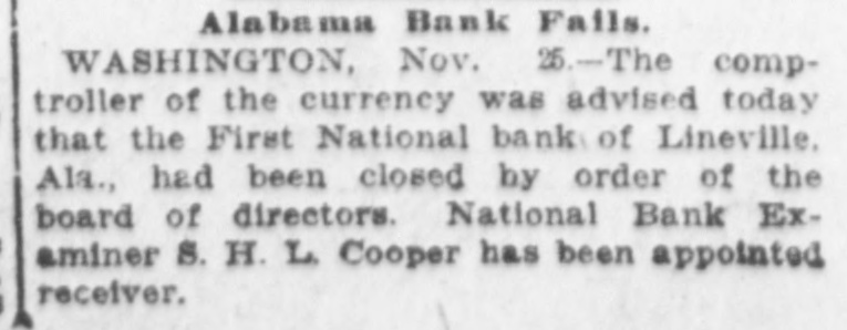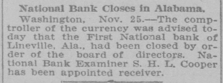 FIRST NATIONAL OF LINEVILLE CLOSES It Is Belleved That the Affairs of the Institution Will Soon Be Adjusted. Washington, November 25.-The comptroller of the currency was advised today that the First National bank of Lineville, Ala., had been closed by order of the board of directors. National Bank Examiner S. H. L. Cooper has been appointed receiver. The following is a statement of the resources and liabilities of the bank at the close of business on November 9, 1905, as shown by the last report of condition made to the comptroller: Resources: Loans and discounts, $44,802. United States bonds to secure circulation, $0250. Bonds, securities, etc., $628. Banking house and furniture and fixtures, $1798. Due from banks and bankers, $17,496 Checks and other cash items, $3815. Redemption fund, $312. Total, $75,102. Liabilities: Capital stock, $25,000. Surplus and undivided profits, $406. Circulating notes, $6250. Due to banks and bankers, $1052. Individual deposits, $24,415. Bills payable and rediscounts, $17,077. Total, $75,102. Talladega, November 25.-(Special.)-The directors of the Lineville bank ordered it temporarily closed on Thursday, in consequence of a threatened run, due to some rumors. It is not thought that any one will lose money by this action, or that the closing will be permanent. An examiner investigated the affairs of the bank today. It is hoped, and believed, that the difficulties of this institution will be but temporary.