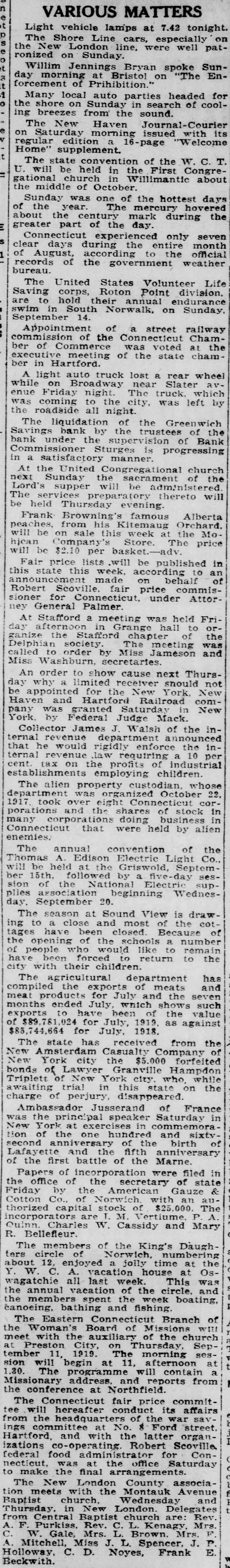 VARIOUS MATTERS Light vehicle lamps at 7.42 tonight. The Shore Line cars, especially on e the New London line, were well patronized on Sunday o t Willim Jennings Bryan spoke Sunday morning at Bristol on "The Enforcement of Prihibition. 1 Many local auto parties headed for the shore on Sunday in search of cooling breezes from the sound. The New Haven Journal-Courier e on Saturday morning issued with its regular edition a 16-page Welcome Home" supplement. t The state convention of the W. C. T. U. will be held in the First Congregational church in Willimantic about the middle of October. Sunday was one of the hottest days of the year. The mercury hovered about the century mark during the E greater part of the day. Connecticut experienced only seven clear days during the entire month 1 of August, according to the official records of the government weather bureau. The United States Volunteer Life Saving corps, Roton Point division. are to hold their annual endurance swim in South Norwalk, on Sunday. September 14. Appointment of a street railway commission of the Connecticut Chamber of Commerce was voted at the executive meeting of the state cham ber in Hartford. A light auto truck lost a rear wheel while on Broadway near Slater avenue Friday night. The truck, which was coming to the city, was left by the roadside all night. The liquidation of the Greenwich Savings bank by the trustees of the bank under the supervision of Bank Commissioner Sturges is progressing in a satisfactory manner. At the United Congregational church next Sunday the sacrament of the Lord's supper will be administered The services preparatory thereto will be held Thursday evening. Alberta Frank Browning's is famous peaches, from his Kitemaug Orchard, will be on sale this week at the Mo hican Company's Store. The price will be $2.10 per basket. adv Fair price lists .will be published in this state this week, according to an announcément made on behalf of Robert Scoville. fair price commissioner for Connecticut, under Attor ney General Palmer At Stafford a meeting was held Fri day afternoon in Grange hall to organize the Stafford chapter of the Delphian society. The meeting was called to order by Miss Jameson and Miss Washburn, secretaries. An order to show cause next Thursday why a limited receiver snould not be appointed for the New York, New Haven and Hartford Railroad company was granted Saturday in New York, by Federal Judge Mack. Collector James J. Walsh of the internal revenue department announced that he would rigidly enforce the internal revenue law requiring a 10 per cent tax on the profits of industrial establishments employing children. The alien property custodian, whose department was organized October 22. 1917 took over eight Connecticut corporation and the shares of stock in many corporations doing business in Connecticut that were held by alien enemies. The annual convention of the Thomas A. Edison Electric Light Co., will be held at the Griswold, September 15th, followed by a five-day session of the National Electric supplies association beginning Wednesday. September 20. The season at Sound View is draw ing to a close and most of the cot tages have been closed. Because of the opening of the schools number of people who would like to remain have been forced to return to the city with their children. The agricultural department has compiled the exports of meats and meat products for July and the seven months ended July which shows such exports to have been of the value of $89.781.024 for July, 1919. as against $85,744,664 for July, 1918. The state has received from the New Amsterdam Casualty Company of New York city the $5.000 forfeited bonds of Lawyer Granville Hampdon Triplett of New York city, who, while awaiting trial in this state on the charge of perjury, disappeared Ambassador Jusserand of France was the principal speaker Saturday in New York at exercises in commemoration of the one hundred and sixty of second anniversary of the birth Lafayette and the fifth anniversary of the first battle of the Marne. Papers of incorporation were filed in the office of the secretary of state Friday by the American Gauze & Cotton Co., of Norwich, with an authorized capital stock of $25.000. The incorporators are T. M. Vertiume, P A Quinn, Charles W. Cassidy and Mary R. Bellefleur. The members of the King's Daughters circle of Norwich, numbering about 12, enjoyed a jolly time at the Y. W. C. A. vacation house at Oswagatchie all last week. This was the annual vacation of the circle. and the members spent the week boating, canoeing, bathing and fishing. The Eastern Connecticut Branch of the Woman's Board of Missions will meet with the auxiliary of the church at Preston City, on Thursday, Sep. tember 11. 1919. The morning session will begin at 11, afternoon at 1.30. The programme will contain a Missionary address. and reports from the conference at Northfield. The Connecticut fair price committee will hereafter conduct its affairs from the headquarters of the war savings committee at No. & Ford street. Hartford, and with the latter organizations co-operating Robert Scoville, federal food administrator for Connecticut, was at the office Saturday to make the final arrangements. The New London County association meets with the Montauk Avenue Baptist church, Wednesday and Thursday in New London. Delegates from Central Baptist church are: Rev. A F Purkiss. Rev. C. L. Kenagy, Mrs. F C W. Gale. Mrs. L. Brown. Mrs. A Mitchell, Miss J. L. Spencer, J. P. E. Holloway, C. D. Noyes, Frank Beckwith.