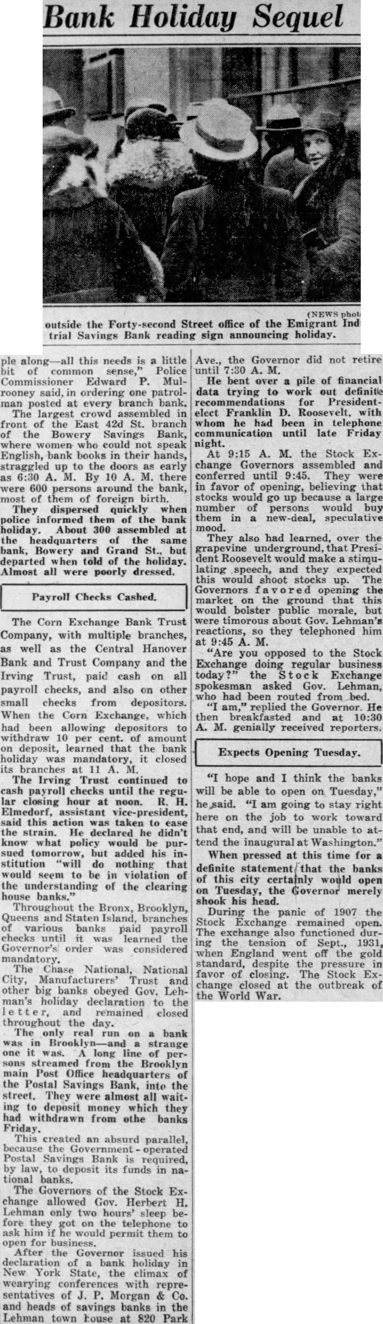 Bank Holiday Sequel ple along-all this needs is a little bit of common sense," Police Commissioner Edward P. Mulrooney said, in ordering one patrolman posted at every branch bank. The largest crowd assembled in front of the East 42d St. branch of the Bowery Savings Bank, where women who could not speak English, bank books in their hands, straggled up to the doors as early as 6:30 A. M. By 10 A. M. there were 600 persons around the bank, most of them of foreign birth. They dispersed quickly when police informed them of the bank holiday. About 300 assembled at the headquarters of the same bank, Bowery and Grand St., but departed when told of the holiday. Almost all were poorly dressed. Payroll Checks Cashed. The Corn Exchange Bank Trust Company, with multiple branches, as well as the Central Hanover Bank and Trust Company and the Irving Trust, paid cash on all payroll checks, and also on other small checks from depositors. When the Corn Exchange, which had been allowing depositors to withdraw 10 per cent. of amount on deposit, learned that the bank holiday was mandatory, it closed its branches at 11 A. M. The Irving Trust continued to cash payroll checks until the regular closing hour at noon. R. H. Elmedorf, assistant vice-president, said this action was taken to ease the strain. He declared he didn't know what policy would be pursued tomorrow, but added his institution "will do nothing that would seem to be in violation of the understanding of the clearing house banks." Throughout the Bronx, Brooklyn, Queens and Staten Island, branches of various banks paid payroll checks until it was learned the Governor's order was considered mandatory. The Chase National, National City, Manufacturers' Trust and other big banks obeyed Gov. Lehman's holiday declaration to the letter, and remained closed throughout the day. The only real run on a bank was in Brooklyn-and a strange one it was. A long line of persons streamed from the Brooklyn main Post Office headquarters of the Postal Savings Bank, into the street. They were almost all waiting to deposit money which they had withdrawn from othe banks Friday. This created an absurd parallel, because the Government operated Postal Savings Bank is required, by law, to deposit its funds in national banks. The Governors of the Stock Exchange allowed Gov. Herbert H. Lehman only two hours' sleep before they got on the telephone to ask him if he would permit them to open for business. After the Governor issued his declaration of a bank holiday in New York State, the climax of wearying conferences with representatives of J. P. Morgan & Co. and heads of savings banks in the Lehman town house at 820 Park Ave., the Governor did not retire until 7:30 A. M. He bent over a pile of financial data trying to work out definite recommendations for Presidentelect Franklin D. Roosevelt, with whom he had been in telephone communication until late Friday night. At 9:15 A. M. the Stock Exchange Governors assembled and conferred until 9:45. They were in favor of opening, believing that stocks would go up because a large number of persons would buy them in a new-deal, speculative mood. They also had learned, over the grapevine underground, that President Roosevelt would make a stimulating speech, and they expected this would shoot stocks up. The Governors opening the market on the ground that this would bolster public morale, but were timorous about Gov. Lehman's reactions, SO they telephoned him at 9:45 A. M. "Are you opposed to the Stock Exchange doing regular business today the Stock Exchange spokesman asked Gov. Lehman, who had been routed from bed. "I am," replied the Governor. He then breakfasted and at 10:30 A. M. genially received reporters. Expects Opening Tuesday. "I hope and I think the banks will be able to open on Tuesday," he said. "I am going to stay right here on the job to work toward that end, and will be unable to attend the inaugural at Washington." When pressed at this time for a definite statement the banks of this city certainly would open on Tuesday, the Governor merely shook his head. During the panic of 1907 the Stock Exchange remained open. The exchange also functioned during the tension of Sept., 1931, when England went off the gold standard, despite the pressure in favor of closing. The Stock Exchange closed at the outbreak of the World War.