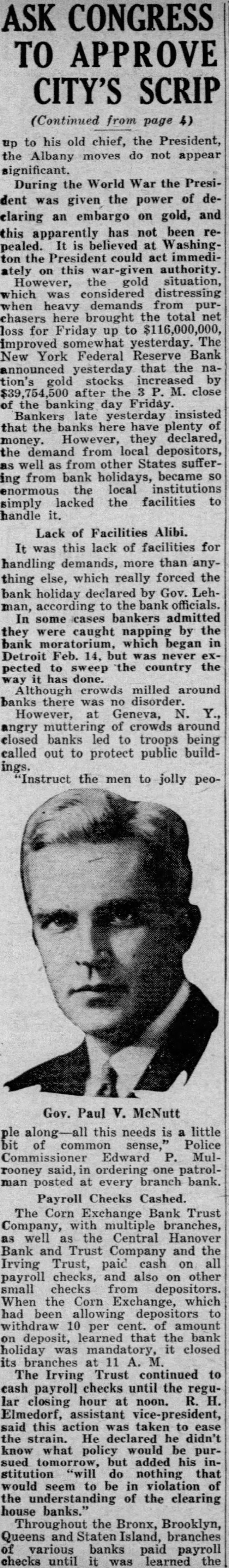 ASK CONGRESS TO APPROVE CITY'S SCRIP (Continued from page 4) up to his old chief, the President, the Albany moves do not appear significant. During the World War the President was given the power of declaring an embargo on gold, and this apparently has not been repealed. It is believed at Washington the President could act immediately on this war-given authority. However, the gold situation, which was considered distressing when heavy demands from purchasers here brought the total net loss for Friday up to $116,000,000, improved somewhat yesterday. The New York Federal Reserve Bank announced yesterday that the nation's gold stocks increased by $39,754,500 after the 3 P. M. close of the banking day Friday. Bankers late yesterday insisted that the banks here have plenty of money. However, they declared, the demand from local depositors, as well as from other States suffering from bank holidays, became so enormous the local institutions simply lacked the facilities to handle it. Lack of Facilities Alibi. It was this lack of facilities for handling demands, more than anything else, which really forced the bank holiday declared by Gov. Lehman, according to the bank officials. In some cases bankers admitted they were caught napping by the bank moratorium, which began in Detroit Feb. 14, but was never expected to sweep the country the way it has done. Although crowds milled around banks there was no disorder. However, at Geneva, N. Y., angry muttering of crowds around closed banks led to troops being called out to protect public buildings. "Instruct the men to jolly peo- ple along-all this needs is a little bit of common sense," Police Commissioner Edward P. Mulrooney said, in ordering one patrolman posted at every branch bank. Payroll Checks Cashed. The Corn Exchange Bank Trust Company, with multiple branches, as well as the Central Hanover Bank and Trust Company and the Irving Trust, paid cash on all payroll checks, and also on other small checks from depositors. When the Corn Exchange, which had been allowing depositors to withdraw 10 per cent. of amount on deposit, learned that the bank holiday was mandatory, it closed its branches at 11 A. M. The Irving Trust continued to cash payroll checks until the regular closing hour at noon. R. H. Elmedorf, assistant vice-president, said this action was taken to ease the strain. He declared he didn't know what policy would be pursued tomorrow, but added his institution "will do nothing that would seem to be in violation of the understanding of the clearing house banks." Throughout the Bronx, Brooklyn, Queens and Staten Island, branches of various banks paid payroll checks until it was learned the
