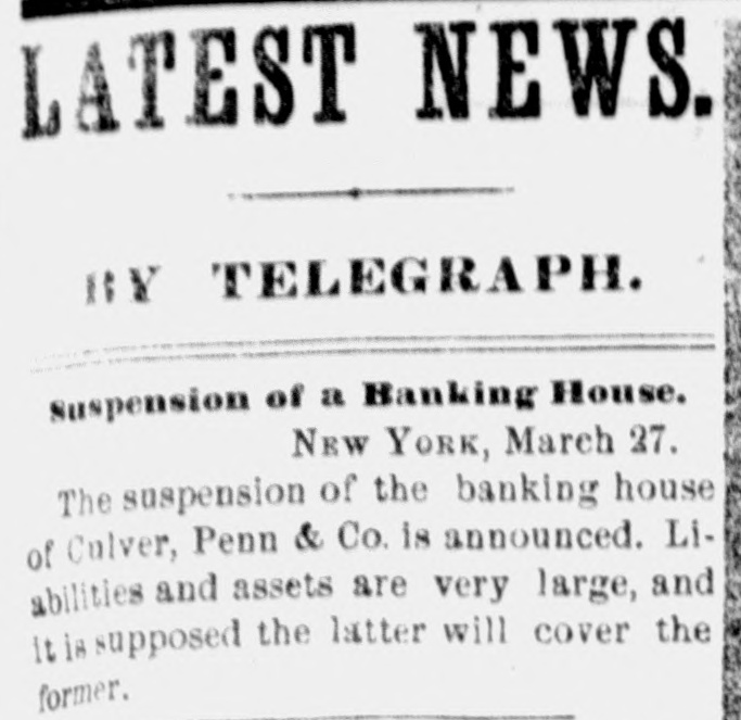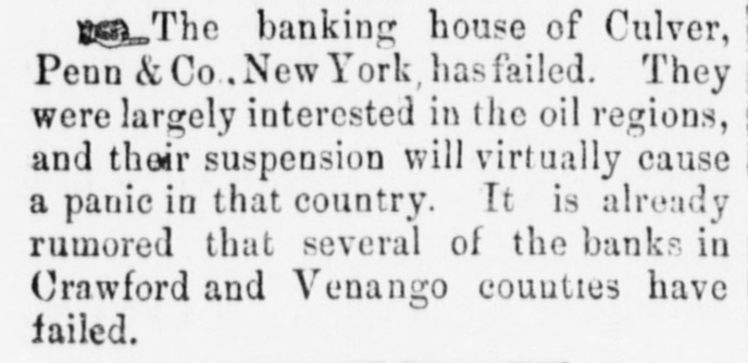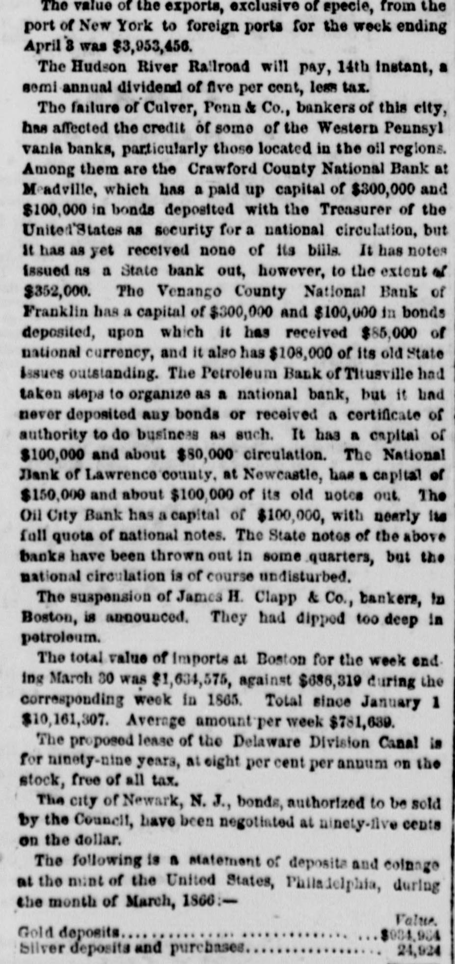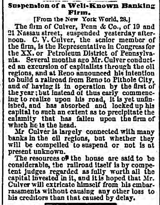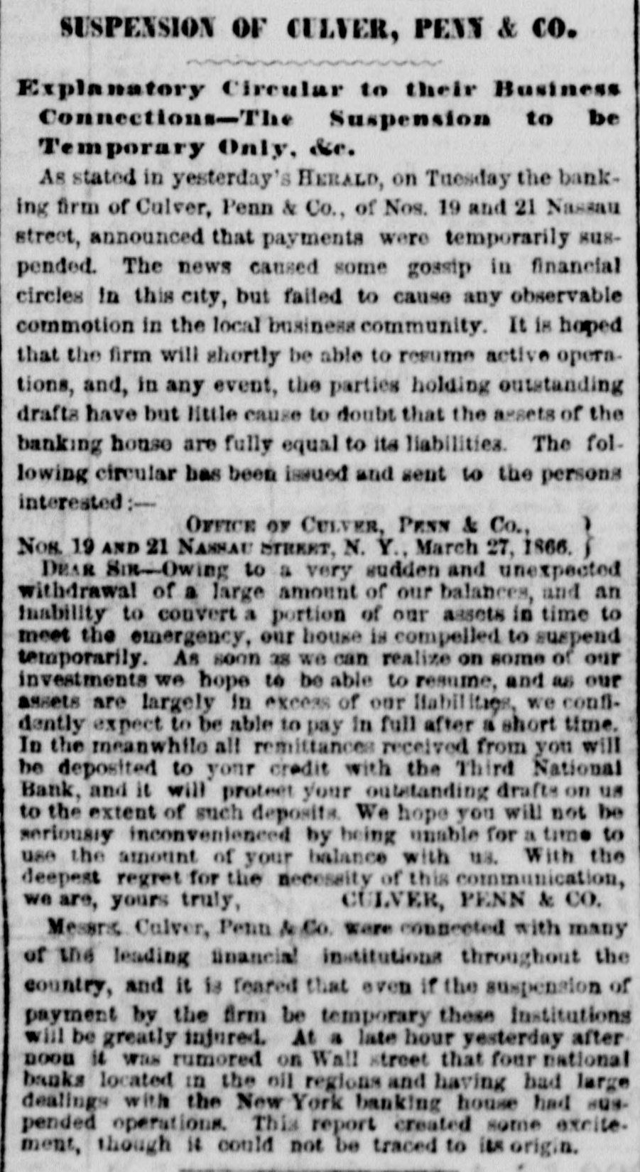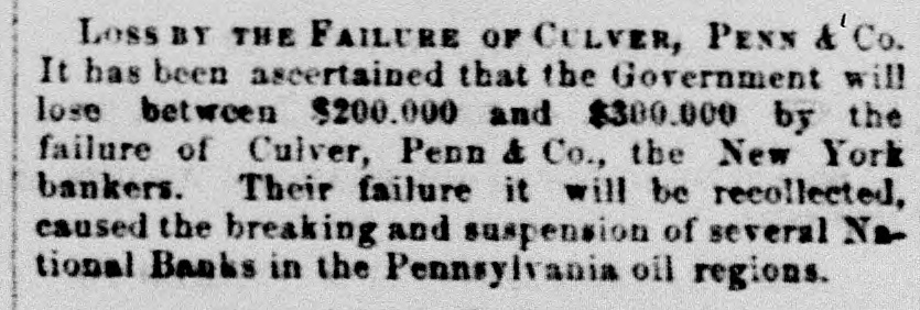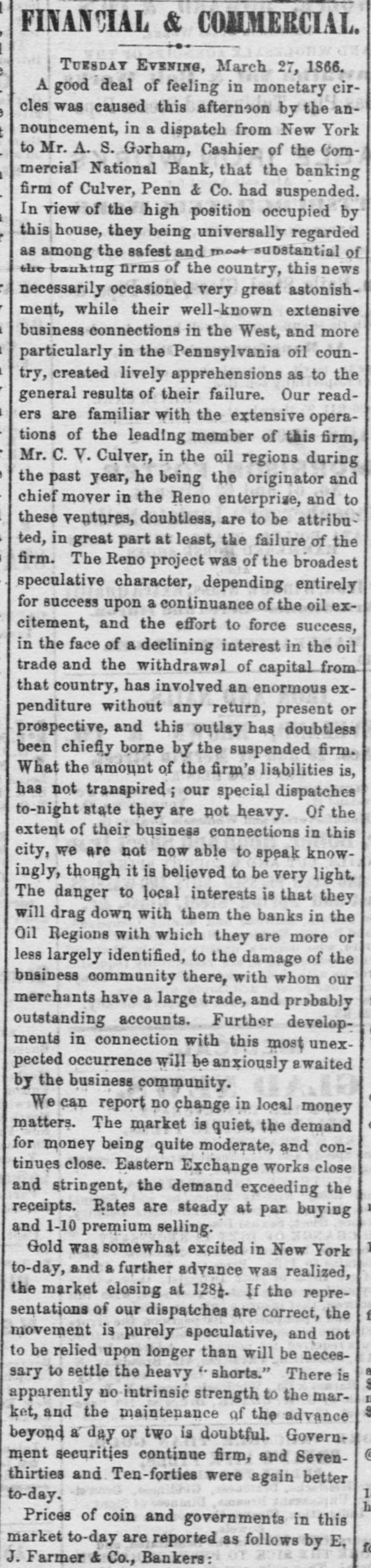 # FINANCIAL & COMMERCIAL. TUESDAY EVENING, March 27, 1866. A good deal of feeling in monetary circles was caused this afternoon by the announcement, in a dispatch from New York to Mr. A. S. Gorham, Cashier of the Commercial National Bank, that the banking firm of Culver, Penn & Co. had suspended. In view of the high position occupied by this house, they being universally regarded as among the safest and most substantial of the banking firms of the country, this news necessarily occasioned very great astonishment, while their well-known extensive business connections in the West, and more particularly in the Pennsylvania oil country, created lively apprehensions as to the general results of their failure. Our readers are familiar with the extensive operations of the leading member of this firm, Mr. C. V. Culver, in the oil regions during the past year, he being the originator and chief mover in the Reno enterprise, and to these ventures, doubtless, are to be attributed, in great part at least, the failure of the firm. The Reno project was of the broadest speculative character, depending entirely for success upon a continuance of the oil excitement, and the effort to force success, in the face of a declining interest in the oil trade and the withdrawal of capital from that country, has involved an enormous expenditure without any return, present or prospective, and this outlay has doubtless been chiefly borne by the suspended firm. What the amount of the firm's liabilities is, has not transpired; our special dispatches to-night state they are not heavy. Of the extent of their business connections in this city, we are not now able to speak knowingly, though it is believed to be very light. The danger to local interests is that they will drag down with them the banks in the Oil Regions with which they are more or less largely identified, to the damage of the business community there, with whom our merchants have a large trade, and probably outstanding accounts. Further developments in connection with this most unexpected occurrence will be anxiously awaited by the business community. We can report no change in local money matters. The market is quiet, the demand for money being quite moderate, and continues close. Eastern Exchange works close and stringent, the demand exceeding the receipts. Rates are steady at par buying and 1-10 premium selling. Gold was somewhat excited in New York to-day, and a further advance was realized, the market closing at 128¼. If the representations of our dispatches are correct, the movement is purely speculative, and not to be relied upon longer than will be necessary to settle the heavy "shorts." There is apparently no intrinsic strength to the market, and the maintenance of the advance beyond a day or two is doubtful. Government securities continue firm, and Seven-thirties and Ten-forties were again better to-day. Prices of coin and governments in this market to-day are reported as follows by E, J. Farmer & Co., Bankers: