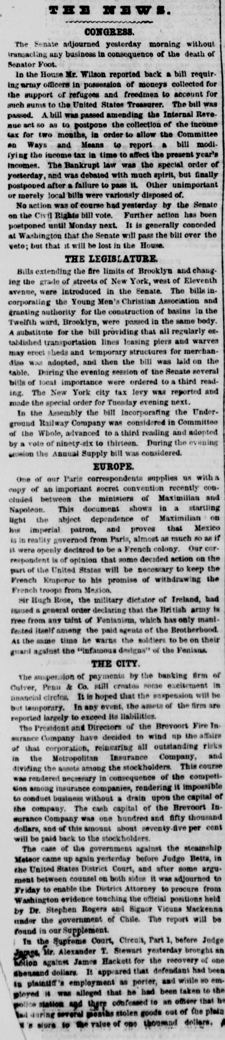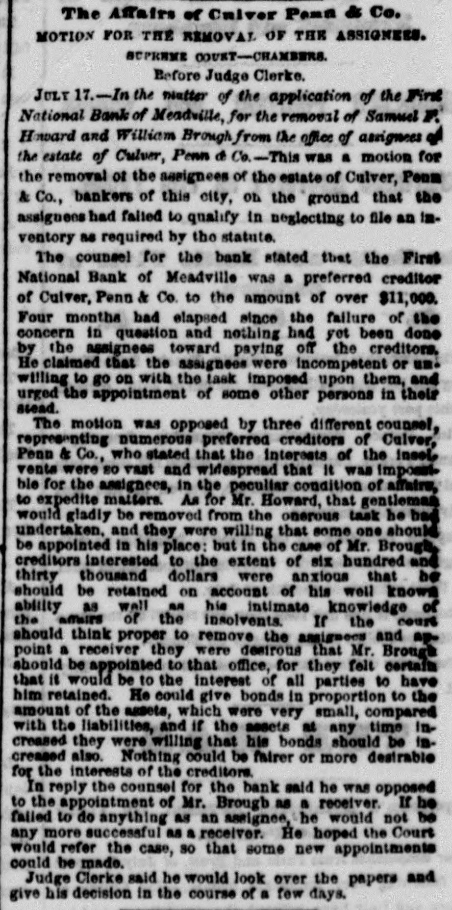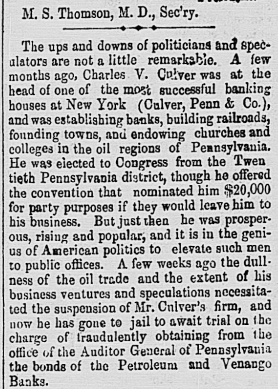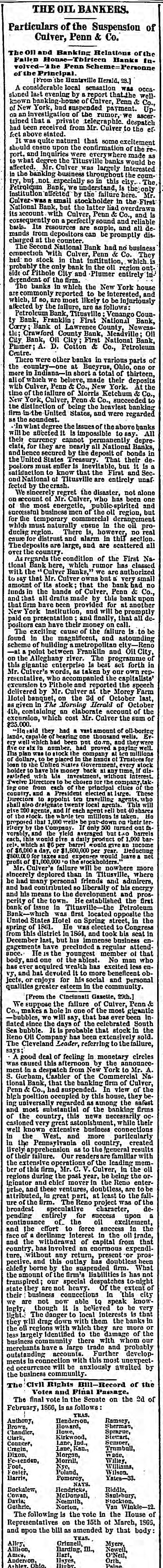 # FINANCIAL & COMMERCIAL. TUESDAY EVENING, March 27, 1866. A good deal of feeling in monetary circles was caused this afternoon by the announcement, in a dispatch from New York to Mr. A. S. Gorham, Cashier of the Commercial National Bank, that the banking firm of Culver, Penn & Co. had suspended. In view of the high position occupied by this house, they being universally regarded as among the safest and most substantial of the banking firms of the country, this news necessarily occasioned very great astonishment, while their well-known extensive business connections in the West, and more particularly in the Pennsylvania oil country, created lively apprehensions as to the general results of their failure. Our readers are familiar with the extensive operations of the leading member of this firm, Mr. C. V. Culver, in the oil regions during the past year, he being the originator and chief mover in the Reno enterprise, and to these ventures, doubtless, are to be attributed, in great part at least, the failure of the firm. The Reno project was of the broadest speculative character, depending entirely for success upon a continuance of the oil excitement, and the effort to force success, in the face of a declining interest in the oil trade and the withdrawal of capital from that country, has involved an enormous expenditure without any return, present or prospective, and this outlay has doubtless been chiefly borne by the suspended firm. What the amount of the firm's liabilities is, has not transpired; our special dispatches to-night state they are not heavy. Of the extent of their business connections in this city, we are not now able to speak knowingly, though it is believed to be very light. The danger to local interests is that they will drag down with them the banks in the Oil Regions with which they are more or less largely identified, to the damage of the business community there, with whom our merchants have a large trade, and probably outstanding accounts. Further developments in connection with this most unexpected occurrence will be anxiously awaited by the business community. We can report no change in local money matters. The market is quiet, the demand for money being quite moderate, and continues close. Eastern Exchange works close and stringent, the demand exceeding the receipts. Rates are steady at par buying and 1-10 premium selling. Gold was somewhat excited in New York to-day, and a further advance was realized, the market closing at 128¼. If the representations of our dispatches are correct, the movement is purely speculative, and not to be relied upon longer than will be necessary to settle the heavy "shorts." There is apparently no intrinsic strength to the market, and the maintenance of the advance beyond a day or two is doubtful. Government securities continue firm, and Seven-thirties and Ten-forties were again better to-day. Prices of coin and governments in this market to-day are reported as follows by E, J. Farmer & Co., Bankers: