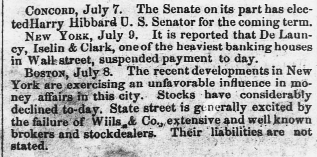 CONCORD, July 7. The Senate on its part has electedHarry Hibbard U. S. Senator for the coming term. NEW YORK, July 9, It is reported that De Launcy, Iselin & Clark, one of the heaviest banking houses in Wall street, suspended payment to day. BOSTON, July 8. The recent developments in New York are exercising an unfavorable influence in money affairs in this city. Stocks have considerably declined to-day. State street is generally excited by the failure of Wiils, & Co., extensive and well known brokers and stockdealers. Their liabilities are not stated.