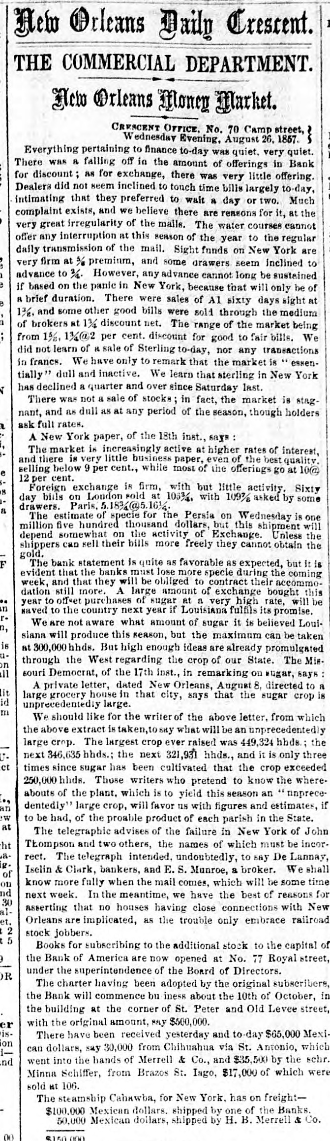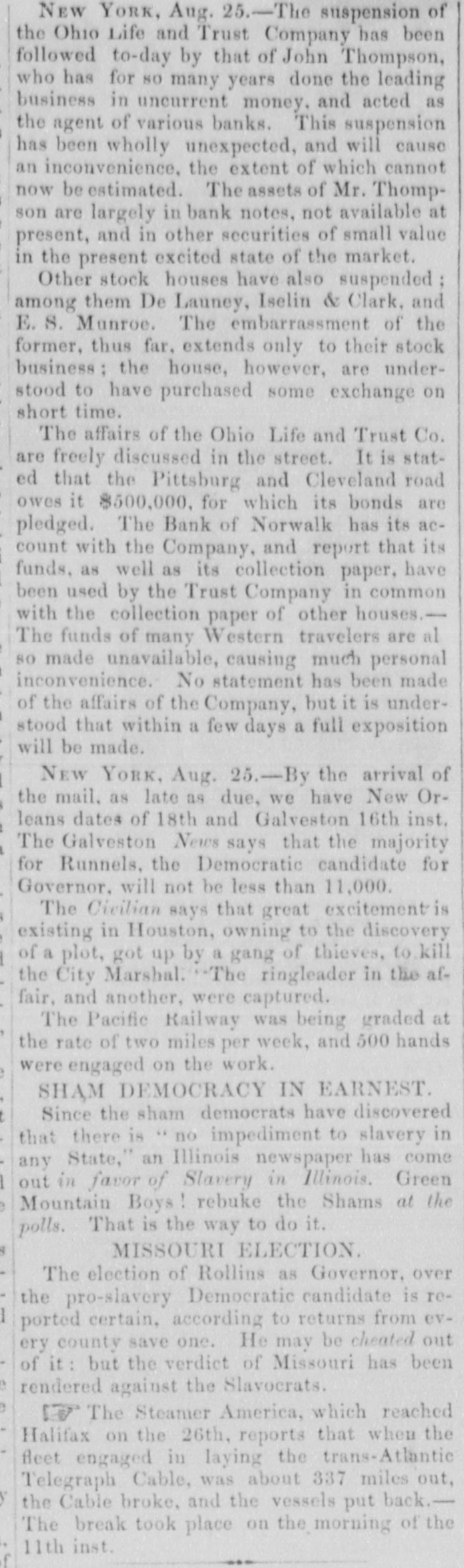 The steamship America. now due at Halifax with European news to the 15th inst., three days later than previous advices, had not made her appear. ance up to nine o'clock last evening. The financial panic in Wall street was increased yesterday by the announcement of the failure of De Launay, Iselin & Clarke John Thompson and E. S. Monroe, bankers and stock brokers, and the reported failure of a Hartford bank; the Rhode Island Central Bank of East Greenwich: the Tiverton Bank, of Rhode Island: the Farmers' Bank, of Wickford: the Warren Bank, of Pennsylvania; the Bank of Kanawha, Virginia, and the Hancock Bank, of Maine. The semi annual meeting of the American State Council was held at Gothic Hall, Brooklyn, yesterday, about one hundred and twenty delegates being present. The President, J. C. Dann. of Buffalo, delivered an address on the state of the Order, from which it would appear tnst the party in the State are in a living condition, notwith standing their overwhelming defeat last fall. He also advises the adjournment of the State Council sine die, after the manner of the National Council at Louisville ; and thinks it would be well for the Order in this State to throw open their doors and abolish all secrecy. The President prophesies the atter downfall of the republican party in the country at no distant day, and in proof of it cites the recent disastrous defeats experienced throughout the portions of country in which elections have recently been held; also their eagerness to hold fast to the ekirts of the candidates of other parties. The Council fixed the time for holding the State Nominating Convention at Syracuse on the 15th of September, and resolved that any change in the organization of the American party of this State it the present time was inexpedient. Several important amendments were made to the constitution also; one of which was to hold but one yearly ses sion of State Council hereafter, instead of two; and others regulating the order for the working of councils During the day several rather spicy debates occurred on the several questions before the Council, a sketch of which may be found in another column. The Council finally, at twenty minutes at ter SIXO clock, acjourned, to meet at Albany on the fourth Tuesday of August, 1858. The Board of Excise Commissioners met yesterday, and after receiving several applications for 11. cense. adjourned till Tuesday next. when they will continue their sessions for thirty-six consecutive days. It is understood that the Temperance Alliance will at the same time commence prosecutions against Liquor dealers, selecting those who are able to pay whatever penalty may be imposed. The Excise Board have nothing to do with these prosecutions, although the suits are brought in their name. The question as to the disposition of the books of the Street Commissioner's Department was to have been argued yesterday before Judge Peabody, of the Supreme Court, but after some conversation be tween counsel the case was postponed un September 1. The argument with regard to the Conover contempt was also postponed till the 1st of September. The Board of Ten Governors met yesterday, and indulged in a little genteel plug aglyism, all about the discharge of one of the deputy superintendents of the workhouse, named Reynolds, who, it is al leged, offered resolutions at a republican meeting condempatory of Simeon Draper's course when Po lice Commissioner. The matter was finally referred to a select committee, who will investigate the facts. There are now 6,526 persons in the public institutions-an increase of 116 since last week. The first Regiment New York Volunteers met last evening and had a stormy session. Provision was made for the reception of the Pennsylvania Volun teers on their coming visit by the appointment of a Committee of A rrangements. A series of resolutions were adopted, after a stormy debate, disapproving of the action of the committee of the Common Council in awarding the Jackson gold box to Garrett W. Dyckman, and recommending General Ward B. Burnett as most entitled to it. Major Dyckman made B epeech in his own behalf occasioning considerable excitement. At the meeting of the Health Commissioners yes. terday, Mr. O. A. Ferris made some interesting remarks, showing the unfitness and inconvenience of the quarantine regulations this year. The Central Park Commissioners yesterday pass ed a resolution offering four thousand five hundred dollars for four plans for laying out the Central Park. as follows:- For the best plan, $2,000: for the second best, $1,000; for the third best, $750: for the fourth beet, $500. The General Superintendent of Police yesterday issued orders for the stoppage of organ music after ten Velock and for the policemen to report the names of all junk dealers and pawnbrokers. It appears that the investigations as to the means of saving life on the various steamboats originated with Mayor Wood about two years since, and the blame for the neglect to remedy the evils rests with the District Attorney. A special committee of five was appointed in the Board of Councilmen on Monday, to report upon the expediency of establishing a ferry to run from Jackson street to Hudson avenue, Brooklyn. There was a large amount of business transacted n the Court of Special Bessions yesterday, but the cases were of the usual unimportant character. The despatch from Washington in Monday pa per should have read: "Mr. Meek, of Pennsylvania. declines the appointment of Superintendent of in dian Affairs in Utah. The sales of coston yesterday were confined to about 300 a 400 bales, the marketciosing Arm. Flour was in good supply, with A light demand and more pressure to sell and the market closed at a decline of about 15c. a 20c. per bbl, chiefly on the common and lower grades Wheat also namier with more doing in new Red Tennessee sold at $1 10 $1 42 a $1 45, and common white Southern at $1 65, and prime do at $1 70. Corn was in light sup ply, and, with a g