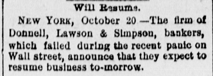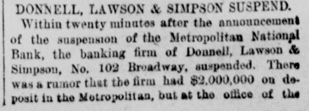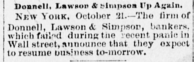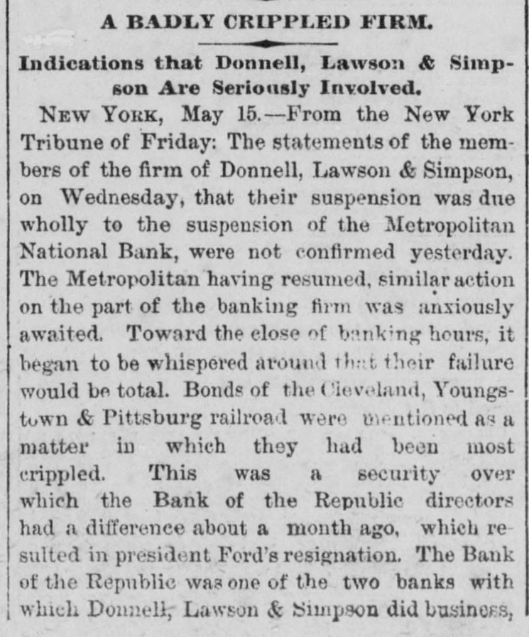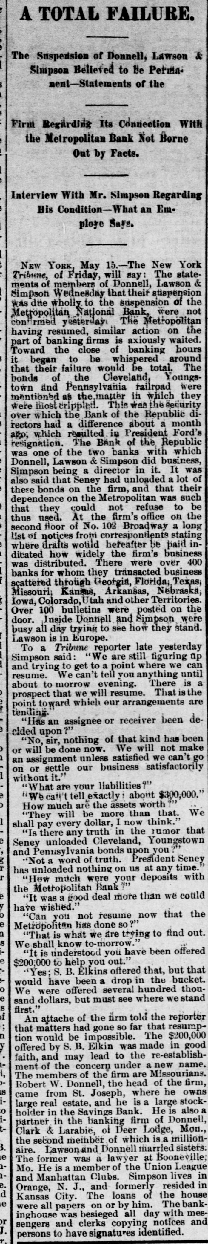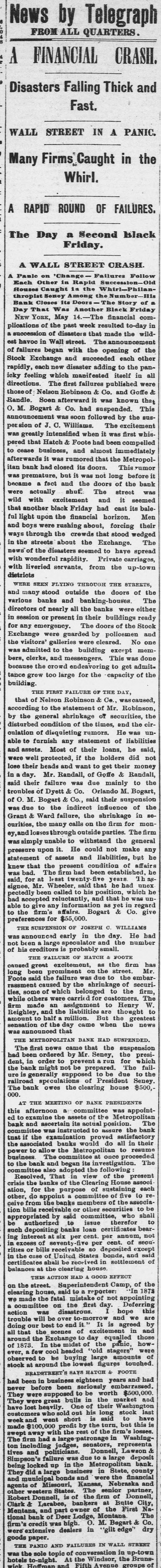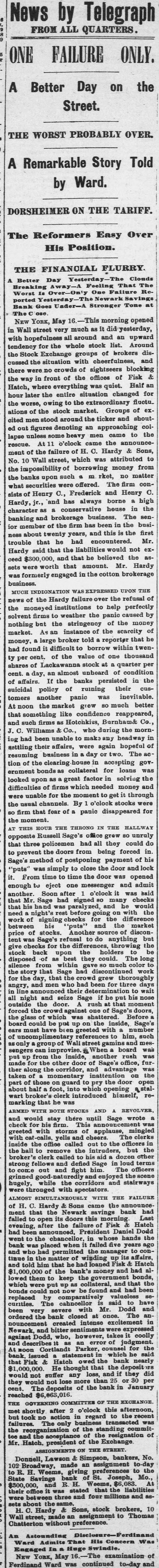 FROM ALL QUARTERS. A FINANCIAL CRASH. Disasters Falling Thick and Fast. WALL STREET IN A PANIC. Many Firms Caught in the Whirl. A RAPID ROUND OF FAILURES. The Day a Second Black Friday. A WALL STREET CRASH. A Paule on Change- Failures Fellow Each Other in Rapid Succession-Old Houses Caught 1a the Whirl-Philanthropist Seney Among the NumberBank Closes its Doors The Story of a Day That Was Another Black Friday NEW YORK, May 14.-The financial complications of the past week resulted to-day in a succession of disasters that made the wildest havoc in Wall street. The announcement of failures began with the opening of the Stock Exchange and succeeded each other rapidly, each new disaster adding to the panicky feeling which manifested itself in all directions. The first failures published were those of Nelson Rebinson & Co. and Goffe & Randle. Soen afterward it was known that O. M. Bogart & Co. had suspended. This announcement was soon followed by the suspersion of J. C. Williams. The excitement was greatly intensified when it was first whis pered that Hatch & Foote had been compelled to cease business, and almost immediately afterwards it was rumored that the Metropolitan bank had closed its doors. This Fumor was premature, but it was not long before it became fact and the doors of the bank were actually shuf. The street was wild with excitement and it seemed that another black Friday had cast its bale ful light upon the financial horizon. Men and boys were rushing about, forcing their ways through the crewds that stood wedged in the streets about the Exchange. The news of the disasters seemed to have spread with wonderful rapidity. Private carriages, with liveried servants, from the up-town districts WERE SEEN FLYING THROUGH THE STREETS, and many stood outside the doors of the various banks and banking-houses The directors of nearly all the banks were either in session or present in their buildings ready for any emergency. The doors of the Stock Exchange were guarded by policemen and the visitors' galleries were cleared. No one was admitted to the building except members, clerks, and messengers. This was done because the crowd endeavoring to get admits tance grew too large for the capacity of the building. THE FIRST FAILURE OF THE DAY, that of Nelson Robinson & Ce., wascaused, according to the statement of Mr. Robinson, by the general shrinkage of securities, the disturbed condition of the times, and the circulation of disquieting rumors. He was unable to furnish any statement of liabilities and assets. Most of their loans, he said, were well protected, if the holders did not lose their heads and want to get their money in day. Mr. Randall, of Goffe & Randall, said their failure was due mainly to the troubles of Dyett & Co. Orlando M. Bogart, of O. M. Bogart & Co., said their suspension was due to the indirect influence of the Grant & Ward failure, the shrinkage in 80curities, the many calls on the firm for mon losses through outside parties. The firm simply unable to withstand the general pressure upon it. He could not make any statement of assets and liabilities, but he knew that the present condition of affairs was bad. The firm had been established, he said, for at least twenty five years Tb assignee, Mr. Wheeler, said that he had unex pectedly been called to his position, which he bad accepted reluctantly, and that he was un able to give any information as yet in regard to the firm's affairs. Bogart & Co. give preferences for $55,000. THE SUSPENSION OF JOSEPH C. WILLIAMS was announced early in the day. He bad not been large speculator and the number of his creditors is probably small. THE FAILURE OF HATCH FOOTE caused great excitement, as the firm has long been prominent on the street Mr. Foote said the failure was due to the embarrassment caused by the shrinkage of securities, some of which belonged to the firm, while others were carried for customers. The firm made an assignment to Henry W. Reighley, and the liabilities are thought to amount to half million. But the greatest sensation of the day came when the news was announced that THE METROPOLITAN BANK HAD SUSPENDED. The first news came that the suspension had been ordered by Mr. Seney, the president, in order to prevent run for which the bank might not be prepared. The failure is generally supposed to be due to the railroad speculations of President Seney. The bank owes the clearing house $500,000. AT THE MEETING OF BANK PRESIDENTS this afternoon a committee was appointed to examine the assets of the Metropolitan The bank and ascertain its actual position. committee was instructed to assure the bank tust if the examination proved satisfactory the associated banks would do all in their power to allow the Metropolitan to resume business The committee at once proceeded to the bank and began its nvestigation. The committee also adopted the following Resolved, That in view of the present crisis the banks of the Clearing House assooi ation, for the parpose of sustaining each other, do appoint committee of five to receive from the banks members of the association bills receivable or other securities to be appropriated by said committee, who shall be authorized to issue therefor to such depositing banks loan certificates bearing interest at six per cent. per annum, not in excess of seventy -five per cent. of seou: rities or bills receivable 80 deposited except in the case of United States bonds, and said certificates shall be rece in settlement of balances at the clearing house THIS ACTION HAD GOOD EFFECT on the street. perintendent Camp, of the clearing house, said to reporter: "In 1878 we made the fatal mistake of not appointing a committee on the first day. Deferring action was disastrous. hope this trouble will be over to-morrow and we are doing our best to end it." It is agreed by all that the scenes of excitement in and around the Exchange to day equalled those of 1873. In the midst of the panic, however, few cool headed "old stagers" 