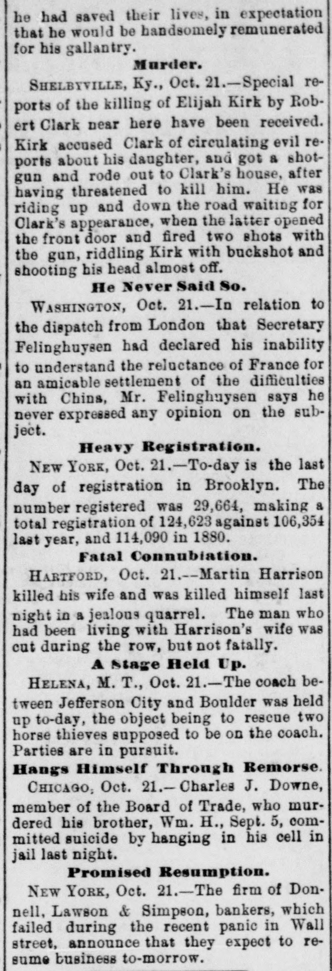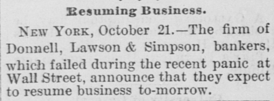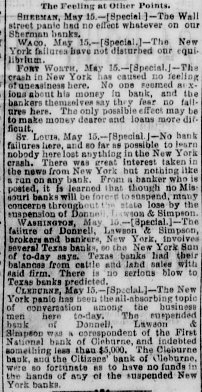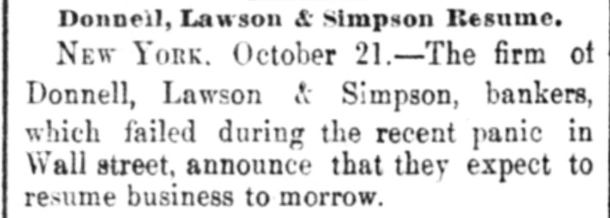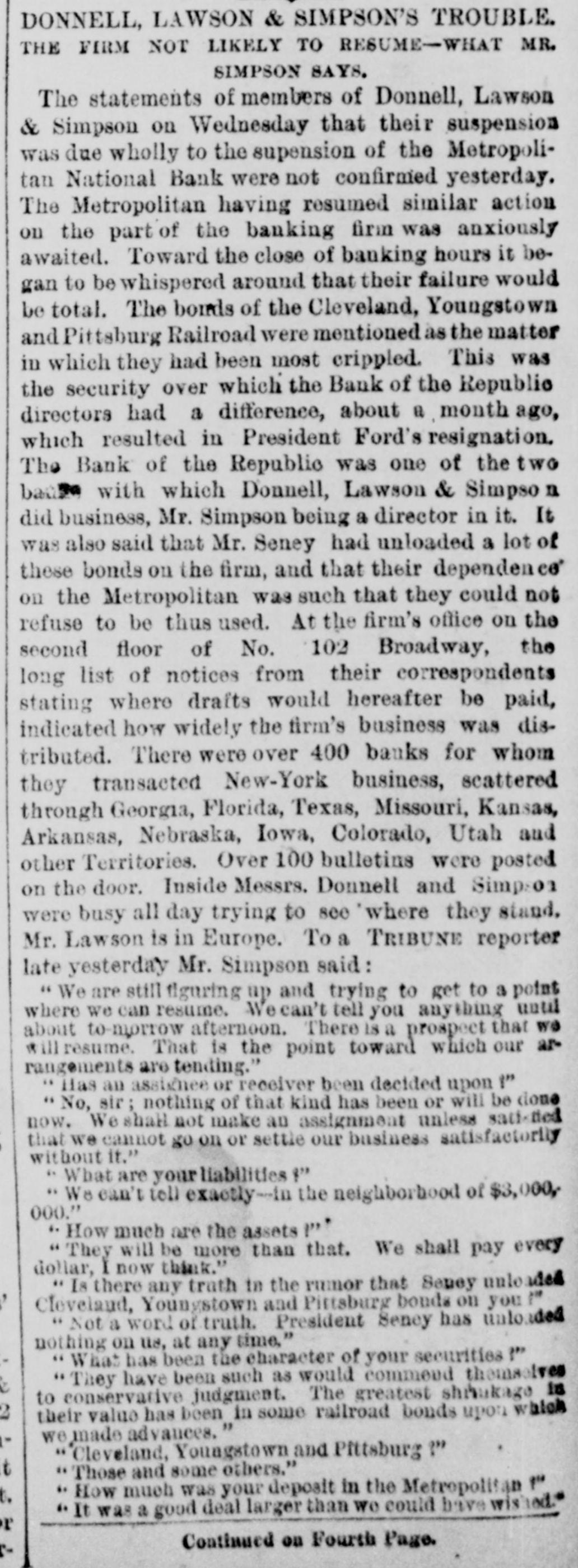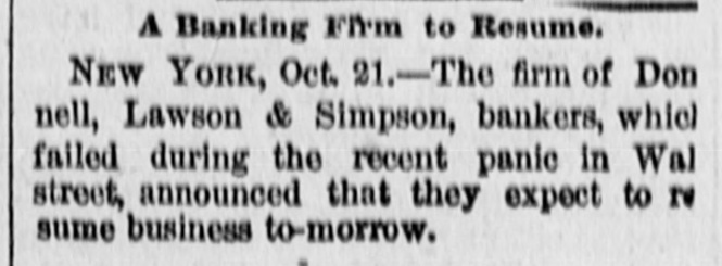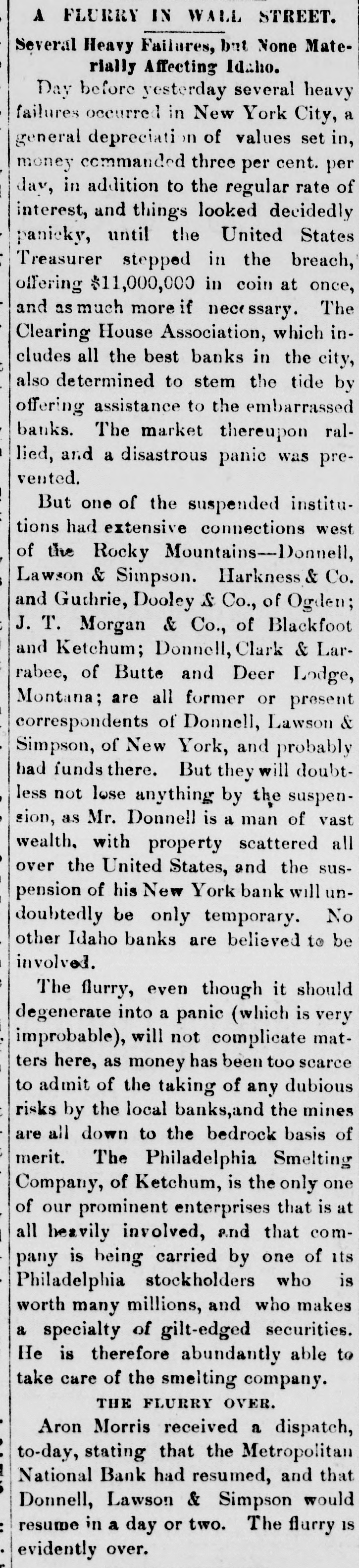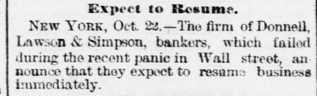 FROM ALL QUARTERS. A FINANCIAL CRASH. Disasters Falling Thick and Fast. WALL STREET IN A PANIC. Many Firms Caught in the Whirl. A RAPID ROUND OF FAILURES. The Day a Second Black Friday. A WALL STREET CRASH. A Paule on Change- Failures Fellow Each Other in Rapid Succession-Old Houses Caught 1a the Whirl-Philanthropist Seney Among the NumberBank Closes its Doors The Story of a Day That Was Another Black Friday NEW YORK, May 14.-The financial complications of the past week resulted to-day in a succession of disasters that made the wildest havoc in Wall street. The announcement of failures began with the opening of the Stock Exchange and succeeded each other rapidly, each new disaster adding to the panicky feeling which manifested itself in all directions. The first failures published were those of Nelson Rebinson & Co. and Goffe & Randle. Soen afterward it was known that O. M. Bogart & Co. had suspended. This announcement was soon followed by the suspersion of J. C. Williams. The excitement was greatly intensified when it was first whis pered that Hatch & Foote had been compelled to cease business, and almost immediately afterwards it was rumored that the Metropolitan bank had closed its doors. This Fumor was premature, but it was not long before it became fact and the doors of the bank were actually shuf. The street was wild with excitement and it seemed that another black Friday had cast its bale ful light upon the financial horizon. Men and boys were rushing about, forcing their ways through the crewds that stood wedged in the streets about the Exchange. The news of the disasters seemed to have spread with wonderful rapidity. Private carriages, with liveried servants, from the up-town districts WERE SEEN FLYING THROUGH THE STREETS, and many stood outside the doors of the various banks and banking-houses The directors of nearly all the banks were either in session or present in their buildings ready for any emergency. The doors of the Stock Exchange were guarded by policemen and the visitors' galleries were cleared. No one was admitted to the building except members, clerks, and messengers. This was done because the crowd endeavoring to get admits tance grew too large for the capacity of the building. THE FIRST FAILURE OF THE DAY, that of Nelson Robinson & Ce., wascaused, according to the statement of Mr. Robinson, by the general shrinkage of securities, the disturbed condition of the times, and the circulation of disquieting rumors. He was unable to furnish any statement of liabilities and assets. Most of their loans, he said, were well protected, if the holders did not lose their heads and want to get their money in day. Mr. Randall, of Goffe & Randall, said their failure was due mainly to the troubles of Dyett & Co. Orlando M. Bogart, of O. M. Bogart & Co., said their suspension was due to the indirect influence of the Grant & Ward failure, the shrinkage in 80curities, the many calls on the firm for mon losses through outside parties. The firm simply unable to withstand the general pressure upon it. He could not make any statement of assets and liabilities, but he knew that the present condition of affairs was bad. The firm had been established, he said, for at least twenty five years Tb assignee, Mr. Wheeler, said that he had unex pectedly been called to his position, which he bad accepted reluctantly, and that he was un able to give any information as yet in regard to the firm's affairs. Bogart & Co. give preferences for $55,000. THE SUSPENSION OF JOSEPH C. WILLIAMS was announced early in the day. He bad not been large speculator and the number of his creditors is probably small. THE FAILURE OF HATCH FOOTE caused great excitement, as the firm has long been prominent on the street Mr. Foote said the failure was due to the embarrassment caused by the shrinkage of securities, some of which belonged to the firm, while others were carried for customers. The firm made an assignment to Henry W. Reighley, and the liabilities are thought to amount to half million. But the greatest sensation of the day came when the news was announced that THE METROPOLITAN BANK HAD SUSPENDED. The first news came that the suspension had been ordered by Mr. Seney, the president, in order to prevent run for which the bank might not be prepared. The failure is generally supposed to be due to the railroad speculations of President Seney. The bank owes the clearing house $500,000. AT THE MEETING OF BANK PRESIDENTS this afternoon a committee was appointed to examine the assets of the Metropolitan The bank and ascertain its actual position. committee was instructed to assure the bank tust if the examination proved satisfactory the associated banks would do all in their power to allow the Metropolitan to resume business The committee at once proceeded to the bank and began its nvestigation. The committee also adopted the following Resolved, That in view of the present crisis the banks of the Clearing House assooi ation, for the parpose of sustaining each other, do appoint committee of five to receive from the banks members of the association bills receivable or other securities to be appropriated by said committee, who shall be authorized to issue therefor to such depositing banks loan certificates bearing interest at six per cent. per annum, not in excess of seventy -five per cent. of seou: rities or bills receivable 80 deposited except in the case of United States bonds, and said certificates shall be rece in settlement of balances at the clearing house THIS ACTION HAD GOOD EFFECT on the street. perintendent Camp, of the clearing house, said to reporter: "In 1878 we made the fatal mistake of not appointing a committee on the first day. Deferring action was disastrous. hope this trouble will be over to-morrow and we are doing our best to end it." It is agreed by all that the scenes of excitement in and around the Exchange to day equalled those of 1873. In the midst of the panic, however, few cool headed "old stagers" 