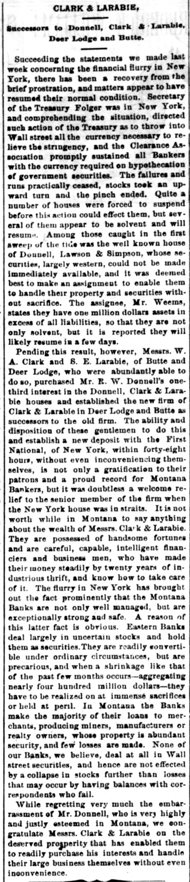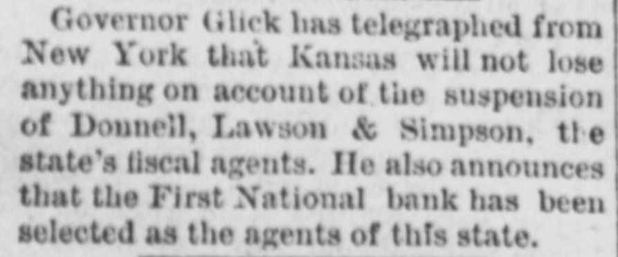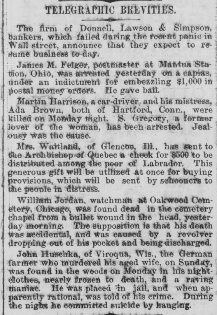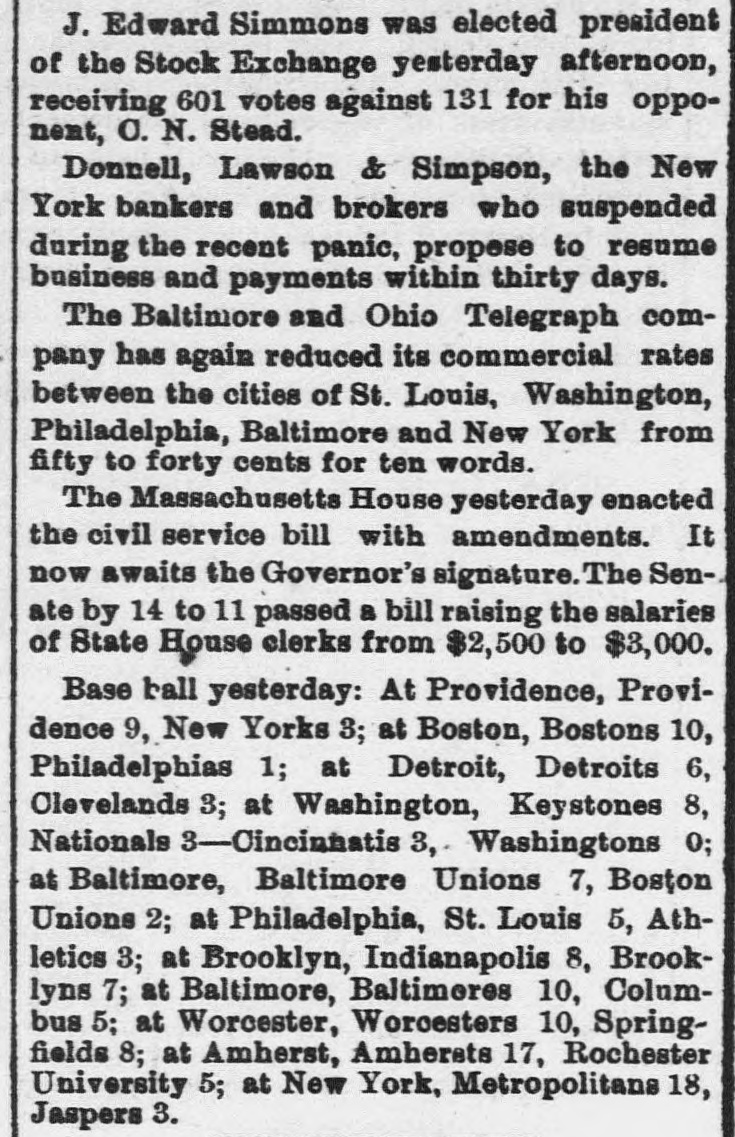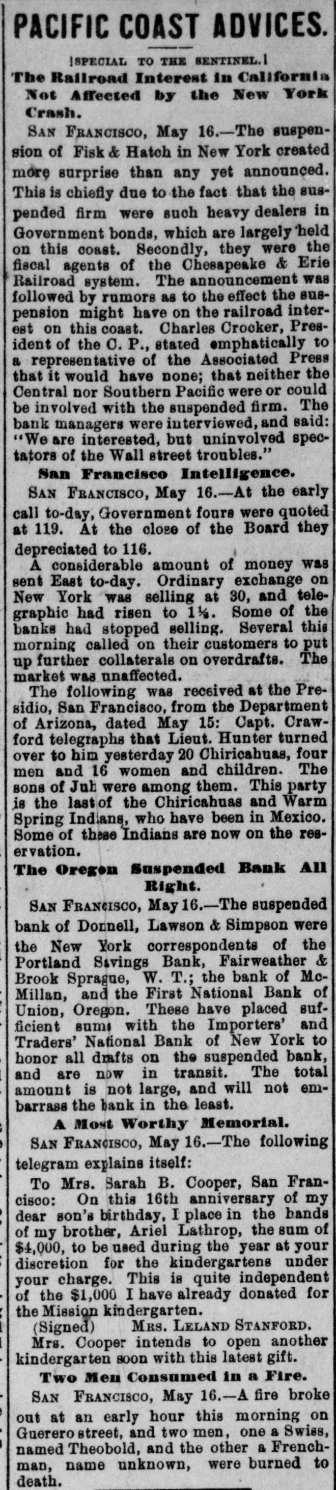 FROM ALL QUARTERS. A FINANCIAL CRASH. Disasters Falling Thick and Fast. WALL STREET IN A PANIC. Many Firms Caught in the Whirl. A RAPID ROUND OF FAILURES. The Day a Second Black Friday. A WALL STREET CRASH. A Paule on Change- Failures Fellow Each Other in Rapid Succession-Old Houses Caught 1a the Whirl-Philanthropist Seney Among the NumberBank Closes its Doors The Story of a Day That Was Another Black Friday NEW YORK, May 14.-The financial complications of the past week resulted to-day in a succession of disasters that made the wildest havoc in Wall street. The announcement of failures began with the opening of the Stock Exchange and succeeded each other rapidly, each new disaster adding to the panicky feeling which manifested itself in all directions. The first failures published were those of Nelson Rebinson & Co. and Goffe & Randle. Soen afterward it was known that O. M. Bogart & Co. had suspended. This announcement was soon followed by the suspersion of J. C. Williams. The excitement was greatly intensified when it was first whis pered that Hatch & Foote had been compelled to cease business, and almost immediately afterwards it was rumored that the Metropolitan bank had closed its doors. This Fumor was premature, but it was not long before it became fact and the doors of the bank were actually shuf. The street was wild with excitement and it seemed that another black Friday had cast its bale ful light upon the financial horizon. Men and boys were rushing about, forcing their ways through the crewds that stood wedged in the streets about the Exchange. The news of the disasters seemed to have spread with wonderful rapidity. Private carriages, with liveried servants, from the up-town districts WERE SEEN FLYING THROUGH THE STREETS, and many stood outside the doors of the various banks and banking-houses The directors of nearly all the banks were either in session or present in their buildings ready for any emergency. The doors of the Stock Exchange were guarded by policemen and the visitors' galleries were cleared. No one was admitted to the building except members, clerks, and messengers. This was done because the crowd endeavoring to get admits tance grew too large for the capacity of the building. THE FIRST FAILURE OF THE DAY, that of Nelson Robinson & Ce., wascaused, according to the statement of Mr. Robinson, by the general shrinkage of securities, the disturbed condition of the times, and the circulation of disquieting rumors. He was unable to furnish any statement of liabilities and assets. Most of their loans, he said, were well protected, if the holders did not lose their heads and want to get their money in day. Mr. Randall, of Goffe & Randall, said their failure was due mainly to the troubles of Dyett & Co. Orlando M. Bogart, of O. M. Bogart & Co., said their suspension was due to the indirect influence of the Grant & Ward failure, the shrinkage in 80curities, the many calls on the firm for mon losses through outside parties. The firm simply unable to withstand the general pressure upon it. He could not make any statement of assets and liabilities, but he knew that the present condition of affairs was bad. The firm had been established, he said, for at least twenty five years Tb assignee, Mr. Wheeler, said that he had unex pectedly been called to his position, which he bad accepted reluctantly, and that he was un able to give any information as yet in regard to the firm's affairs. Bogart & Co. give preferences for $55,000. THE SUSPENSION OF JOSEPH C. WILLIAMS was announced early in the day. He bad not been large speculator and the number of his creditors is probably small. THE FAILURE OF HATCH FOOTE caused great excitement, as the firm has long been prominent on the street Mr. Foote said the failure was due to the embarrassment caused by the shrinkage of securities, some of which belonged to the firm, while others were carried for customers. The firm made an assignment to Henry W. Reighley, and the liabilities are thought to amount to half million. But the greatest sensation of the day came when the news was announced that THE METROPOLITAN BANK HAD SUSPENDED. The first news came that the suspension had been ordered by Mr. Seney, the president, in order to prevent run for which the bank might not be prepared. The failure is generally supposed to be due to the railroad speculations of President Seney. The bank owes the clearing house $500,000. AT THE MEETING OF BANK PRESIDENTS this afternoon a committee was appointed to examine the assets of the Metropolitan The bank and ascertain its actual position. committee was instructed to assure the bank tust if the examination proved satisfactory the associated banks would do all in their power to allow the Metropolitan to resume business The committee at once proceeded to the bank and began its nvestigation. The committee also adopted the following Resolved, That in view of the present crisis the banks of the Clearing House assooi ation, for the parpose of sustaining each other, do appoint committee of five to receive from the banks members of the association bills receivable or other securities to be appropriated by said committee, who shall be authorized to issue therefor to such depositing banks loan certificates bearing interest at six per cent. per annum, not in excess of seventy -five per cent. of seou: rities or bills receivable 80 deposited except in the case of United States bonds, and said certificates shall be rece in settlement of balances at the clearing house THIS ACTION HAD GOOD EFFECT on the street. perintendent Camp, of the clearing house, said to reporter: "In 1878 we made the fatal mistake of not appointing a committee on the first day. Deferring action was disastrous. hope this trouble will be over to-morrow and we are doing our best to end it." It is agreed by all that the scenes of excitement in and around the Exchange to day equalled those of 1873. In the midst of the panic, however, few cool headed "old stagers" 