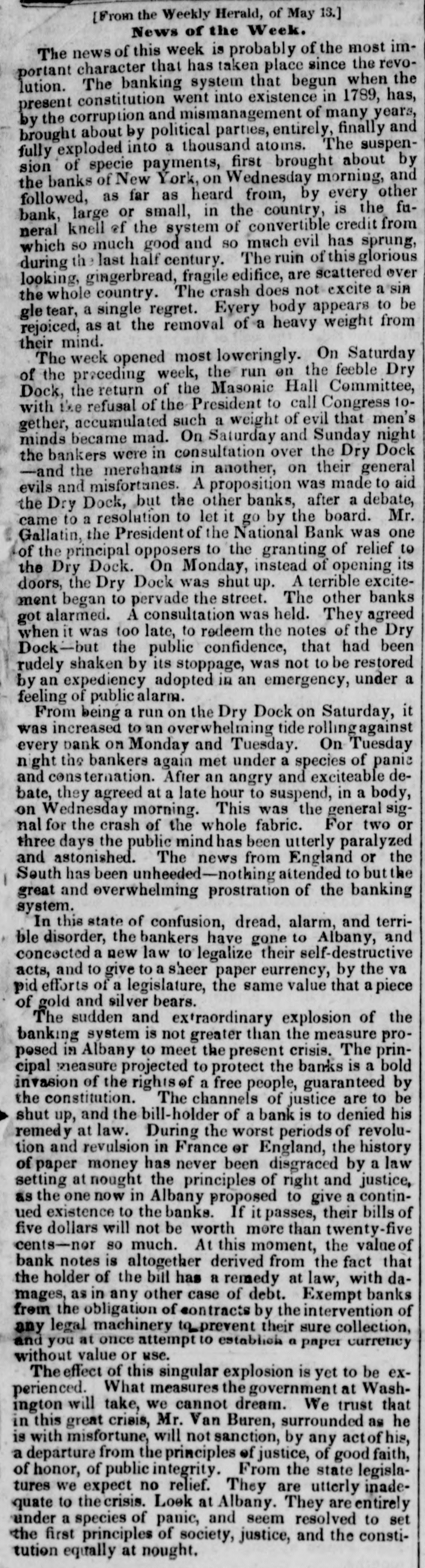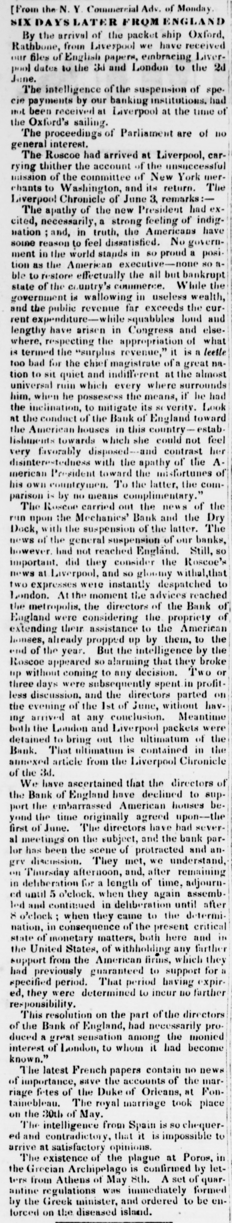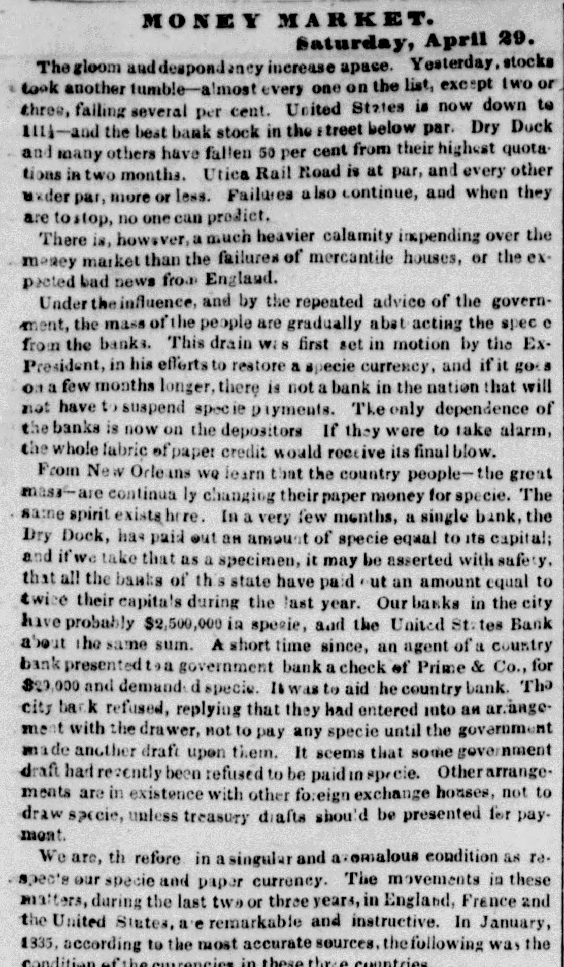 MONEY MARKE T. Saturday, April 29. The gloom and despondancy increase apace. Yesterday, stocks took another lumble-almost every one on the list, except two or three, failing several per cent. United States is now down to 1111-and the best bank stock in the street below par. Dry Dock and many others have fallen 50 per cent from their highest quota tions in two months. Utica Rail Road is at par, and every other under par, more or less. Failures also continue, and when they are tostop, no one can predict. There is, however, a much heavier calamity inepending over the money market than the failures of mercantile houses, or the expected bad news from England. Under the influence, and by the repeated advice of the government, the mass of the people are gradually abat acting the spec e from the banks. This drain was first set in motion by the ExPresident, in his efferts to restore a specie currency, and if it go on a few months longer, there is not a bank in the nation that will not have to suspend specie payments. The only dependence of the banks is now on the depositors If they were to take alarm, the whole fabric of paper credit would receive its final blow. From New Orle ins we learn that the country people- great mass-are continua ly changing their paper money for specie. The same spirit exists here. In a very few months, a single bank, the Dry Dock, has paid out an amount of specie equal to its capital; and if We take that as a specimen, it may be asserted with safety, that all the banks of this state have paid out an amount equal to twice their capita's during the last year. Our banks in the city have probably $2,500,000 in specie, and the United St. tes Bank about the same sum. A short time since, an agent of a country bank presented to a government bank a check of Prime & Co., for $23,000 and demand d specie. It was to aid he country bank. Th city back refused, replying that they had entered into an ar. angement with the drawer, not to pay any specie until the government made another draft upon tiem. It seems that some government draft had recently been refused to be paid 10 specie. Other rarrangemeats are in existence with other fo: eign exchange houses, not to draw specie, unless treasury diafts shou'd be presented for paymont. We are, th refore in a singular and a. emalous condition as respecial our specie and paper currency. The movements in these matters, during the last two or three years, in England, France and the United States, a'e remarkable and instructive. In January, 1335, according to the most accurate sources, the following was the in