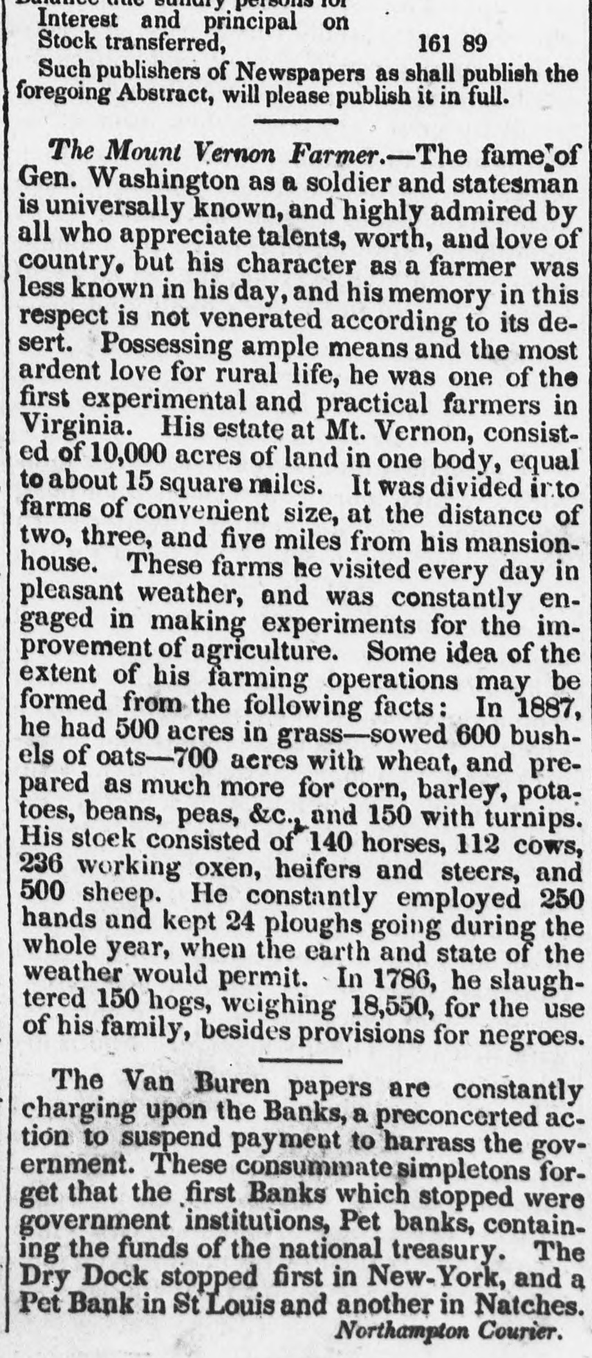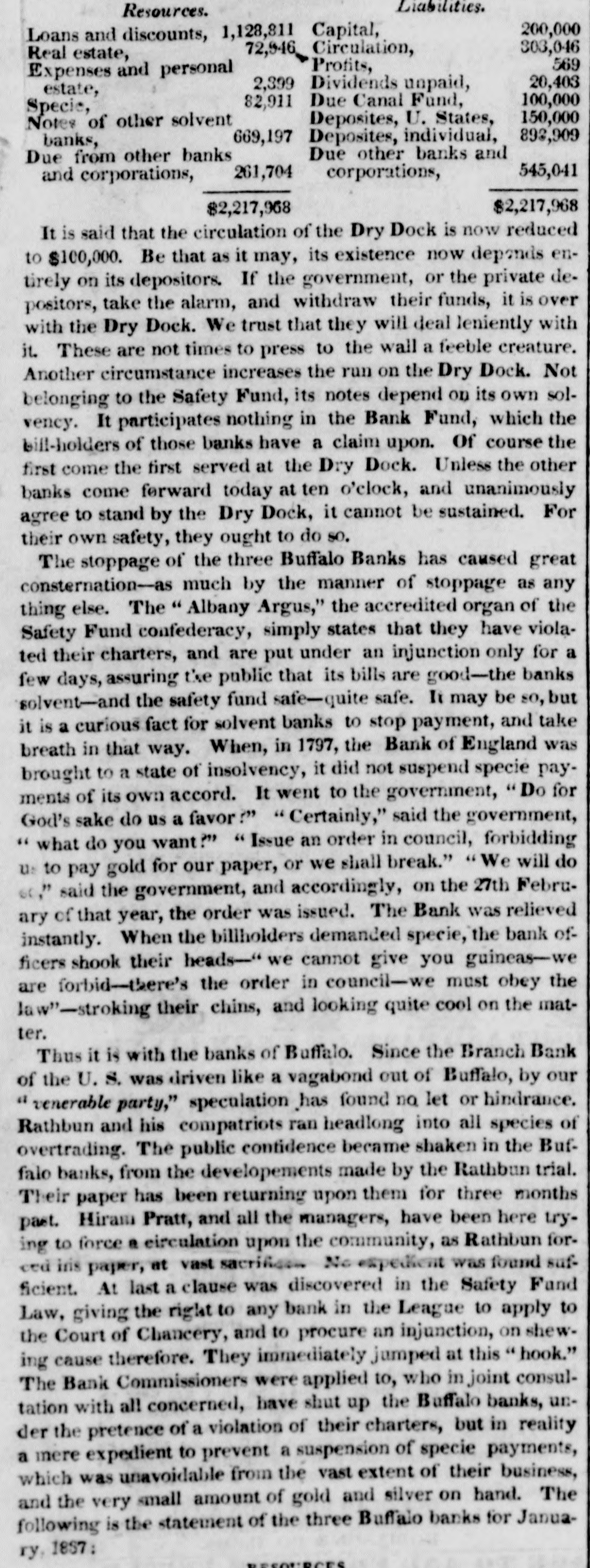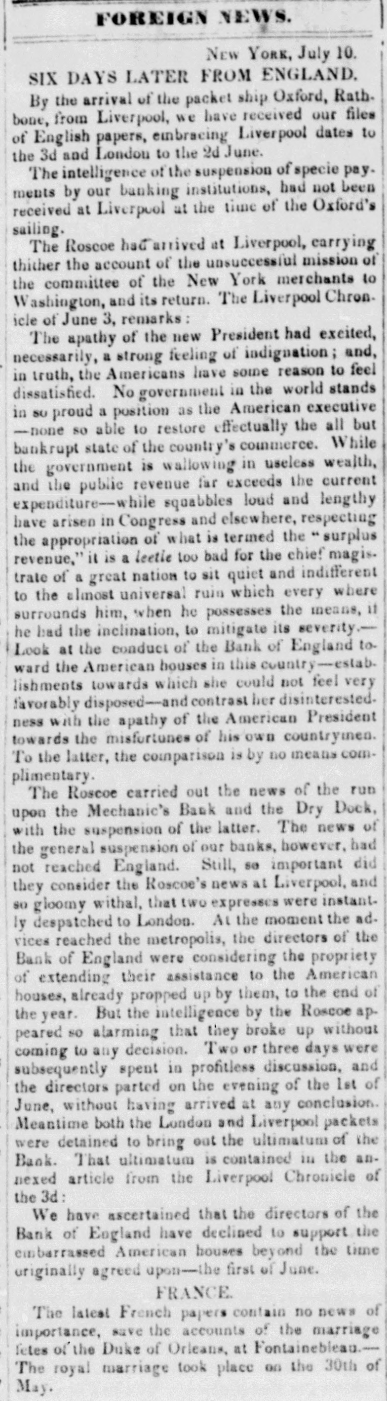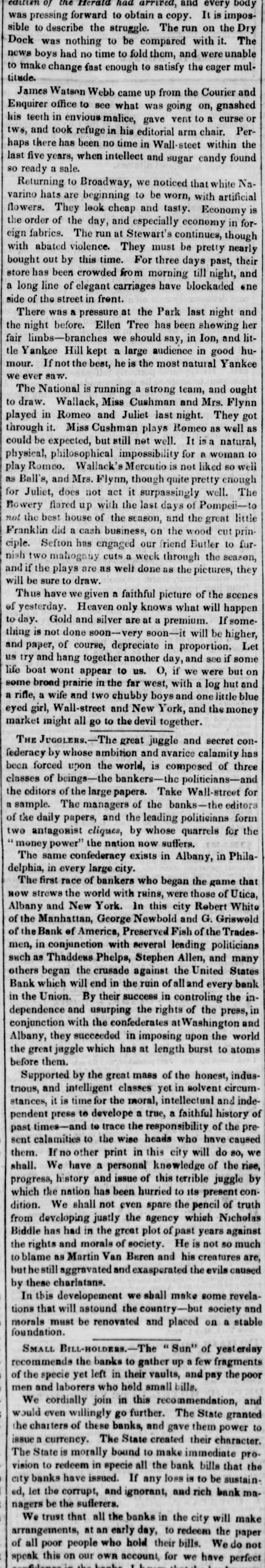 MONEY MARKE T. Saturday, April 29. The gloom and despondancy increase apace. Yesterday, stocks took another lumble-almost every one on the list, except two or three, failing several per cent. United States is now down to 1111-and the best bank stock in the street below par. Dry Dock and many others have fallen 50 per cent from their highest quota tions in two months. Utica Rail Road is at par, and every other under par, more or less. Failures also continue, and when they are tostop, no one can predict. There is, however, a much heavier calamity inepending over the money market than the failures of mercantile houses, or the expected bad news from England. Under the influence, and by the repeated advice of the government, the mass of the people are gradually abat acting the spec e from the banks. This drain was first set in motion by the ExPresident, in his efferts to restore a specie currency, and if it go on a few months longer, there is not a bank in the nation that will not have to suspend specie payments. The only dependence of the banks is now on the depositors If they were to take alarm, the whole fabric of paper credit would receive its final blow. From New Orle ins we learn that the country people- great mass-are continua ly changing their paper money for specie. The same spirit exists here. In a very few months, a single bank, the Dry Dock, has paid out an amount of specie equal to its capital; and if We take that as a specimen, it may be asserted with safety, that all the banks of this state have paid out an amount equal to twice their capita's during the last year. Our banks in the city have probably $2,500,000 in specie, and the United St. tes Bank about the same sum. A short time since, an agent of a country bank presented to a government bank a check of Prime & Co., for $23,000 and demand d specie. It was to aid he country bank. Th city back refused, replying that they had entered into an ar. angement with the drawer, not to pay any specie until the government made another draft upon tiem. It seems that some government draft had recently been refused to be paid 10 specie. Other rarrangemeats are in existence with other fo: eign exchange houses, not to draw specie, unless treasury diafts shou'd be presented for paymont. We are, th refore in a singular and a. emalous condition as respecial our specie and paper currency. The movements in these matters, during the last two or three years, in England, France and the United States, a'e remarkable and instructive. In January, 1335, according to the most accurate sources, the following was the in