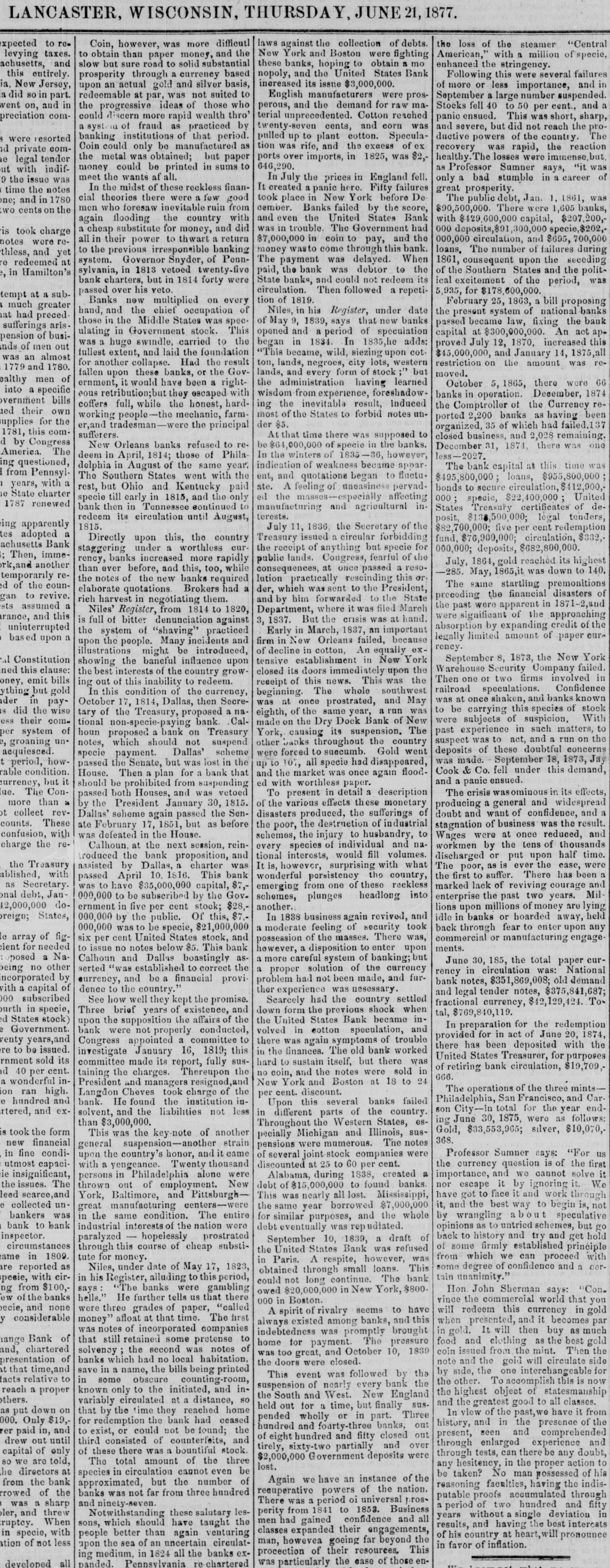 LANCASTER, WISCONSIN, THURSDAY, JUNE 21, 1877. laws against the collection of debts. expected to re. Coin, however, was more difficutl the loss of the steamer "Central levying taxes. to obtain than paper money, and the New York and Boston were fighting American," with a million of specie, slow but sure road to solid substantial achusetts, and these banks, hoping to obtain a mo enhanced the stringency. nopoly, and the United States Bank Following this were several failures this entirely. prosperity through a currency based increased its issue $3,000,000. ia, New Jersey, upon actual gold and silver basis, of more or less importance, and in redeemable at par, was not suited to la did so in part. English manufacturers were prosSeptember a large number suspended. went on, and in perous, and the demand for raw mathe progressive ideas of those who Stocks fell 40 to 50 per cent., and terial unprecedented. Cotton reached could discern more rapid wealth thro' preciation companic ensued. This short, sharp, twenty-seven cents, and corn was system of fraud as practiced by and severe, but did not reach the propulled up to plant cotton. Speculabanking institutions of that period. ductive powers of the country. The s were resorted tion was rife, and the excess of ex Coin could only be manufactured as recovery was rapid, the reaction d private comhealthy. The losses were immense,but ports over imports, in 1825, was $2, the metal was obtained; but paper e legal tender 646,290. money could be printed in sums ut with indifas Professor Sumner says, "it was meet the wants af all. only a bad stumble in a career of In July the prices in England fell, 9 the issue was In the midst of these reckless finanIt created a panic here. Fifty failures time the notes great prosperity. took place in New York before De cial theories there were a few good The public debt, Jan. 1, 1861, was one; and in 1780 men who foresaw inevitable.ru from $90,500,000. There were 1,605 banks, cember. Banks failed by the score, two cents on the and even the United States Bank again flooding the country with with $429,600,000 capital, $207,200,was in trouble. The Government had 000 deposits,$91,300,000 cheap substitute for money, and did is took charge $7,000,000 in coin to pay, and the 000,000 circulation, and $695, 700,000 all in their power to thwart a return notes were remoney wast come through this bank. loans, The number of failures during to the previous irresponsible banking thless, and yet The payment was delayed. When system. Governor Snyder, of Penn1861, cousequent upon the seceding re redeemed at paid, bank was debtor to the sylvania, in 1813 vetoed twenty-five of the Southern States and the polite, in Hamilton's State banks, and could not redeem its bank charters, but in 1814 forty were ical excitement of the period, was passed over his veto. 5,935, for $178,600,000. circulation. Then followed a repetitempt at subtion of 1819. Banks now multiplied on every February 25, 1863, a bill proposing much greater Niles, in his Register, under date hand, and the chief occupation of the present system of national at had precedthose in the Middle States was spec. of May 9, 1839, says that new banks passed became law, fixing the bank sufferings aris. ulating in Government stock. This opened and a period of speculation capital at $300,000,000. An act ap. pension of busibegan in 1834. In 1835,he adds: was a huge swindle, carried to the proved July 12, 1870, increased this nds of men out fullest extent, and laid the foundation "This became, wild, siezing upon cot $45,000,000, and January 14, 1875,all was an almost restriction on the amount was refor another collapse. Had the result ton, lands, negroes, city lots, western 1779 and 1780, lands, and every form of stock :" but fallen upon these banks, or the Govmoved. ealthy men of ernment, it would have been a rightthe administration having learned October 5, 1865, there were 66 into a specific wisdom from experience, foreshadoweous retribution;but they escaped with banks in operation. December, 1874 overnment bills ing the inevitable result, induced coffers full, while the honest, hardthe Comptroller of the Currency reed their own most of the States to forbid notes unworking people-the mechanic, farmported 2,200 banks as having been supplies for the der $5. organized, 35 of which had failed.137 er,and tradesman-were the principal 1781, this comsufferers. At that time there was supposed to closed business, and 2,028 remaining. d by Congress New Orleans banks refused to rebe $64,000,000 of specie in the banks. December 31, 1874, there was America. The less--2027. In the winters of 1835-36, however, deem in April, 1814; those of Phila ing questioned, indication of weakness became appardelphia in August of the same year. The bank capital at this time from PennsylThe Southern States went with the ent, and quotations began to fluctu. $495,800,000; loans, $955,800,000 I years, with a ate. A feeling of uneasiness pervadbonds to secure circulation, $412,900, rest, but Ohio and Kentucky paid e State charter specie till early in 1815, and the only ed the masses--especially affecting 000; specie, $22,400,000 United 1787 renewed bank then in Tennessee continued to States Treasury certificates of demanufacturing and agricultural in terests. posit, $130,500,000; legal tenders, redeem its circulation until August, ing apparently 1815. July 11, 1836, the Secretary of the $82,700,000; five per cent redemption tes adopted a fund,$76,900,000; circulation, $332, Directly upon this, the country Treasury issued a circular forbidding achusetts Bank staggering under a worthless curthe receipt of anything but specie for 000,000; deposits, $682,800,000. ; Then, immepublic land Congress, fearful of the rency, banks increased more rapidly July, 1864, gold reached its highest rk,and another consequences, at once passed a resothan ever before, and this, too, while -285. May, 1865,it was down to 140. temporarily relution practica