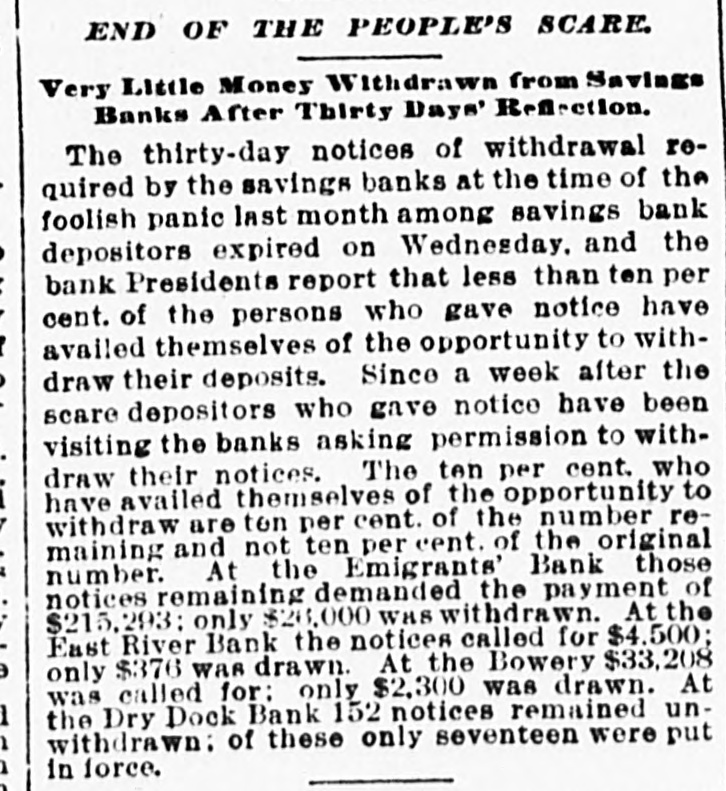 END OF THE PEOPLE'S SCARE. Very Little Money Withdrawn from Savings Banks After Thirty Days' Reflection. The thirty-day notices of withdrawal required by the savings banks at the time of the foolish panic last month among savings bank depositors expired on Wednesday. and the bank Presidents report that less than ten per cent. of the persons who gave notice have availed themselves of the opportunity to withdraw their deposits. Since a week after the scare depositors who gave notice have been visiting the banks asking permission to withdraw their notices. The ten per cent. who have availed themselves of the opportunity to withdraw are ten per cent. of the number remaining and not ten per cent. of the original number. At the Emigrants' Bank those notices remaining demanded the payment of $215,293: only $26,000 WAS withdrawn. At the East River Bank the notices called for $4.500; only $376 was drawn. At the Bowery $33,208 was called for: only $2,300 was drawn. At the Dry Dock Bank 152 notices remained unwithdrawn: of these only seventeen were put in force.