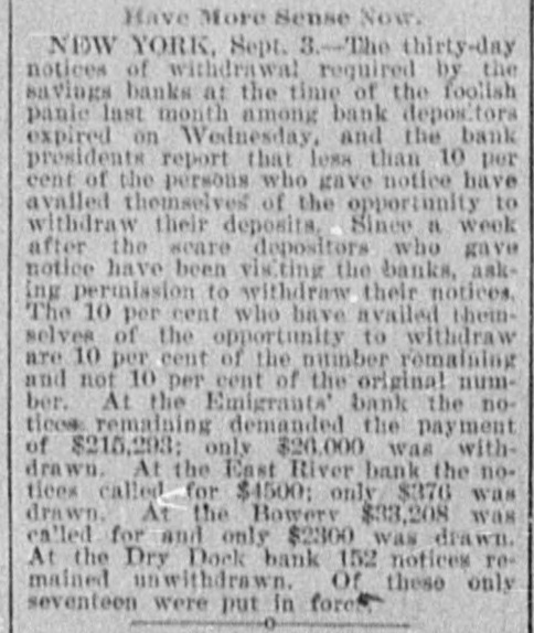 Have More Sense Now. NEW YORK, Sept. 3.-The thirty-day notices of withdrawal required by the savings banks at the time of the foolish panic last month among bank depositors expired on Wednesday, and the bank presidents report that less than 10 per cent of the persons who gave notice have availed themselves of the opportunity to withdraw their deposits, Since a week after the scare depositors who gave notice have been visiting the banks, asking permission to withdraw their notices. The 10 per cent who have availed themselves of the opportunity to withdraw are 10 per cent of the number remaining and not 10 per cent of the original number. At the Emigrants' bank the notices remaining demanded the payment of $215,293; only $20,000 was withdrawn. At the East River bank the notices called for $4500; only $376 was drawn. At the Bowerv $33,208 was called for and only $2300 was drawn. At the Dry Dock bank 152 notices remained unwithdrawn. Of these only seventeen were put in force.