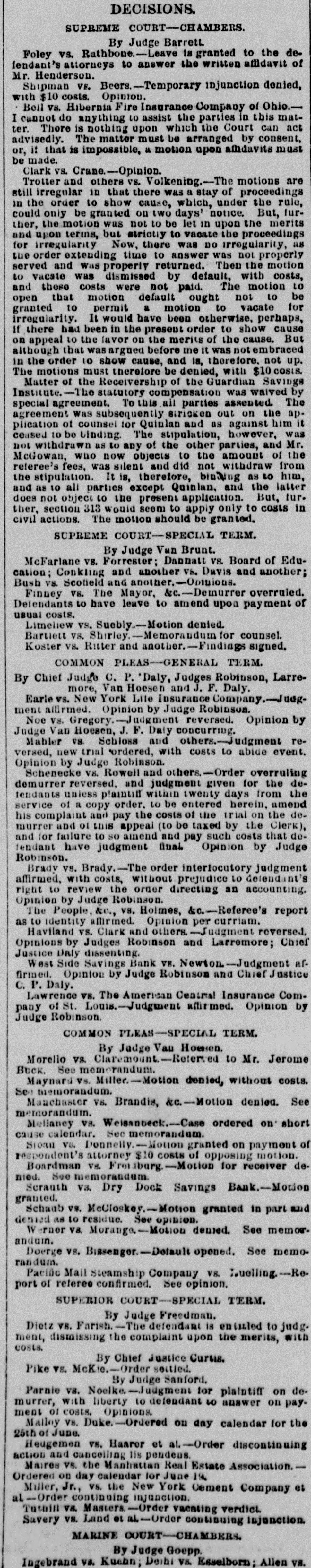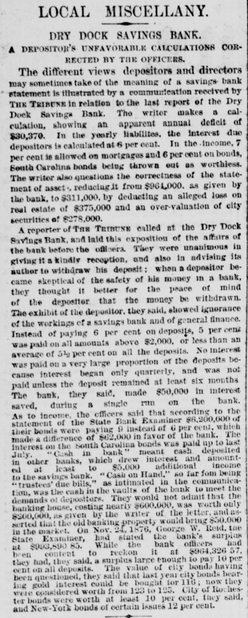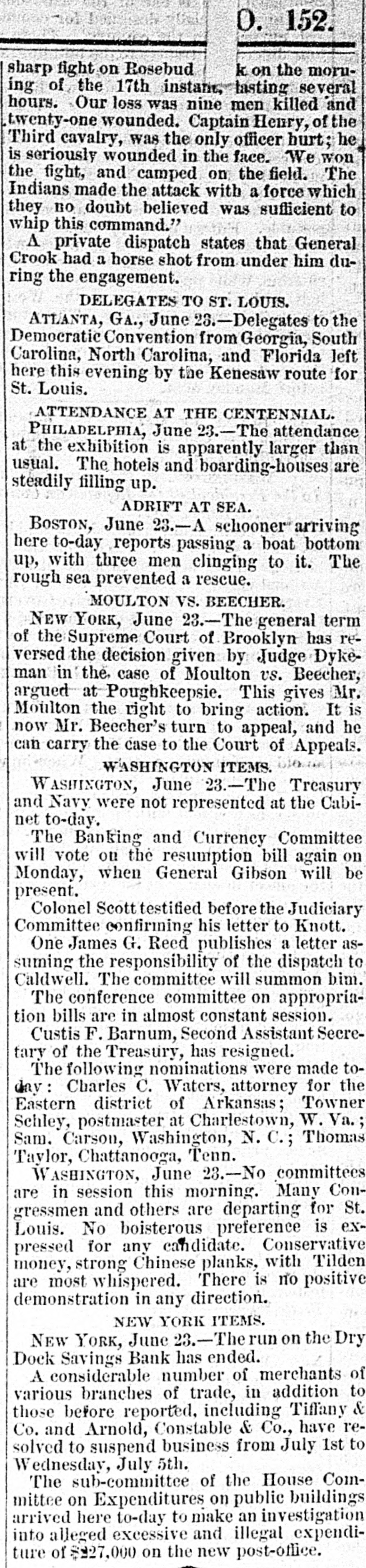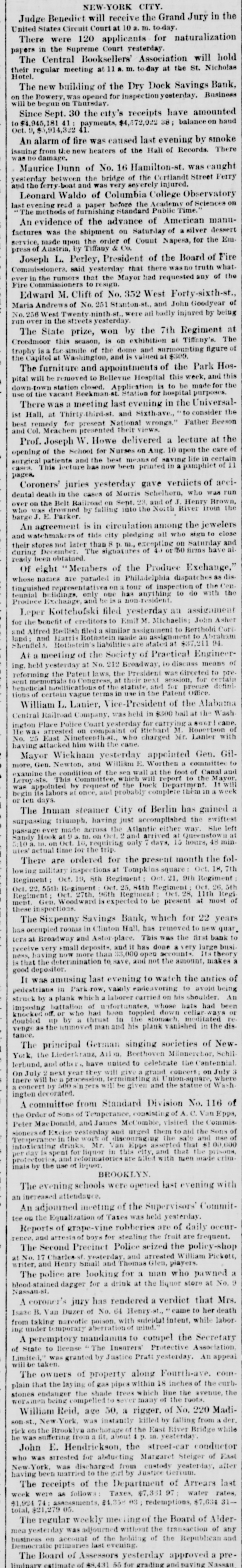 NEW-YORK CITY. Judge Benedict will receive the Grand Jury in the United States Circuit Court at 10 a. m. to-day. There were 120 applicants for naturalization papers in the Supreme Court yesterday. The Central Booksellers' Association will hold their regular meeting at 11 a. m. to-day at the St. Nichola Hotel. The new building of the Dry Dock Savings Bank on the Bowery, was opened for inspection yesterday. Business will be began on Thursday. Since Sept. 30 the city's receipts have amounted to $4,945,181 41: payments, $4,572,022 38; balance on hand Oct. 9, $5,914,322 41. An alarm of fire was caused last evening by smoke issuing from the new heaters of the Hall of Records. There was no damage. Maurice Dunn of No. 16 Hamilton-st. was caught yesterday between the bridge of the Cortlandt Street Ferry and the ferry and was very severely injured. Leonard Waldo of Columbia College Observatory last evening read a paper before the Academy of Sciences or The methods of furnishing Standard Public Time. An evidence of the advance of American manu factures was the shipment on Saturday of a silver desser service, made upon the order of Count Napesa, for the Em press of Austria, by Tiffany & Co. Joseph L. Perley, President of the Board of Fire Commissioners. said yesterday that there wasno truth what ever in the rumors that the Mayor had requested any of the Fire Commissioners to resign. Edward M. Clift of No. 352 West Forty-sixth-st. Maria Andrews of No. 251 Stanton-st., and John Goodyear o No. 256 West Twenty ninth-st., were all badly injured by being run over in the streets yesterday. The State prize, won by the 7th Regiment at Creedmoor this season, is on exhibition at Tiffany's. The trophy is: fac simile of the dome and surmounting figure the Capitol at Washington, and is valued at $300. The furniture and appointments of the Park Hos pital will be removed to Bellevue Hospital this week, and this down town station closed. Application is to be made for the use of the vacant Beekman st. Station for hospital purposes. There was a meeting last evening in the Universal ist Hall, at Thirty third-st. and Sixth-ave., consider the best remedy for present National wrongs." Father Beesor and Col. Meachem presented their views. Prof. Joseph W. Howe delivered a lecture at the opening of the School for Nurses on Aug. 10 upon the care o surgical patients and the best means of saving life in certain cases. This lecture has now been printed in a pamphiet of pages. Coroners' juries yesterday gave verdicts of acci dental death in the cases of Morris Schelhorn, who was rur over on the Belt Railroad on Sept. 23 and of J. Henry Brown who was drowned by falling into the North River irom the barge J.E. Parker. An agreement is in circulation among the jeweler and watchmakers of this city pledging all who sign to close their stores not later than 8p. m., excepting on Saturday and during December. The signatures of 4.) or 50 firms have al ready been obtained. Of eight Members of the Produce Exchange,' whose names are paraded in Philadelphia dispatch as dis tinguished representatives on a tour of inspection of the Cen tennial didings, only one has anything to do with the Produce Exchange, and he a non resident. Leper Kottchofski filed yesterday an assignment for the benefit of creditors to Emil M. Michaelis; John Ashe and Alfred Redlish filed a similar assignment to Berthold Cort land and Harris Rothstein made an assignment to Abrahan Shenfield. Rothstein liabilities are stated at $37,211 94. At a meeting of the Society of Practical Engineer ing. held yesterday at No. 212 Broadway, to discuss means o reforming the Patent laws. the President was directed to pre sent memorials to Congress, at their next session, for certain beneficial modifications of the statute and for precise defini tions of certain vague terms in use in the Patent Office. William L. Lanier, Vice-President of the Alabama Central Railroad Company, was in $300 bail at the ash ington Place Police Coart yesterday for carrying a swor cane He was arrested on complaint of Richard M. Rooertson No. 25 East Nineteenth-st., who charged Mr. Lanier with having attacked him with the cane. Mayor Wickham yesterday appointed Gen. Gil more, Gen. Newton, and William E. Worthen a committee to examine the condition of the sea wall at the foot of Canal an Leroy sts. This Committee, which will report to the Mayor was appointed by request of the Dock Department It wil begin its labors at once, and probably complete them in a weel or ten days. The Inman steamer City of Berlin has gained surpassing triumph, having just accomplished the swiftes passage ever made across the Atlantic either way. She lef Sandy Hook at a. m. on Oct. 2 and arrived at Queenstow 5:10 a. 111. on Oct. 10, requiring only days, 10 hours, 48 min utes' actual time for the trip. There are ordered for the present month the fol military inspections at Tompkins square Oct. 18, 70 Regiment; Oct. 19, 8th Regiment Oct. 21, 9th Regiment Oct. 22, 55th Regiment Oct. 25, 84th Regiment: Oct. 26. St Regiment; Oct. 27th. 96th Regiment Oct. 28, 11th Regi ment. Gen. Woodward is expected to be present at most 0 these inspections. The Sixpenny Savings Bank, which for 22 year has occupied rooms in Clinton Hall, has removed to new quar ters at Broadway and Astor-place. This was the bank t receive very small deposits, and it has done a very lurge busi ness, having now more than 33,000 open accounts. Its theor is that the determination to save, and not the amount, makes good depositor. It was amusing last evening to watch the anties o pedestriaus in Park-row, vainly endeavoring to avoid being struck by a plank which a laborer carried on his shoulder. A1 imposing battalion of infortunates, whose hats had beer knocked or who had been toppled down cellar ways doubled up by a thrust in the stomach meditated venge as the uninoved man and his plank vanished in the dis tance. The principal German singing societies of New York, the Liederkranz, 