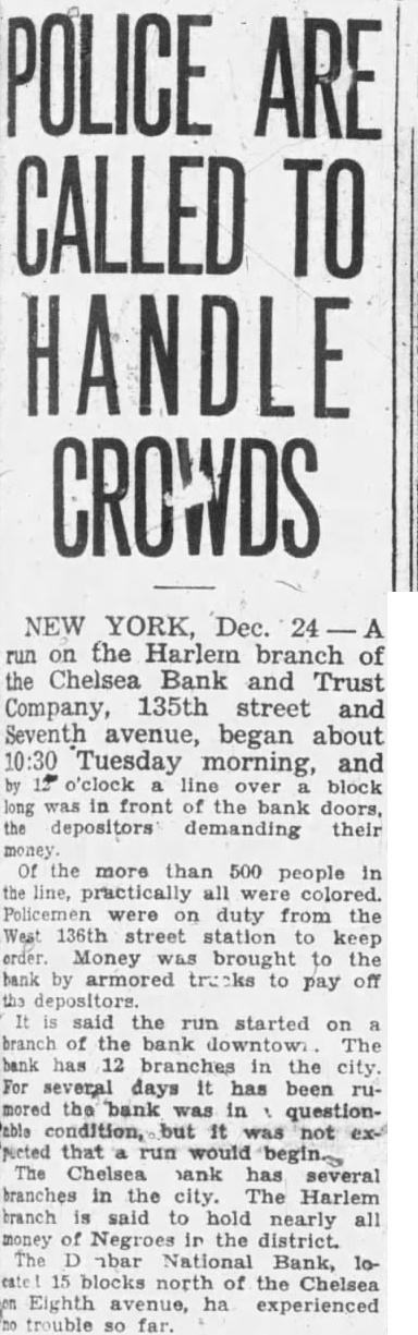 POLICE ARE CALLED TO HANDLE CROWDS NEW YORK, Dec. 24 run on the Harlem branch of the Chelsea Bank and Trust Company, 135th street and Seventh avenue, began about 10:30 Tuesday morning, and by 12 o'clock line over a block long was in front of the bank doors, the depositors demanding their money. Of the more than 500 people in the line, practically all were colored. Policemen were on duty from the West 136th street station to keep order. Money was brought to the bank by armored trucks to pay off the depositors. It is said the run started on a branch of the bank downtown The bank has 12 branches in the city. For several days It has been rumored the bank was in questionable condition, but it was not expicted that a run would begin. The Chelsea bank has several branches in the city. The Harlem branch is said to hold nearly all money of Negroes in the district. The D nbar National Bank, locate! 15 blocks north of the Chelsea Eighth avenue, ha experienced trouble so far.