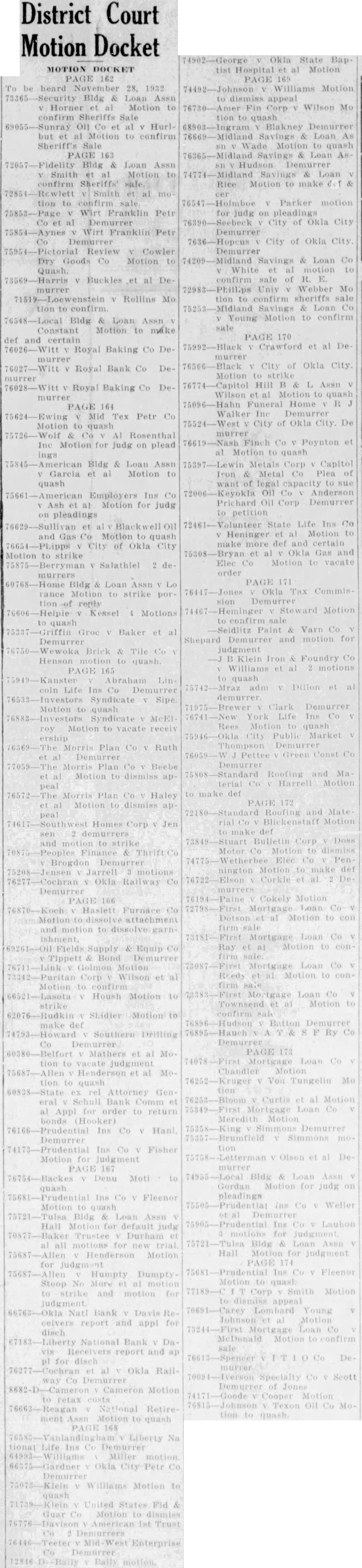 District Court Motion Docket MOTION DOCKET PAGE 162 To be heard November 28, 1932 73365- Security Bldg & Loan Assn Horner et al Motion to confirm Sheriffs Sale but et al Motion to confirm Sheriff's Sale PAGE 163 Bldg & Loan Assn Smith et Motion to confirm Sheriffs' sale. Smith et al mo to confirm sale Wirt Franklin Petr al Demurrer Wirt Franklin Petr Demurrer Review Cowler Dry Goods Co Motion to Quash. Harris Buckles et al Demurrer 1519-Loewenstein Rollins Mo tion to confirm. Local Bldg Loan Assn Constant Motion to make and certain 76026-Witt Royal Baking Co Demurrer Royal Bank Co De76028-Witt Royal Baking Co De- PAGE 164 Ewing Mid Tex Petr Co Motion to quash Wolf Al Rosenthal Inc Motion for judg on plead ings Bldg & Loan Assn Garcia et al Motion to quash Employers Ins Co Ash Motion for judg on pleadings and Gas Co Motion to quash Phipps City of Okla City Motion to strike Salathiel demurrers Bldg Loan Assn Lo rance Motion to strike por tion of reply Heiple Kessel Motions quash 75337-Griffin Groc Baker et al Demurrer Wewoka Brick Tile Co Henson motion to quash. PAGE 165 Kanster Abraham Lin Ins Co Investors Syndicate Sipe. Motion quash Motion to vacate receiv ership Morris Plan Co Ruth Demurrer The Morris Plan Co Beebe al Motion to dismiss appeal The Morris Plan Co Haley Motion to dismiss appeal Homes Corp Jen sen demurrers and Peoples Finance & Thrift Brogdon Demurrer Jarrell motions Cochran Okla Railway Co Demurrer 166 Koch Haslett Furnace Co attachment and motion to dissolve Fields Supply & Equip Co Tippett & Bond Demurrer Golmon Motion Corp Wilson et al Motion to confirm Housh Motion to strike 62076-Rudkin Shidler Motion to make def Co Mathers et al Mo. Henderson et al Mo. to quash rel Attorney Gen eral Schull Bank Comm et al Appl for order to return bonds (Hooker) Ins Co Hani, Demurrer Ins Co Fisher Motion PAGE 167 Denu Moti to 75681 Prudential Ins Co V Fleenor Motion quash Bldg Loan Assn Hall Motion for default judg Baker Trustee Durham all motions for new trial Henderson Motion for Humpty Dumpty Stoop to strike and motion for ceivers report and appl for disch Liberty National Bank V Davis Receivers report and ap pl for disch et al Okla Railway Co Demurrer Motion to retax Reagan National Retirement Assn Motion to quash PAGE 168 Liberty Na tional Life Ins Co Demurrer Williams Miller motion Okla City Petr Co Demurrer Williams Motion to quash United States Fld & Guar Co Motion American 1st Trust Demurrers Teeter Enterprise Demurrer Okla State Baptist Hospital et al Motion PAGE 169 Williams Motion dismiss appeal Fin Corp Wilson Mo to quash 68903-Ingram Blakney Demurrer Savings & Loan As Wade Motion to quash & Loan AsHudson 74774-Midland Savings Loan Rice Motion to make e Parker motion for judg on pleadings 6390 City of Okla City Demurrer 7636-Hopcus City of Okla City. Demurrer Midland Savings & Loan Co White al motion to confirm sale of R. Univ Webber Mo to confirm sheriffs sale Savings & Loan Co Young Motion to confirm sale PAGE 170 75992-Black Crawford et al Demurrer City of Okla City. Motion Capitol Hill L Assn Wilson Motion Funeral Home R J Walker Inc Demurrer City of Okla City. De murrer Finch Co Poynton et al Motion to quash Metals Corp Capitol Iron Metal Co Plea of want of legal capacity to sue 72006 Keyokla Oil Co Anderson Prichard Oil Corp Demurrer to petition Volunteer State Life Ins Co Heninger et al Motion to make def and certain et al Okla Gas and Elec Motion to vacate order PAGE 171 Okla Tax CommisDemurrer Steward Motion sale Seidlitz Paint & Varn Co Shepard Demurrer and motion for judgment Klein Iron & Foundry Co Williams et al motions quash Dillon et al Clark Demurrer York Life Ins Co Motion quash 75946 City Public Market Demurrer Pettee Green Const Demurrer Harrell Motion to make def PAGE 172 2180-Standard Roofing and Mate Blickenstaff Motion make def Stuart Bulletin Corp. Doss Motor Co Motion to dismiss 74775 Elec Co Pennington Motion to make def Corkle et De76194- Paine Cokely Motion Mortgage Co at Motion to con sale First Mortgage Loan Co Ray at Motion to conMortgage Loan Co Roedy et Motion to confirm tgage Loan Co Townsend Motion to confirm Hudson Demurrer First Mortgage Loan Co Chandler Motion Bloom Curtis et al Motion Mortgage Loan Co Meredith Motion Demurrer Simmons Letterman Olson et al 14955-Local Bldg & Loan Assn Gordan Motion for judg on pleadings Prudential ins Co Weller Prudential Ins Lauhon motions for judgment Tulsa Bldg Loan Assn V Hall Motion for judgment PAGE 174 75681 Prudential Ins Co Fleenor Motion quast 77189-C IT Corp Smith Motion appeal Carey Lombard Young Johnson Motion Mortgage Loan Co McDonald Motion to confirm sale Spencer IT Co De. murrer Iverson Specialty Co Scott Demurrer of Jones Goode Cooper Motion tion