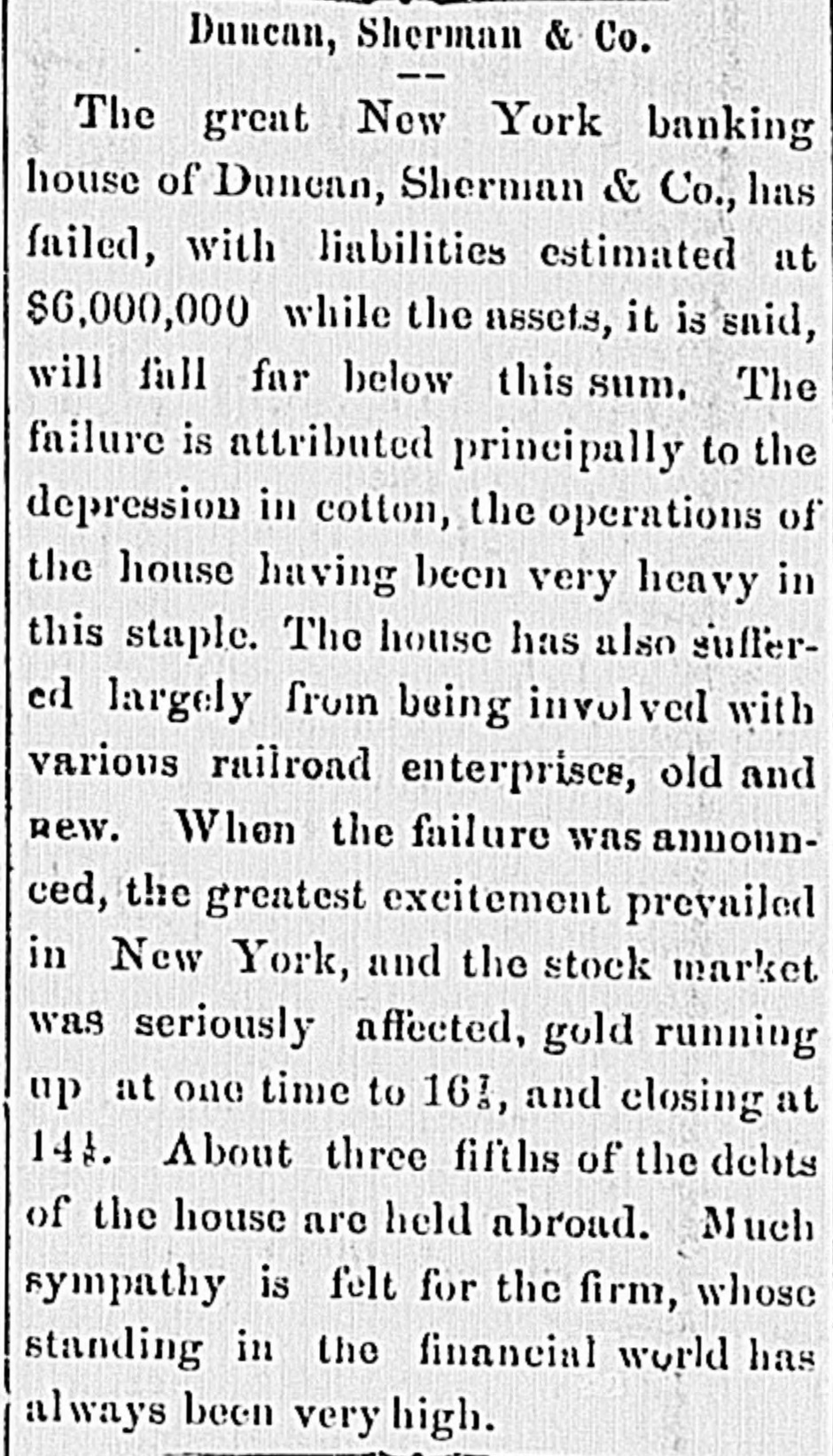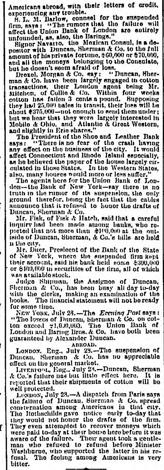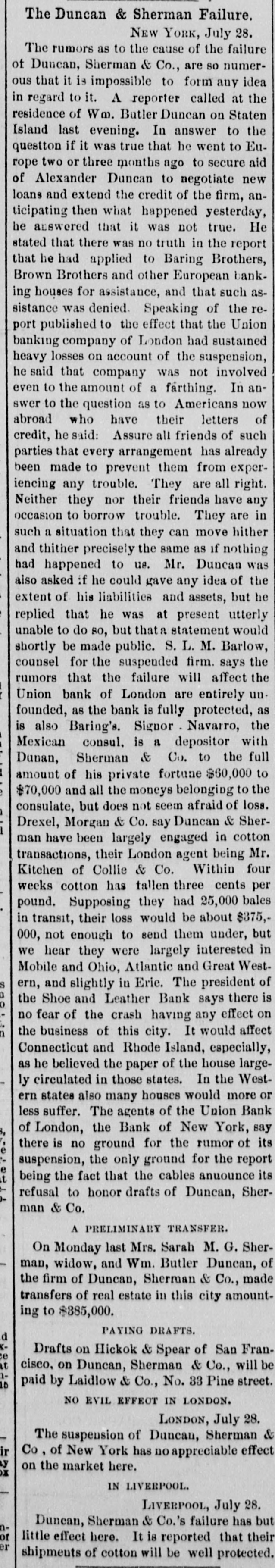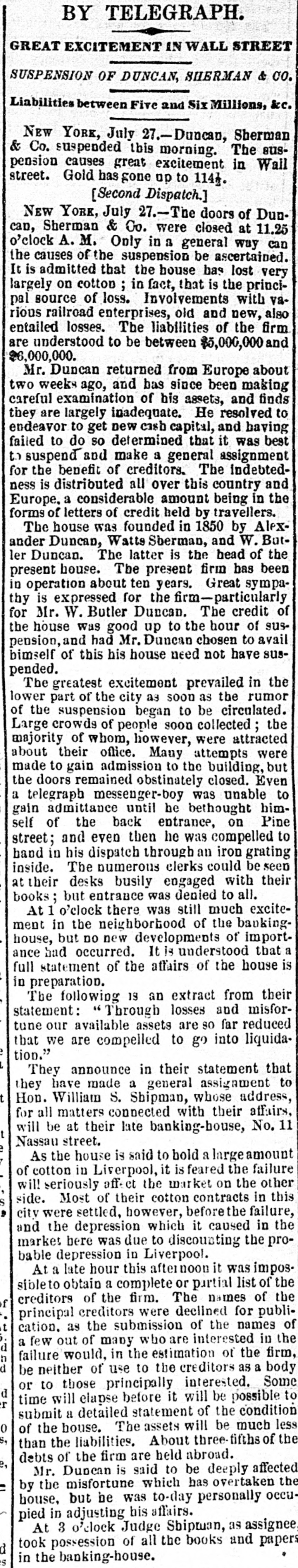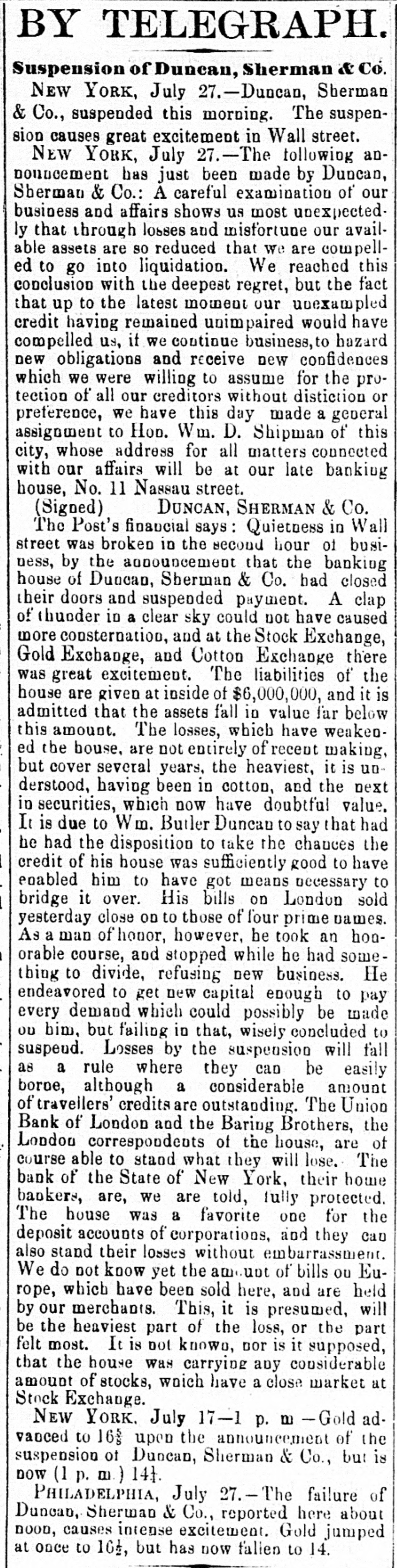 BY TELEGRAPH. Suspension of Duncan, Sherman & Co. NEW YORK, July 27.-Duncan, Sherman & Co., suspended this morning. The suspension causes great excitement in Wall street. NEW YORK, July 27.-The following annonncement has just been made by Duncan, Sherman & Co.: A careful examination of our business and affairs shows us most unexpectedly that through losses and misfortune our available assets are so reduced that we are compelled to go into liquidation. We reached this conclusion with the deepest regret, but the fact that up to the latest moment our unexampled credit having remained unimpaired would have compelled us, it we continue business, to hazard new obligations and receive new confidences which we were willing to assume for the protection of all our creditors without distiction or preference, we have this day made a general assignment to Hon. Wm. D. Shipman of this city, whose address for all matters connected with our affairs will be at our late banking house, No. 11 Nassau street. DUNCAN, SHERMAN & Co. (Signed) The Post's financial says: Quietness in Wall street was broken in the second hour of business, by the announcement that the banking house of Duncan, Sherman & Co. had closed their doors and suspended payment. A clap of thunder in a clear sky could not have caused more consternation, and at the Stock Exchange, Gold Exchange, and Cotton Exchange there was great excitement. The liabilities of the house are given at inside of $6,000,000, and it is admitted that the assets fall in value far below this amount. The losses, which have weakened the house, are not entirely of recent making, but cover several years, the heaviest, it is understood, having been in cotton, and the next in securities, which now have doubtful value. It is due to Wm. Butler Duncan to say that had he had the disposition to take the chances the credit of his house was sufficiently good to have enabled him to have got means necessary to bridge it over. His bills on London sold yesterday close on to those of four prime names. As a man of honor, however, he took an honorable course, and stopped while he had something to divide, refusing new business. He endeavored to get new capital enough to pay every demand which could possibly be made 00 bim, but failing in that, wisely concluded to suspend. Losses by the suspension will fall as a rule where they can be easily borne, although a considerable amount of travellers' credits are outstanding. The Union Bank of London and the Baring Brothers, the London correspondents of the house, are of course able to stand what they will lose. The bank of the State of New York, their home bankers, are, we are told, fully protected. The house was a favorite one for the deposit accounts of corporations, and they Can also stand their losses without embarrassment. We do not know yet the amount of bills ou Europe, which have been sold here, and are held by our merchants. This, it is presumed, will be the heaviest part of the loss, or the part felt most. It is not known, nor is it supposed, that the house was carrying any considerable amount of stocks, which have a close market at Stock Exchange. NEW YORK. July 17-1 p. m -Gold advanced to 16: upen the announcement of the suspension of Duncan, Sherman & Co., but is now (1 p. m.) 14}. PHILADELPHIA, July The failure of Duncan, Sherman & Co., reported here about noon, causes intense excitement. Gold jumped at once to 10±, but has now fallen to 14.