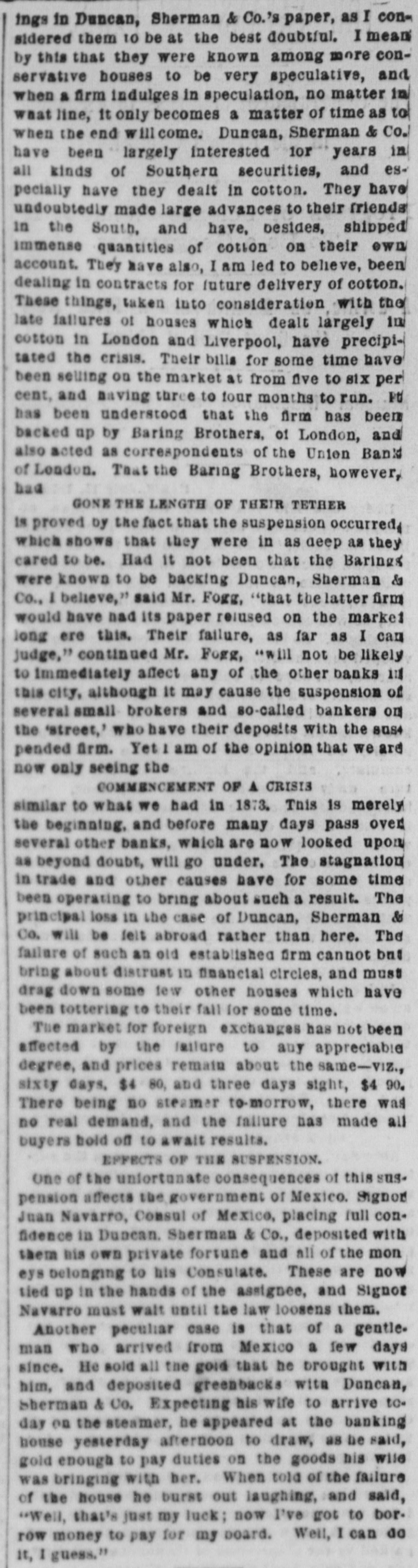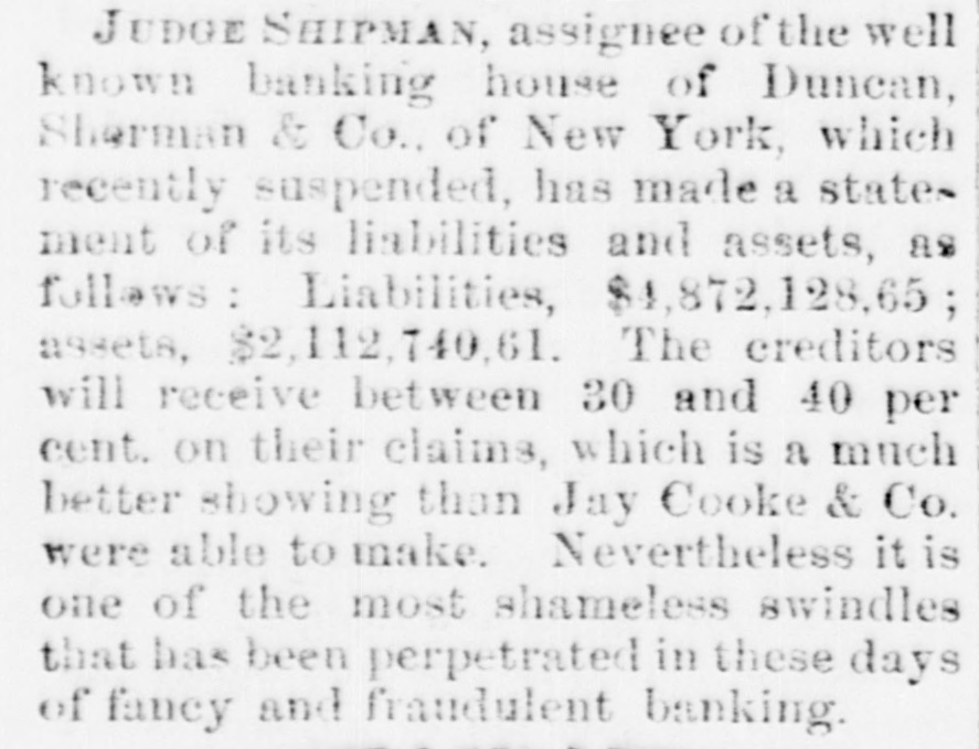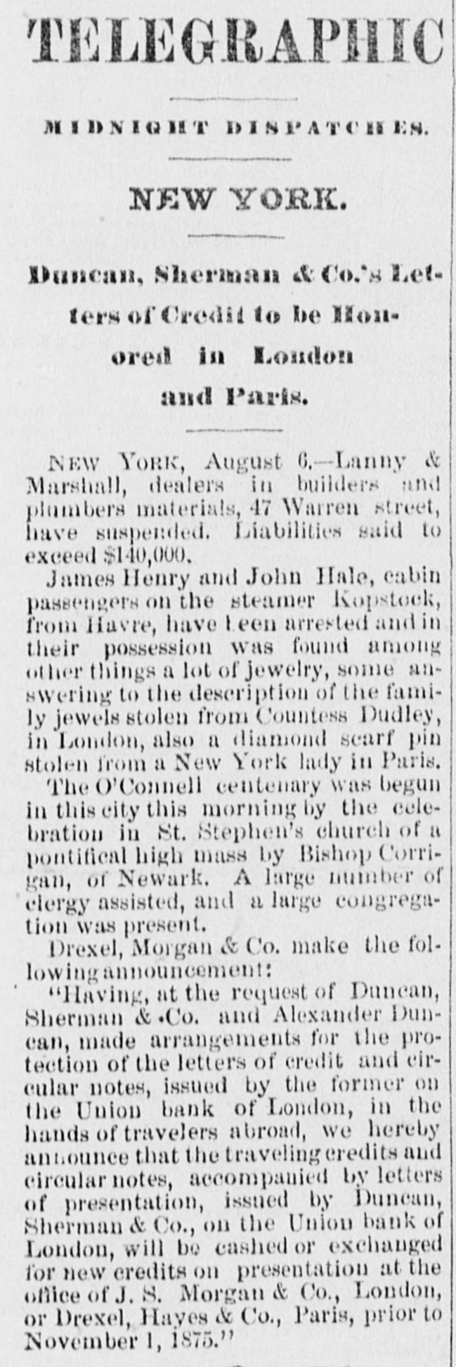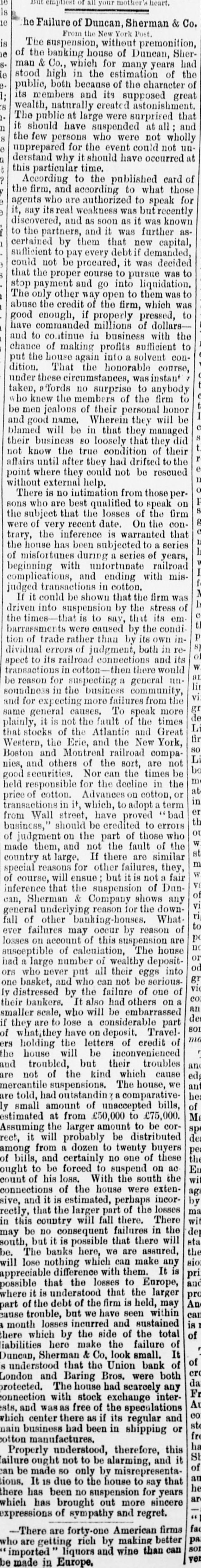 BY TELEGRAPH. Suspension of Duncan, Sherman & Co. NEW YORK, July 27.-Duncan, Sherman & Co., suspended this morning. The suspension causes great excitement in Wall street. NEW YORK, July 27.-The following annonncement has just been made by Duncan, Sherman & Co.: A careful examination of our business and affairs shows us most unexpectedly that through losses and misfortune our available assets are so reduced that we are compelled to go into liquidation. We reached this conclusion with the deepest regret, but the fact that up to the latest moment our unexampled credit having remained unimpaired would have compelled us, it we continue business, to hazard new obligations and receive new confidences which we were willing to assume for the protection of all our creditors without distiction or preference, we have this day made a general assignment to Hon. Wm. D. Shipman of this city, whose address for all matters connected with our affairs will be at our late banking house, No. 11 Nassau street. DUNCAN, SHERMAN & Co. (Signed) The Post's financial says: Quietness in Wall street was broken in the second hour of business, by the announcement that the banking house of Duncan, Sherman & Co. had closed their doors and suspended payment. A clap of thunder in a clear sky could not have caused more consternation, and at the Stock Exchange, Gold Exchange, and Cotton Exchange there was great excitement. The liabilities of the house are given at inside of $6,000,000, and it is admitted that the assets fall in value far below this amount. The losses, which have weakened the house, are not entirely of recent making, but cover several years, the heaviest, it is understood, having been in cotton, and the next in securities, which now have doubtful value. It is due to Wm. Butler Duncan to say that had he had the disposition to take the chances the credit of his house was sufficiently good to have enabled him to have got means necessary to bridge it over. His bills on London sold yesterday close on to those of four prime names. As a man of honor, however, he took an honorable course, and stopped while he had something to divide, refusing new business. He endeavored to get new capital enough to pay every demand which could possibly be made 00 bim, but failing in that, wisely concluded to suspend. Losses by the suspension will fall as a rule where they can be easily borne, although a considerable amount of travellers' credits are outstanding. The Union Bank of London and the Baring Brothers, the London correspondents of the house, are of course able to stand what they will lose. The bank of the State of New York, their home bankers, are, we are told, fully protected. The house was a favorite one for the deposit accounts of corporations, and they Can also stand their losses without embarrassment. We do not know yet the amount of bills ou Europe, which have been sold here, and are held by our merchants. This, it is presumed, will be the heaviest part of the loss, or the part felt most. It is not known, nor is it supposed, that the house was carrying any considerable amount of stocks, which have a close market at Stock Exchange. NEW YORK. July 17-1 p. m -Gold advanced to 16: upen the announcement of the suspension of Duncan, Sherman & Co., but is now (1 p. m.) 14}. PHILADELPHIA, July The failure of Duncan, Sherman & Co., reported here about noon, causes intense excitement. Gold jumped at once to 10±, but has now fallen to 14.