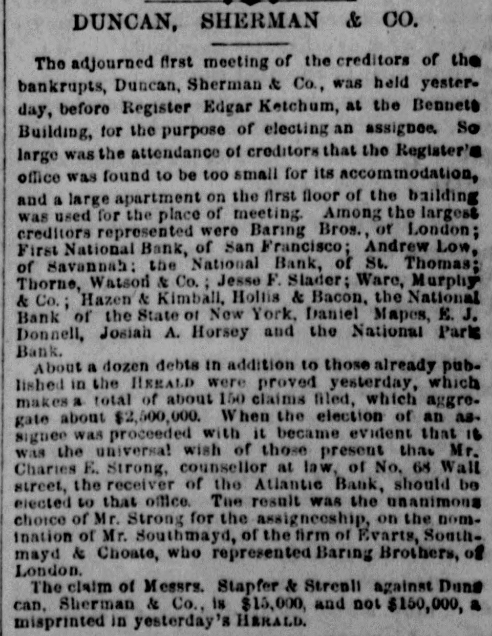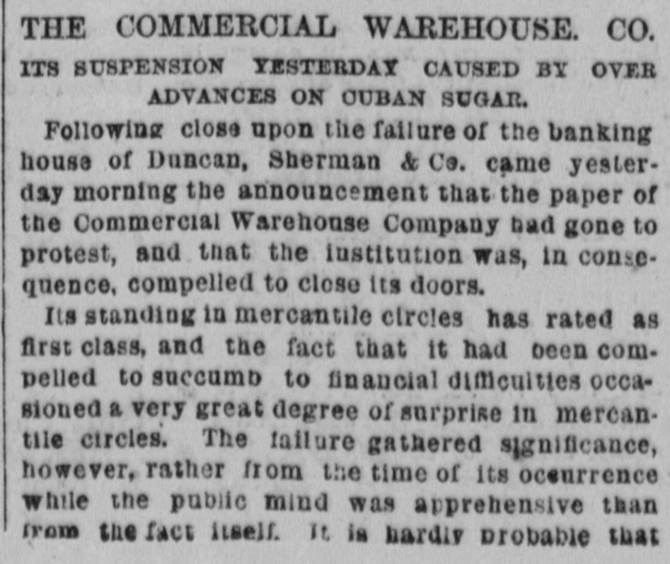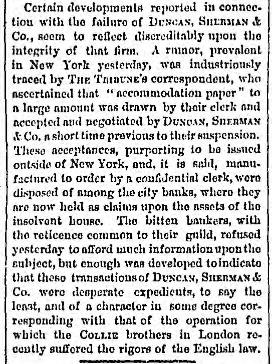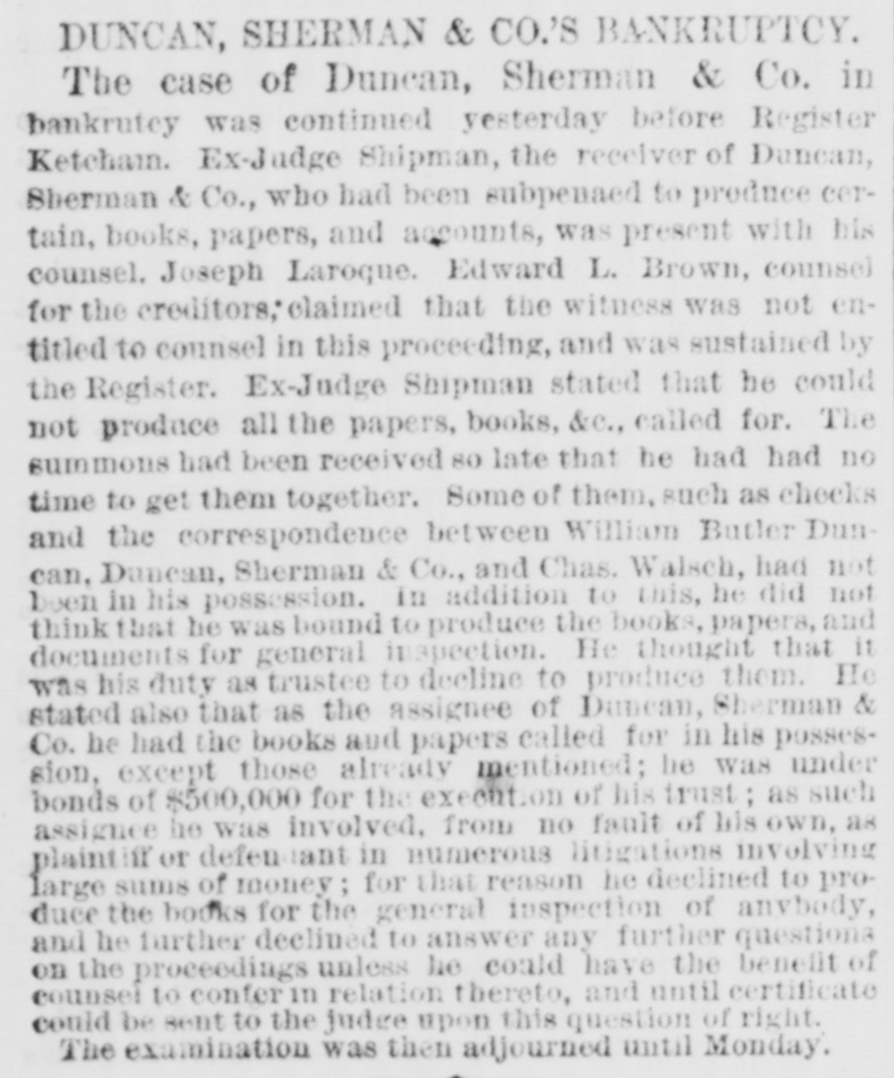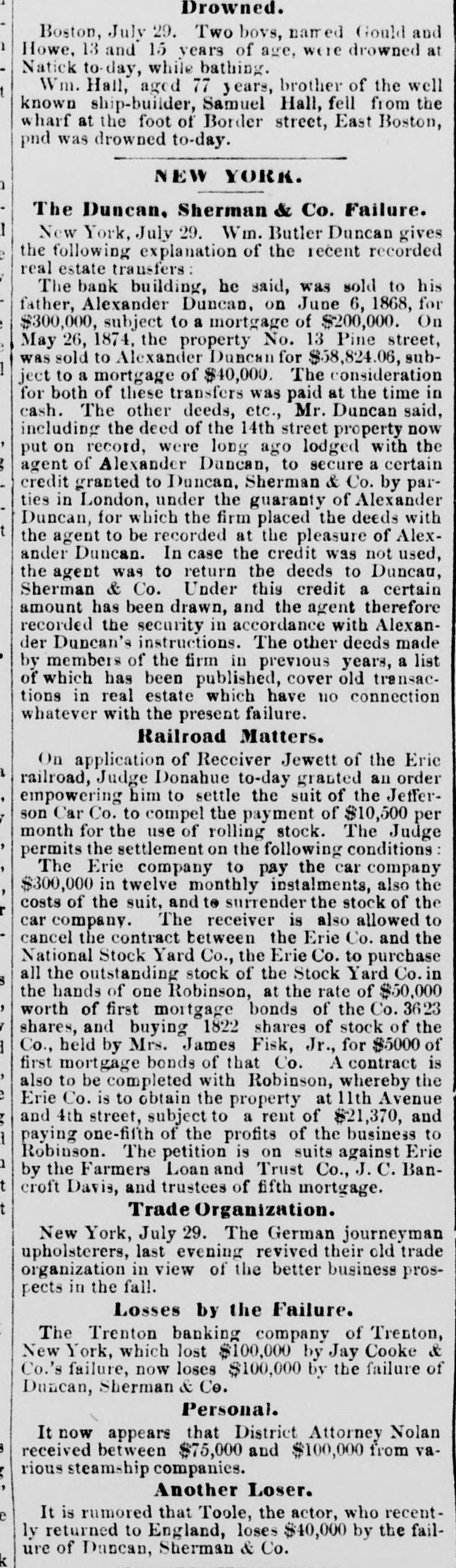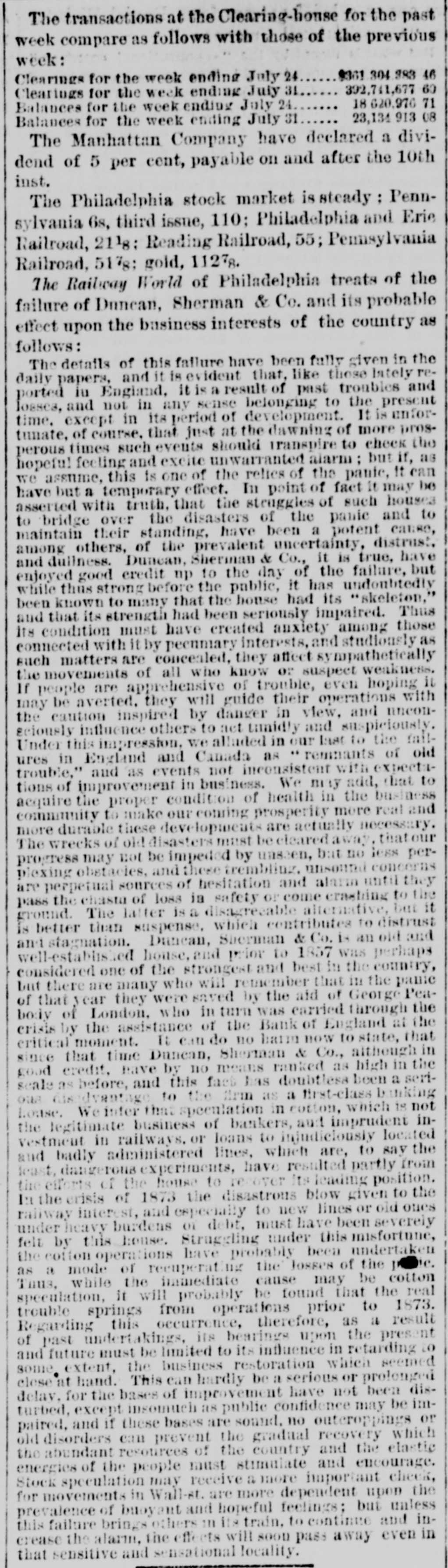 BY TELEGRAPH. Suspension of Duncan, Sherman & Co. NEW YORK, July 27.-Duncan, Sherman & Co., suspended this morning. The suspension causes great excitement in Wall street. NEW YORK, July 27.-The following annonncement has just been made by Duncan, Sherman & Co.: A careful examination of our business and affairs shows us most unexpectedly that through losses and misfortune our available assets are so reduced that we are compelled to go into liquidation. We reached this conclusion with the deepest regret, but the fact that up to the latest moment our unexampled credit having remained unimpaired would have compelled us, it we continue business, to hazard new obligations and receive new confidences which we were willing to assume for the protection of all our creditors without distiction or preference, we have this day made a general assignment to Hon. Wm. D. Shipman of this city, whose address for all matters connected with our affairs will be at our late banking house, No. 11 Nassau street. DUNCAN, SHERMAN & Co. (Signed) The Post's financial says: Quietness in Wall street was broken in the second hour of business, by the announcement that the banking house of Duncan, Sherman & Co. had closed their doors and suspended payment. A clap of thunder in a clear sky could not have caused more consternation, and at the Stock Exchange, Gold Exchange, and Cotton Exchange there was great excitement. The liabilities of the house are given at inside of $6,000,000, and it is admitted that the assets fall in value far below this amount. The losses, which have weakened the house, are not entirely of recent making, but cover several years, the heaviest, it is understood, having been in cotton, and the next in securities, which now have doubtful value. It is due to Wm. Butler Duncan to say that had he had the disposition to take the chances the credit of his house was sufficiently good to have enabled him to have got means necessary to bridge it over. His bills on London sold yesterday close on to those of four prime names. As a man of honor, however, he took an honorable course, and stopped while he had something to divide, refusing new business. He endeavored to get new capital enough to pay every demand which could possibly be made 00 bim, but failing in that, wisely concluded to suspend. Losses by the suspension will fall as a rule where they can be easily borne, although a considerable amount of travellers' credits are outstanding. The Union Bank of London and the Baring Brothers, the London correspondents of the house, are of course able to stand what they will lose. The bank of the State of New York, their home bankers, are, we are told, fully protected. The house was a favorite one for the deposit accounts of corporations, and they Can also stand their losses without embarrassment. We do not know yet the amount of bills ou Europe, which have been sold here, and are held by our merchants. This, it is presumed, will be the heaviest part of the loss, or the part felt most. It is not known, nor is it supposed, that the house was carrying any considerable amount of stocks, which have a close market at Stock Exchange. NEW YORK. July 17-1 p. m -Gold advanced to 16: upen the announcement of the suspension of Duncan, Sherman & Co., but is now (1 p. m.) 14}. PHILADELPHIA, July The failure of Duncan, Sherman & Co., reported here about noon, causes intense excitement. Gold jumped at once to 10±, but has now fallen to 14.