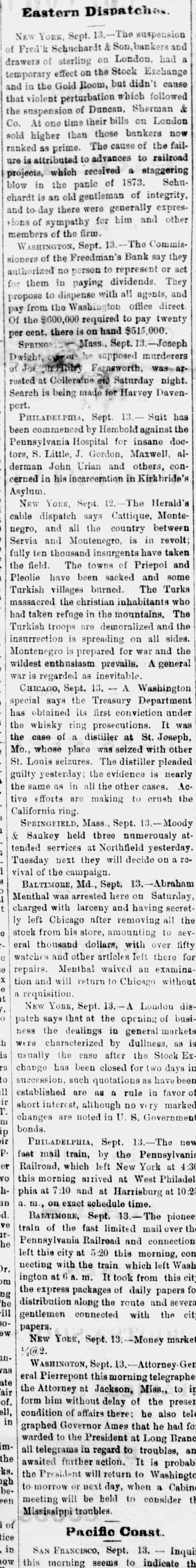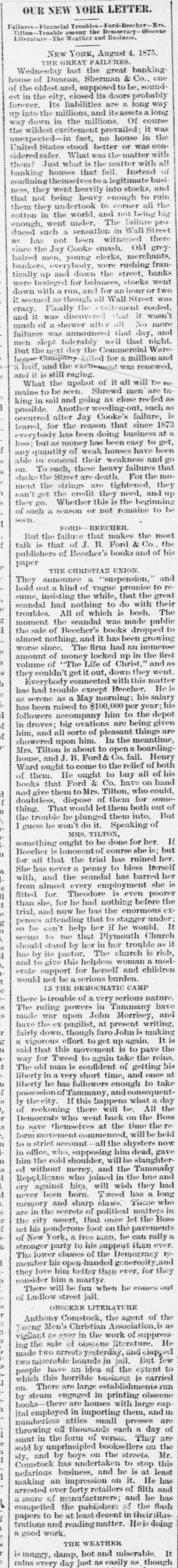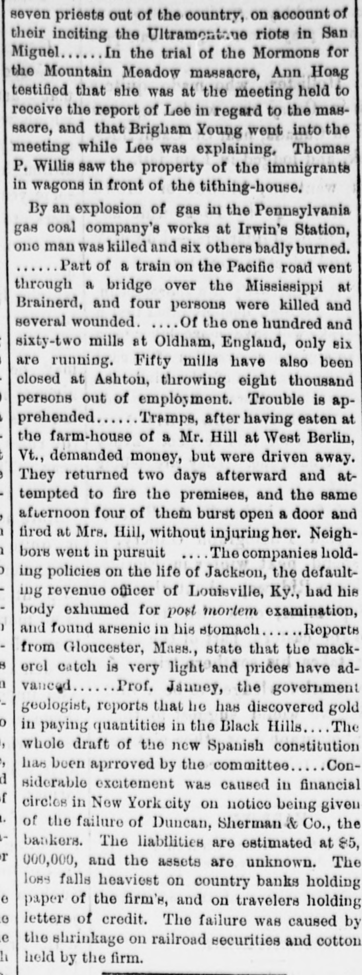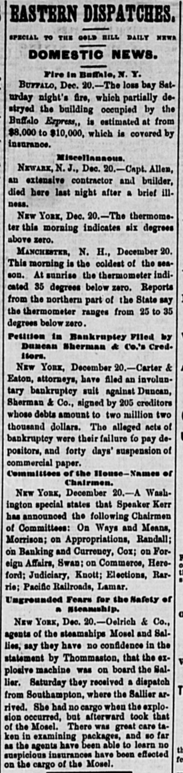 BY TELEGRAPH. Suspension of Duncan, Sherman & Co. NEW YORK, July 27.-Duncan, Sherman & Co., suspended this morning. The suspension causes great excitement in Wall street. NEW YORK, July 27.-The following annonncement has just been made by Duncan, Sherman & Co.: A careful examination of our business and affairs shows us most unexpectedly that through losses and misfortune our available assets are so reduced that we are compelled to go into liquidation. We reached this conclusion with the deepest regret, but the fact that up to the latest moment our unexampled credit having remained unimpaired would have compelled us, it we continue business, to hazard new obligations and receive new confidences which we were willing to assume for the protection of all our creditors without distiction or preference, we have this day made a general assignment to Hon. Wm. D. Shipman of this city, whose address for all matters connected with our affairs will be at our late banking house, No. 11 Nassau street. DUNCAN, SHERMAN & Co. (Signed) The Post's financial says: Quietness in Wall street was broken in the second hour of business, by the announcement that the banking house of Duncan, Sherman & Co. had closed their doors and suspended payment. A clap of thunder in a clear sky could not have caused more consternation, and at the Stock Exchange, Gold Exchange, and Cotton Exchange there was great excitement. The liabilities of the house are given at inside of $6,000,000, and it is admitted that the assets fall in value far below this amount. The losses, which have weakened the house, are not entirely of recent making, but cover several years, the heaviest, it is understood, having been in cotton, and the next in securities, which now have doubtful value. It is due to Wm. Butler Duncan to say that had he had the disposition to take the chances the credit of his house was sufficiently good to have enabled him to have got means necessary to bridge it over. His bills on London sold yesterday close on to those of four prime names. As a man of honor, however, he took an honorable course, and stopped while he had something to divide, refusing new business. He endeavored to get new capital enough to pay every demand which could possibly be made 00 bim, but failing in that, wisely concluded to suspend. Losses by the suspension will fall as a rule where they can be easily borne, although a considerable amount of travellers' credits are outstanding. The Union Bank of London and the Baring Brothers, the London correspondents of the house, are of course able to stand what they will lose. The bank of the State of New York, their home bankers, are, we are told, fully protected. The house was a favorite one for the deposit accounts of corporations, and they Can also stand their losses without embarrassment. We do not know yet the amount of bills ou Europe, which have been sold here, and are held by our merchants. This, it is presumed, will be the heaviest part of the loss, or the part felt most. It is not known, nor is it supposed, that the house was carrying any considerable amount of stocks, which have a close market at Stock Exchange. NEW YORK. July 17-1 p. m -Gold advanced to 16: upen the announcement of the suspension of Duncan, Sherman & Co., but is now (1 p. m.) 14}. PHILADELPHIA, July The failure of Duncan, Sherman & Co., reported here about noon, causes intense excitement. Gold jumped at once to 10±, but has now fallen to 14.