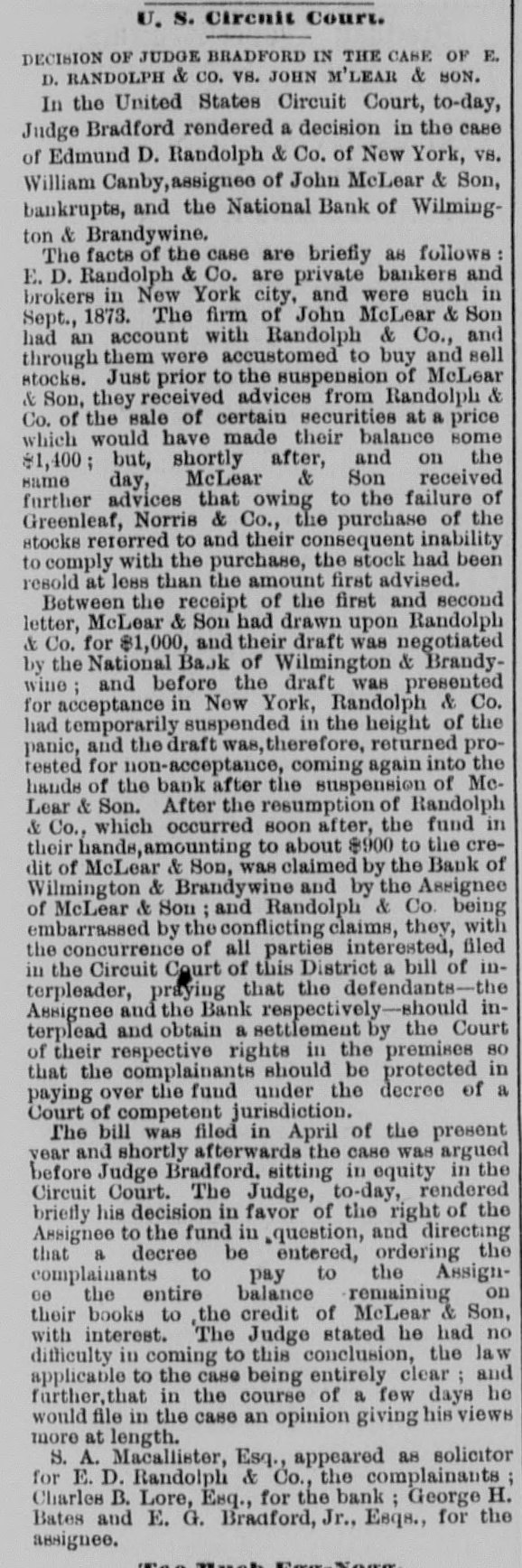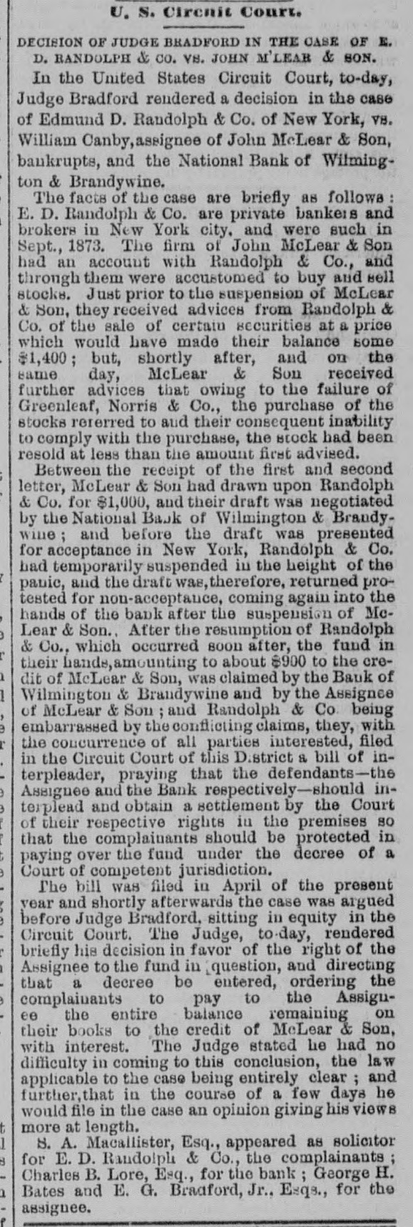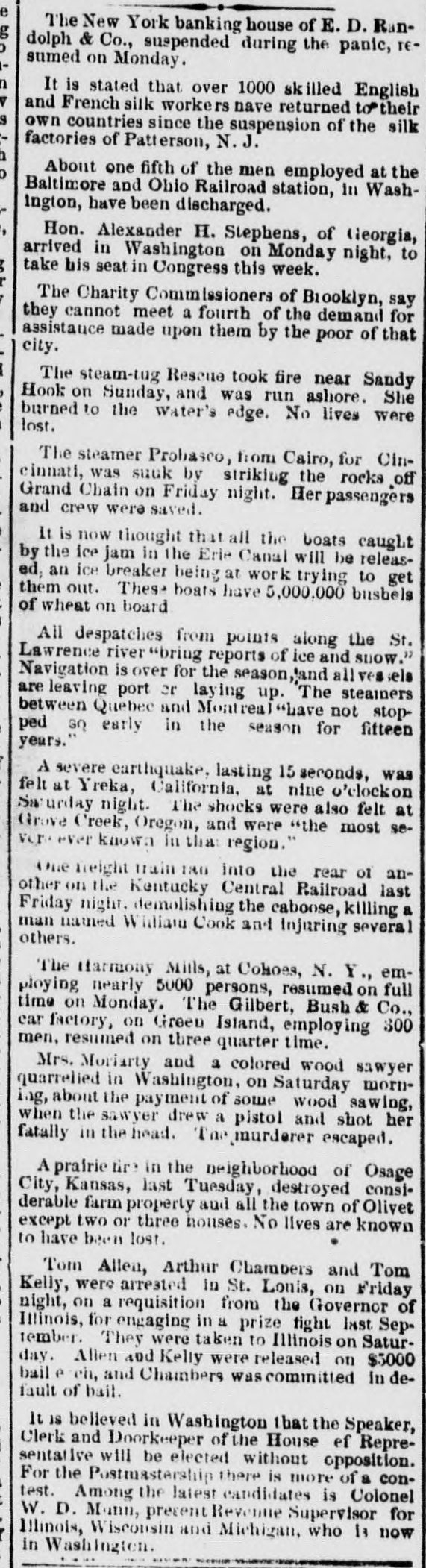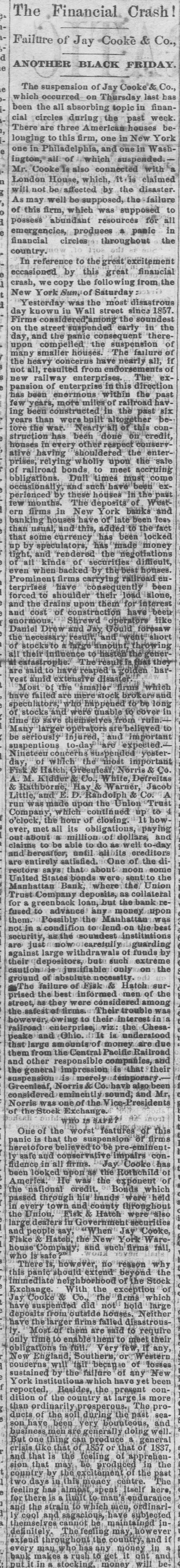 STOCKS. The following shows the decline In the leading stocks: Opening. 10:30 A. M. 96 Central 91 Harlem 120 114 Erie 54 52 1/2 Lake Shore 83 87 % Wabash 46 39 Rock Island 89 97 39 33 Milwaukie and St. Paul 32 Ohio and Mississippi, 27 % 22 17 Union Pacific 23 C.C. & I. C 19 ¥ 78 W. U. Telegraph 68% 38 Pacific Mail 32% ADDITIONAL FAILURES. NEW YORK, Sept. 19. Day & Morse and Hay & Warner have suspended. THE TRUST COMPANY STILL HOLDING OUT. NEW YORK, Sept. 19. The run on the Trust Company continues. The company is still paying. A GENEROUS OFFER. Munroe & Co., of Paris, notify their New Yoork house by cable that they will protect all bills of Jay Cooke & Co. upon them. They offered this morning to discount Cooke's immatured bills at the bank rate. WILL SECRETARY RICHARDSON "REMOVE THE PRESSURE?" It is stated on good authority that Secretary Richardson will come to the relief of the New York banks to-day. but in what manner cannot be ascertained. The Treasury officials refuse any information. CONTINUED EXCITEMENT IN WALL STREET. NEW YORK, Sept. 19, 2. P. M.-The Stock Exchange has been a scene of the wildest excitement throughout the morning, the volume of business having been so large, and the fluctuations of such proportions, as to make it well nigh impossible to keep a record of the business. As each failure was announced on the exchange, the excitement increased, and everybody seemed wild with fright. Coolness and confidence departed for a time, and it is many years since such scenes have been witnessed on the exchange. The decline has ranged from 1 1/2 to 30 per cent. STILL ANOTHER FIRM GONE UNDER. NFW YORK, Sept., 19.-Fitch & Co., have suspended. A GENERAL SUSPENSION PREDICTED. NEW YORK, Sept., The office of Fisk & Hatch is strongly guarded by police. Jay Cooke & Co., are hard at work preparing a statement of their affairs. A prominent Wall streer banker says if the movement now making to get the secretary of the treasury to come to relief with $10,000,000 should fail there will bea general suspension of banks and others. A meeting of bank presidents is now being held at the clearing-house. Vernon & Heyhave suspended. THE STOCK MARKET is not quite so irregular, the excitement still continuing. The crowds at the stock exchage are so large that the police have been called to prevent the entrance of any but members. MORE IMPORTANT SUSPENSIONS. NEW YORK, Sept., 19.-E. D. Randolph & Co., bankers of the Pennsylvania Central railroad and Wm. H. Connor have announced their suspensions. THE MONEY MARKET 8 so unsettled that it is difficult to name a rate. Foreignexchange is nominal. Gold is active and excited, and after frequent and violent fluctua. tions advanced to 113 it is now 12. The rates paid for carrying were 1.32 to 7 per eent. gold. Southern state securities are neglected. Government bonds are unsettled; quotations are nominal. LATFR--There is a better feeling in the market. The following are the quotations up to this hour: Central, 95; Erie, 53%; Lake Shore, 88; Wabash, 45. The Panic in Philadelphia. COOKE'S LONDON HOUSE ALL RIGHT.