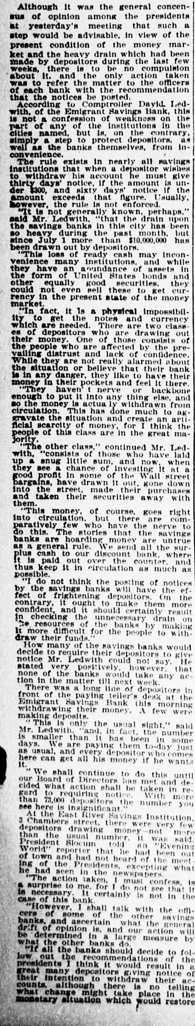 Although It was the general concensus of opinion among the presidents at yesterday's meeting that such a step would be advisable, in view of the present condition of the money market and the heavy drain which had been made by depositors during the last few weeks, there is to be no compulsion about it. and the only action taken was to refer the matter to the officers of each bank with the recommendation that the notices be posted. According to Comptroller Dayid. Ledwith, of the Emigrant Savings Bank, this is not a confession of weakness on the part of any of the institutions in the cities named, but is, on the contrary. simply a step to protect depositors. as well as the banks themselves, from inconvenience. The rule exists in nearly all savings institutions that when a depositor wishes to withdraw his account he must give thirty days' notice, if the amount is under $300, and sixty days' notice if the amount exceeds that figure. Usually, however, the rule is not enforced. "It is not generally known, perhaps," said Mr. Ledwith, "that the drain upon the savings banks in this city has been so heavy during the past month, but since July 1 more than $10,000,000 has been drawn out by depositors. "This loss of ready cash may inconvenience many institutions, and while they have an aoundance of assets In the form of United States bonds and other equally good securities. they could not even sell these to get currency in the present state of the money market. "In fact, it Is a physical Impossibility to get the notes and currency which are needed. There are two classes of depositors who are drawing out their money. One of those consists of the people who are affected by the prevailing distrust and lack of confidence. While they are not really alarmed about the situation or believe that their bank is in any danger, they like to have their money in their pockets and feel It there. "They haven t nerve or backbone enough to put it into any thing else, and so the money is actua ly withdrawn from circulation. This has done much to aggravate the situation and create an artificial scarcity of money, for I think the people of this class are in the great majority. The other class," continued Mr. Ledwith, "consists of those who have laid up a snug little sum, and now. when they see a chance of investing It at a good profit in some of the Wall street bargains, have drawn it out, gone down into the street, made their purchases and taken their securities away with them. "This money, of course, goes right into circulation. but there are comparatively few who have the nerve to do this. The stories that the savings banks are hoarding money are untrue as a general rule. We send all the surplus cash to our discount bank, where it is paid out over the counter. and thus keep it in circulation as much as possible. "I do not think the posting of notices by the savings banks will have the effect of frightening depositors On the contrary, it ought to make them more confident, and it should certainly result in checking the unnecessary drain on = resources of the banks by making It more difficult for the people to withdraw their funds." How many of the savings banks would decide to require their depositors to give notice Mr. Ledwith could not say. He stated very positively. however, that none of the banks would take any action in the matter till next week. There was a long line of depositors in front of the paying teller's desk at the Emigrant Savings Bank this morning withdrawing their money. A few were making deposits. This is only the usual sight." said Mr. Ledwith. "and, in fact, the number is smaller than it has been in some days. We are paying them to-day just as usual, and every depositor who comes it. here can get all his money if he wants We shall continue to do this until our Board of Directors has met and decided what action shall be taken in regard to requiring notice. With more than 73,000 depositors the number you see here is insignificant. At the East River Savings Institution. 3 Chambers street, there were very few depositors drawing money-not more than the usual number, it was said. President Slocum told an "Evening World" reporter that he had been out of town and had not heard of the meet ing of the Presidents, excepting what he had seen in the newspapers. "The action taken, I must confess, is a surprise to me, for I do not see that It is necessary. It certainly is not in the case of this bank "However, I shall talk with the officers of some of the other savings banks, and ascertain what the general drift of opinion is, and our action will be determined in a large measure by what the other banks do. "If all the banks should decide to follow out the recommendations of the presidents I think it would result in a great many depositors giving notice of their intention to withdraw their accounts. although there is no telling what change might take place in the monetary situation which would restore