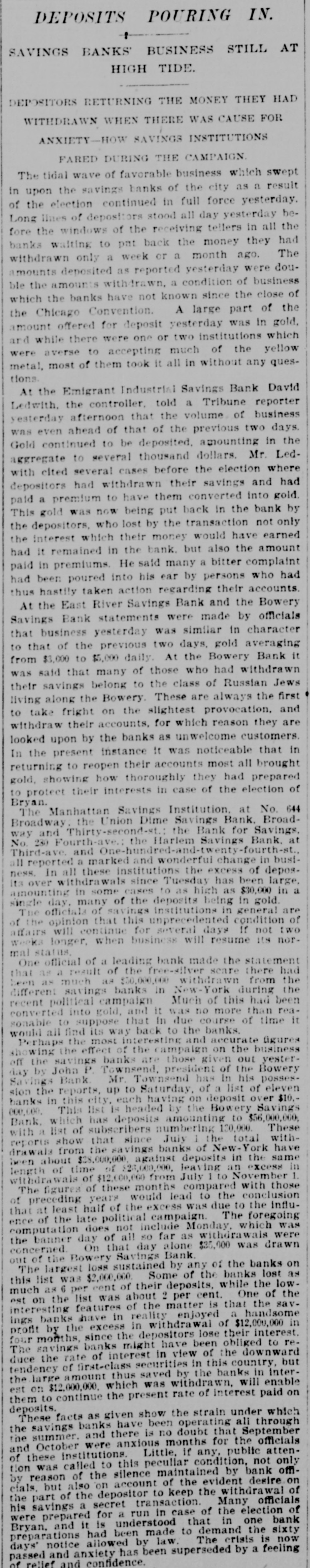 A RUSH TO THE SAVINGS BANKS MONEY WITHDRAWN BEFORE ELECTION BEING RETURNED NOW. DEPOSITS PHENOMENALLY INCREASED-MOST OF THE DEPOSITORS HOARDED GOLD-DIRECTORS AND OFFICERS ENTHUSIASTIC. The savings institutions of this city have been among the first to feel the favorable reaction following the victory of sound money last Tuesday. Yesterday and the day before there was an unprecedented rush of big and little depositors, who kept tellers, bookkeepers and clerks on the jump and brought broad smiles of satisfaction and contentment to the faces of the officers of all the leading savings banks in town. Day after day and week after week all through the campaign just brought to a close, the books of these institutions have shown the balance always in favor of withdrawals over deposits, the amount sometimes running up to the tens of thousands daily. Persons who were afraid of Bryan's election: persons who hoped to make a snug little sum when gold went to a premium; persons who thought the country was going to the dogs, have all been drawing upon the banks to the full extent of their deposits. When It became certain that the representatives of sound money had been elected the aspect of affairs changed entirely, and there was a rush to redeposit the funds that had been previously withdrawn. At the East River Savings Institution, No. 3 Chambers-st., one of the directors told a Tribune reporter yesterday that the first favorable change in the long unsatisfactory period through which the bank had been going was noticed the morning after election. Yesterday. he said, more than $10,000 in gold had been taken in, and this was the first gold to speak of that the bank had received from depositors in a year. He added that drafts had been greatly reduced in number since election, all of which pointed to a most welcome change in public sentiment. At the Emigrant Industrial Savings Bank, one of the officers said that on Monday the withdrawals were $25,000 more than the deposits, but on Wednesday the current turned and the deposits exceeded the withdrawals by the same amount. A noteworthy feature of the deposits made on Wednesday was that they were largely in gold. One depositor who withdrew several thousand dollars before election returned yesterday, bringing only gold. He had evidently figured that by converting his money into gold he would make a snug sum. As it turned out, his loss in interest will amount to $120, to say nothing of what it cost him to get the gold. At the Citizens' Savings Bank, No. 58 Bowery, the cashier said that the bank had taken in more gold since the election thar he had seen in the last three months. The banks had been doing practically nothing for the last three months, and he had never seen such a wonderful reaction for the better since he had been in the banking business. John B. Townsend, president of the Bowery Bank, said that they had received at the bank about $3,000 in gold each day since election, at the same time refusing large sums in gold which had been offered for deposit, for the reason that the bank did not want gold deposits. Mr. Townsend said that many new accounts had been opened since election. The day before the election there had been a heavy withdrawal made. An official of one of the leading savings banks of the city said that in the last few months the amount withdrawn from all the saving institutions In the city to be converted into gold would probably amount to $60,000,000. W. C. Sturgis, president of the Seamen's Bank for Savings, said: "The indications, as shown by our deposits to-day and yesterday, are that those among our depositors who hoarded gold prior to the election are now again depositing the sums they withdrew from circulation. Other savings bank officers tell of a similar experience. The fact that gold is bulky and cannot be kept with such safety as paper money will be one of the things which will operate toward promoting Its quick deposit in banks."