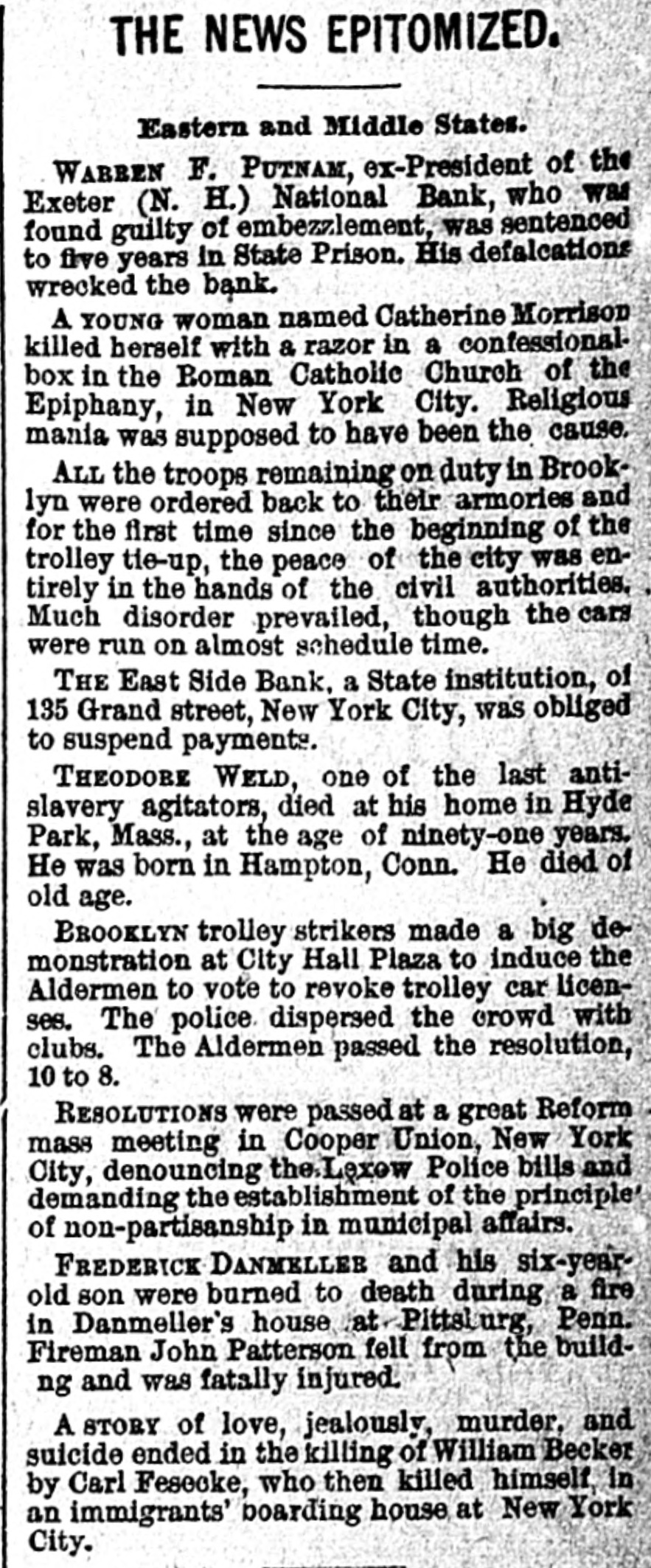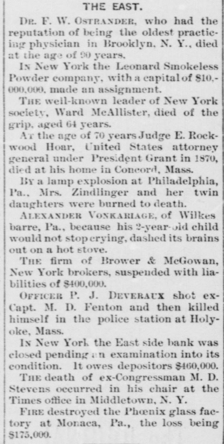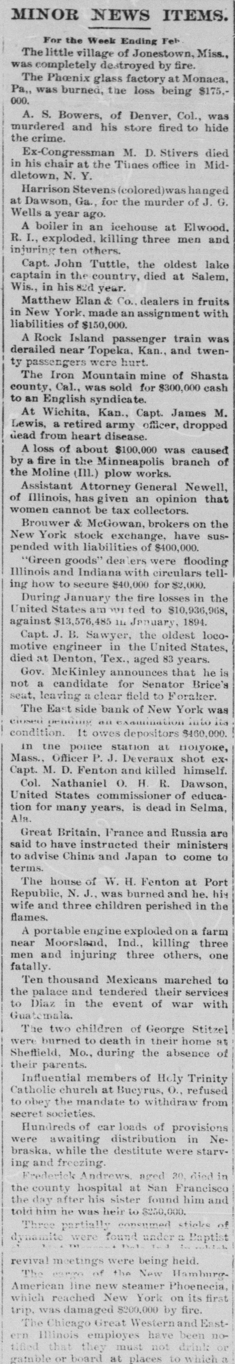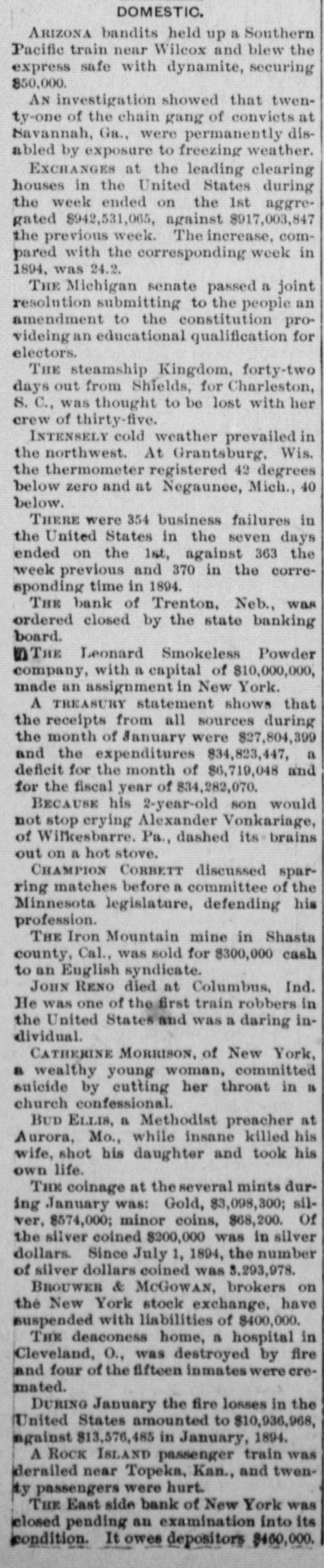 DOMESTIC. ARIZONA bandits held up a Southern Pacific train near Wilcox and blew the express safe with dynamite, securing $50,000. AN investigation showed that twenty-one of the chain gang of convicts at Savannah, Ga., were permanently disabled by exposure to freezing weather. EXCHANGES at the leading clearing houses in the United States during the week ended on the 1st aggregated $942,531,065, against $917,003,847 the previous week. The increase, compared with the corresponding week in 1894, was 24.2. THE Michigan senate passed a joint resolution submitting to the people an amendment to the constitution provideing an educational qualification for electors. THE steamship Kingdom, forty-two days out from Shields, for Charleston, S. C., was thought to be lost with her crew of thirty-five. INTENSELY cold weather prevailed in the northwest. At Grantsburg, Wis. the thermometer registered 42 degrees below zero and at Negaunee, Mich., 40 below. THERE were 354 business failures in the United States in the seven days ended on the 1st, against 363 the week previous and 370 in the corresponding time in 1894. THE bank of Trenton, Neb., was ordered closed by the state banking board. in THE Leonard Smokeless Powder company, with a capital of $10,000,000, made an assignment in New York. A TREASURY statement shows that the receipts from all sources during the month of January were $27,804,399 and the expenditures $34,823,447, a deficit for the month of $6,719,048 and for the fiscal year of $34,282,070. BECAUSE his 2-year-old son would not stop crying Alexander Vonkariage, of Wilkesbarre. Pa., dashed its brains out on a hot stove. CHAMPION CORBETT discussed sparring matches before a committee of the Minnesota legislature, defending his profession. THE Iron Mountain mine in Shasta county, Cal., was sold for $300,000 cash to an English syndicate. JOHN RENO died at Columbus, Ind. He was one of the first train robbers in the United States and was a daring individual. CATHERINE MORRISON, of New York, a wealthy young woman, committed suicide by cutting her throat in a church confessional. BUD ELLIS, a Methodist preacher at Aurora, Mo., while insane killed his wife, shot his daughter and took his own life. THE coinage at the several mints during January was: Gold, $3,098,300; silver, $574,000; minor coins, $68,200. Of the silver coined $200,000 was in silver dollars. Since July 1, 1894, the number of silver dollars coined was 5,293,978. BROUWER & McGowan, brokers on the New York stock exchange, have suspended with liabilities of $400,000. THE deaconess home, a hospital in Cleveland, O., was destroyed by fire and four of the fifteen inmates were cremated. DURING January the fire losses in the United States amounted to $10,936,968, against $13,576,485 in January, 1894. A ROCK ISLAND passenger train was derailed near Topeka, Kan., and twenty passengers were hurt. THE East side bank of New York was closed pending an examination into its condition. It owes depositors $460,000.