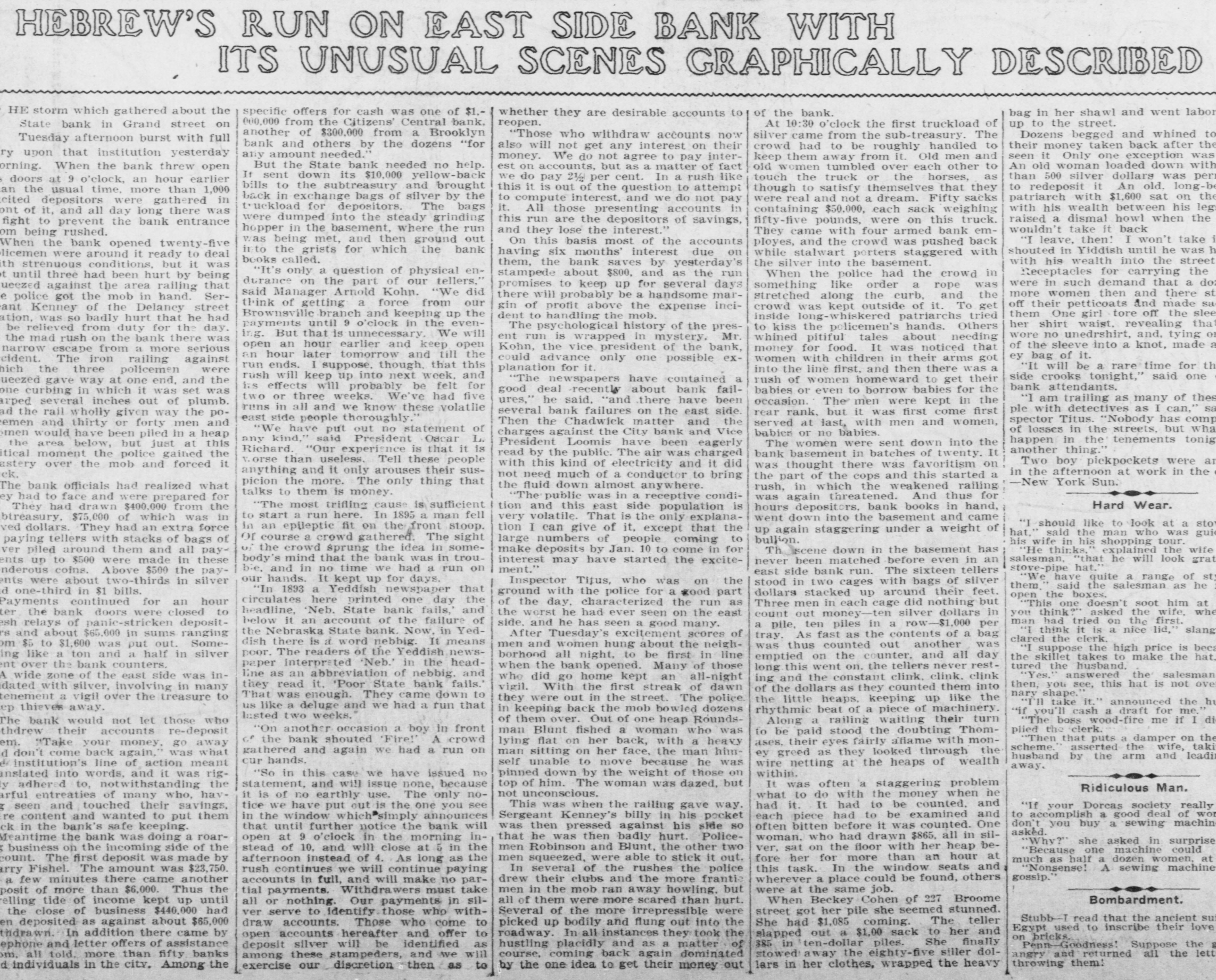 HEBREW'S RUN ON EAST SIDE BANK WITH ITS UNUSUAL SCENES GRAPHICALLY DESCRIBED specific offers for cash was one of $1.HE storm which gathered about the of the bank. whether they are desirable accounts to bag in her shawl and went labor 000,000 from the Citizens' Central bank, reopen. At 10:30 o'clock the first truckload of State bank in Grand street on up to the street. another of $300,000 from a Brooklyn "Those who withdraw accounts now Dozens begged and whined to silver came from the sub-treasury. The Tuesday afternoon burst with full bank and others by the dozens "for their money taken back after the also will not get any interest on their crowd had to be roughly handled to upon that institution yesterday any amount needed." seen it Only one exception was money. We do not agree to pay interkeep them away from it. Old men and An old woman loaded down with But the State bank needed no help. est on accounts, but as a matter of fact old women tumbled over each other to orning. When the bank threw open It sent down its $10,000 yellow-back than 500 silver dollars was peri touch the truck or the horses, as we do pay 2½ per cent. In a rush like doors at 9 o'clock, an hour earlier bills to the subtreasury and brought to redeposit it An old. long-be this it is out of the question to attempt though to satisfy themselves that they the usual time, more than 1,000 back in exchange bags of silver by the patriarch with $1,600 sat on the were real and not a dream. Fifty sacks to compute interest, and we do not pay depositors were gathered in truckload for depositors. The bags with his wealth between his leg it. All those presenting accounts in containing $50,000, each sack weighing of it, and all day long there was were dumped into the steady grinding raised a dismal howl when the this run are the depositors of savings, fifty-five pounds, were on this truck. fight to prevent the bank entrance hopper in the basement, where the run wouldn't take it back and they lose the interest." They came with four armed bank embeing rushed. was being met, and then ground out "I leave, then! I won't take i On this basis most of the accounts ployes, and the crowd was pushed back When the bank opened twenty-five into the grists for which the bank shouted in Yiddish until he was h having six months' interest due on while stalwart porters staggered with licemen were around it ready to deal books called. with his wealth into the street the silver into the basement. them, the bank saves by yesterday's strenuous conditions, but it was "It's only a question of physical enReceptacles for carrying the stampede about $800, and as the run When the police had the crowd in until three had been hurt by being durance on the part of our tellers." were in such demand that a do promises to keep up for several days something like order a rope was ueezed against the area railing that said Manager Arnold Kohn. "We did more women then and there st there will probably be a handsome marstretched along the curb, and the police got the mob in hand. Serthink of getting a force from our off their petticoats and made sa crowd was kept outside of it. To get gin of profit above the expense inciKenney of the Delancy street them One girl tore off the slee Brownsville branch and keeping up the dent to handling the mob. inside long-whiskered patriarchs tried was so badly hurt that he had payments until 9 o'clock in the evenher shirt waist, revealing tha The psychological history of the presto kiss the policemen's hands. Others be relieved from duty for the day. ing. But that is unnecessary. We will wore no unedrshirt, and, tying or ent run is wrapped in mystery, Mr. the mad rush on the bank there was whined pitiful tales about needing open an hour earlier and keep open of the sleeve into a knot, made a Kohn, the vice president of the bank, money for food. It was noticed that narrow escape from a more serious an hour later tomorrow and till the ey bag of it. women with children in their arms got could advance only one possible exThe iron railing against run ends. I suppose, though, that this "It will be a rare time for th planation for it. into the line first, and then there was a the three policemen were rush will keep up into next week, and side crooks tonight," said one "The newspapers have contained a rush of women homeward to get their ueezed gave way at one end, and the its effects will probably be felt for bank attendants. good deal recent about bank failbabies or even to borrow babies for the curbing in which it was set was two or three weeks. We've had five "I am trailing as many of thes ures," he said. "and there have been occasion. The men were kept in the several inches out of plumb. runs in all and we know these volatile ple with detectives as I can," sa several bank failures on the east side. rear rank, but it was first come first the rail wholly given way the poeast side people thoroughly." spector Titus. "Nobody has comp Then the Chadwick matter and the served at last, with men and women, and thirty or forty men and of losses in the streets, but wha "We have put out no statement of charges against the City bank and Vice babies or no babies. would have been piled in a heap any kind," said President Oscar L. happen in the tenements tonig President Loomis have been eagerly The women were sent down into the the area below, but just at this Richard. "Our experience is that it is another thing." read by the public. The air was charged bank basement in batches of twenty. It moment the police gained the worse than useless. Tell these people Two boy pickpockets were an over the mob and forced it with this kind of electricity and it did was thought there was favoritism on anything and it only arouses their susin the afternoon at work in the not need much of a conductor to bring the part of the cops and this started a -New York Sun. picion the more. The only thing that the fluid down almost anywhere. The bank officials had realized what rush, in whi