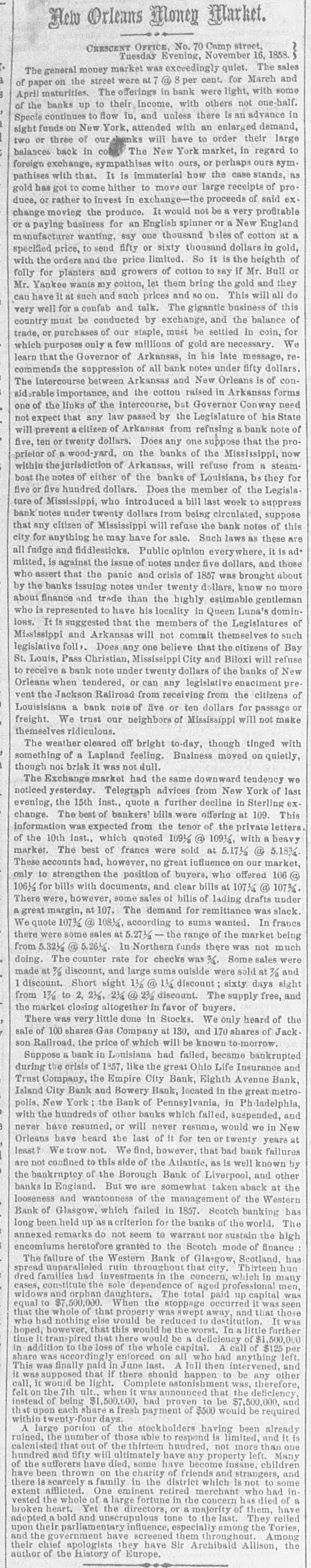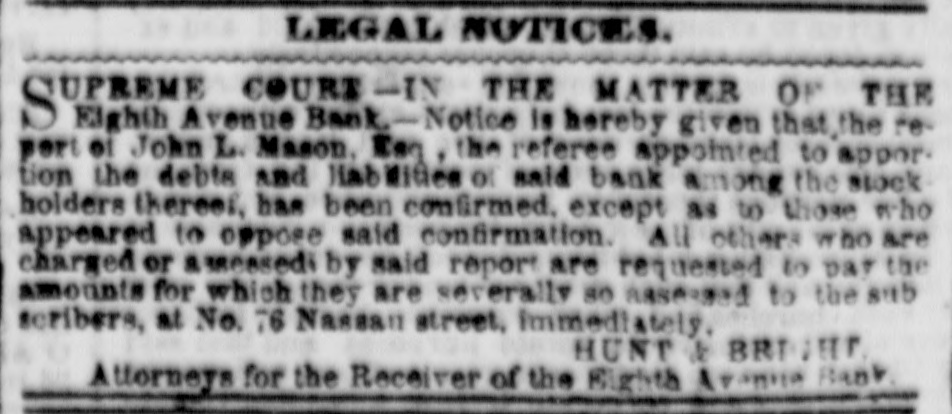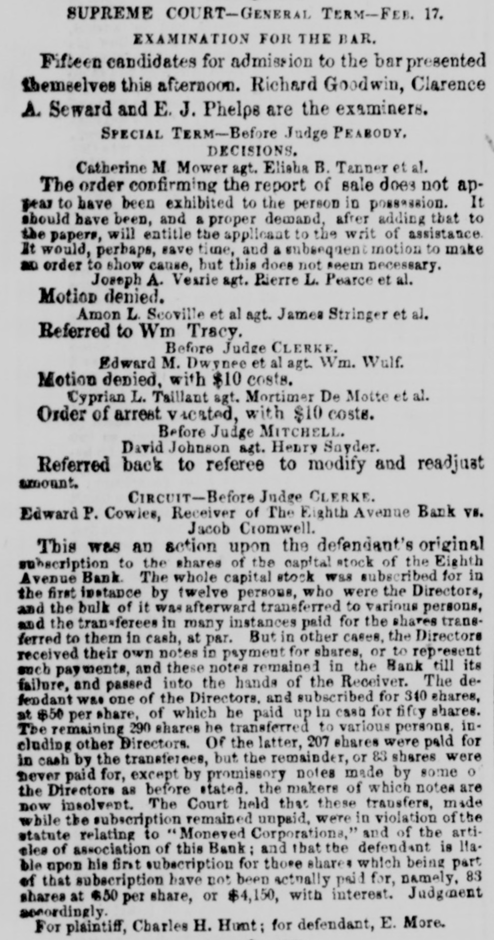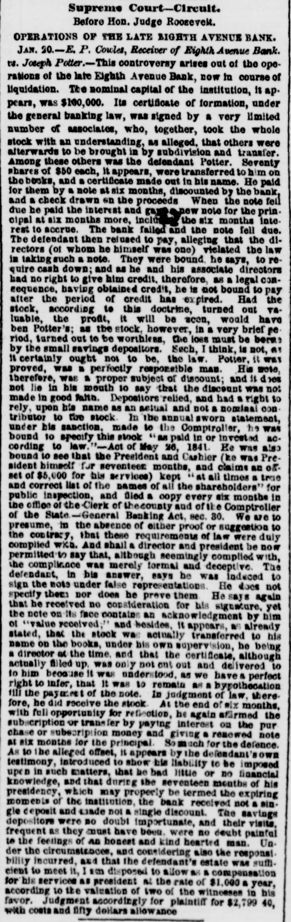 Supreme Court-Circult. Before Hon. Judge Roosevelt. OPERATIONS OF THE LATE BIGHTH AVENUE BANK. JAN. 20.-E. P. Cowles, Receiver of Eighth Avenue Bank. us. Joseph Potter.-This controversy arises out of the operations of the late Eighth Avenue Bank, now in course of liquidation. The nominal capital of the institution, it ap. pears, was $100,000. Its certificate of formation, under the general banking law, was signed by a very limited number of associates, who, together, took the whole stock with an understanding, as alleged, that others were alterwards to be brought in by subdivision and transfer. Among these others was the defendant Potter. Seventy shares of $50 each, it appears, were transferred to him on the becks, and a certificate made out in his name. He paid for them by a note at six months, discounted by the bank, and a check drawn en the proceeds When the note feil due he paid the interest and game - new note for the prin. cipal at six months more, include the six months interest to accrue. The bank failed and the note fell due. The defendant then rejused to pay, alleging that the directors (of whom he himself was one) vielated the law in taking such a note. They were bound. he says, to require cash down; and as he and his associate directors had no right to give him credit. therefore, as a legal comsequence, having obtained credit, he is not bound to pay after the period of credit has expired. Had the stock, according to this doctrime, turned out valuable, the profit, it will be seen, would have ben Potter's; as the stock, however, in a very brief pe. riod, turned out to be worthless, the loss must be berme by the small savings depositors. Sech, I think, is not, as 18 certainly ought not to be, the law. Potter, it was proved, was a perfectly responsible man. His mete, therefore, was a proper subject of discount; and it nes not lie in his mouth to say that the discount was not made in good Faith. Depositors relied, and had a right so rely, upon his name as an actual and not a nominal contributor to the stock. In the annual sworn statement, under his sanction, made to the Comptroller, he was bound to specify this stock "as paid in or invested according to law."-Act of May 26, 1841. Ee was also bound to see that the President and Cashier (ke was President himself for seventeem months, and claims an offset of $5,000 for his services) kept at all times a true and correct list of the names of all the shareholders" for public inspection, and filed a copy every six months in the office of the Clerk of the county and of the Comptroller of the State-General Benking Act, sec. 30. we are to presume, in the absence of either proof or suggestion to the contrary, that these requirements of law were duly complied wkb. And shall a director and president be now permitted to say that, although seemingly complied with, the compliance was merely formal and deceptive. The defendant, in bis answer, says he was induced to sign the note under false representations. He does not specify them nor does he preve them He says again that he received no consideration for his signature, yet the note on Its face contains an acknowledgment by him ot "value received;" and besides, It appears, as already stated, that the stock was actually transferred to his name on the books, under bis own supervision, he being a director at the time. and that the certificate, although actually filled up. was only not out out and delivered to to him because It was understood, as we have a perfect right to infer, that It was to remain as a hypothecation till the payment of the note. In judgment of law, therefore, he did receive the stock. At the end of six months, with full opportunity for reflection, he again affirmed the subscription or transfer by paying interest on the pur chase or subscription money and giving a remewed note at six months for the principal. Somuch for the defence. As to the alleged offset, 11 appears by the defendant's own testimony, introduced to show his liability to be imposed upon in such matters, that be bad little or no financial knowledge, and that during the seventeen months of his presidency, which may properly be termed the expiring moments of the institution, the bank received not a single deposit and made not a single discount. The savings depositors were no doubt importunate, and their visits, frequent as they must have been. were no deubt painful to the feelings of AD honest and kind hearted man. Under the circumstances, and considering also the responsi. bility incurred, and that the defendant's estate was sufficient to meet it, I am disposed to allow as a compensation for his services as president at the rate of $1,000 a year, according to the valuation of two of the witnesses in his favor. Judgment accordingly for plaintiff for $2,799 40, with costs and fifty dellars allowance