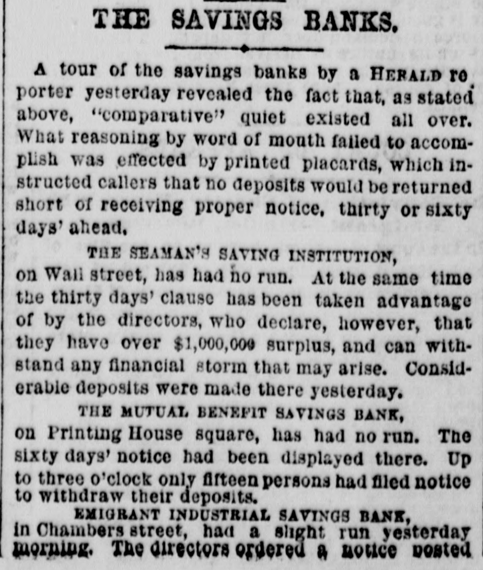THE SAVINGS BANKS UNHARMED. SEVERAL TEMPORARY RUNS-GENERAL RESTORATION OF CONFIDENCE. Among the savings banks there was little variation in yesterday's business as compared with that of Friday, Saturday, and many previous days. A few of them alone experience anything like a run upon their deposits, and these not to such an extent as to excite anyapprehension as to solvency. All were seemingly prepared for the worst, and were most agreeably disappointed as the day passed on without any invasion of moment upon their cash assets. In anticipation of a general run, members of the police force had been assigned to duty in the different savings banks, and most of them had an easy task. The German savings banks were particularly quiet, a president in one instance informing a reporter that his bank had money on hand for any of his neigh bors who might be pressed. At number of the banks the rule requiring notice of the withdrawal of deposits over a stated sum was strictly enforced, the amount varying, and it is a somewhat singular fact that those meeting all demands were the only ones, with one or two exceptions, upon which there was any considerable run. EAST RIVERSAVINGS BANK. At the East River Savings Bank, on Chambers-st there was no variation in the usual business of the day President Whitney stated that during the morning a number of deposits had been withdrawn. and likewise a large number received, in neither case to such an ex tent as to excite comment. He knew nothing of the action taken by some of the savings banks' officers Sunday evening, and could not agree with them that any particular distinction at this time should be made in the withdrawal of deposits. His bank was paying all demands without regard to notice given. EMIGRANT INDUSTRIAL SAVINGS BANK. At the Emigrant Industrial Savings Bank a considerable amount of money was withdrawn during the day. Soon after the opening of the bank a large number of the depositors assembled, and the line formed to the paying teller's windows found constant accessions during the day. Controller David Ledwith stated that they were meeting all demands without regard to amount or notice, and apprehended no difficulty in continuing to so. Indeed, the present run was not 80 extensive as they had anticipated and had made preparations for. They were led to believe that it would be of short duration. The bank statement of Jan. showed an excess over liabilities of $790,129 The majority of those closing their accounts had comparatively small deposits, 80 that the amount paid out was not large. ATLANTIC SAVINGS BANK. At the Atlantic Savings Bank, on Chatham-st. there was no excitement; still. as a precautionary move, the officers have adopted the plan of requiring sixty days' notice in the withdrawal of all sums of over $100. CITIZENS'(SAVINGS BANK. The Citizens' Savings Bank experienced something of a run during the earlier port of the day. but before closing this had almost entirely subsided. They are paying all demands under $1,000. requiring notices for larger amounts. Those in the line early in the day were mostly new depositors, the older and heavier ones having perfect confidence] in the bank. President Quintard remarked, as an evidence of the class now withdrawing their deposits, that up to p. m. probably not more than $25,000 or $30,000 had been paid over the counter. He was satisfied that no extensive run need be anticipated, but was well prepared to meet all demands. ORIENTAL SAVINGS BANK. Everything was as quiet as usual at the Oriental Savings Bank, on Grand-st. President Buckmaster stated that many had visited the bank during the day to make inquiries as to their deposits, and had departed satisfled of their security-many, perhaps, coming with the intention of drawing, and returning with only such as they required for use. In such cases no advantage was taken of the law requiring notice of such intention. As evineing a general confidence in the institution, the cashier stated that a number of new accounts had been opened during the day, and that no inconsiderable amount had been received on deposit. BOWERY SAVINGS BANK. Before the opening of the Bowery Savings Bank it was evident that a run was to be made, from the erowd of depositors that gathered around the doors. The trustees met and decided to pay all claimstor the present, believing that the run would not last long and not interfere with,the regular business. It was understood that should it continue, they should take advantage of the 60 days' notice, even then using their own discretion in the matter, and paying larger claims, to relieve suffering or inconvenience. Throughout the day and evening the steady run continued, the number at no time greatly crowding the bank. One by one they drew their deposits, losing nearly three months interest by doing 80, 80 that they alone are the losers and the bank is in no way inconvenienced. A very great many before long were convinced of this fact, returned to the bank and again deposited their money, begging that their interest might not be sacrificed. An instance of this kind was mentioned by the President. Early in the morning a woman drew about $3,000, the earning of many years. Her anxiety to withdraw it was hardly equaled by her anxiety to return it a little later, and the loss to her of the $85 interest affected her very much. The scene deterred many from following her example. The President further stated that the majority of the deposits drawn were of small amount, and that the smaller the amount the more auxious the owners seemed to be to get it, so that up to 2 o'clock in the afternoon not more than $200,000 had been paid out, and in the same proportion during the afternoon and evening. The bank had more tban 60,000 depositors. He did not anticipate any extensive run. NEW AMSTERDAM SAVINGS BANK. The New-Amsterdam Savings Bank has experienced no run from its depositors. Yesterday was a quiet day at the bank, though considerable deposits were 
