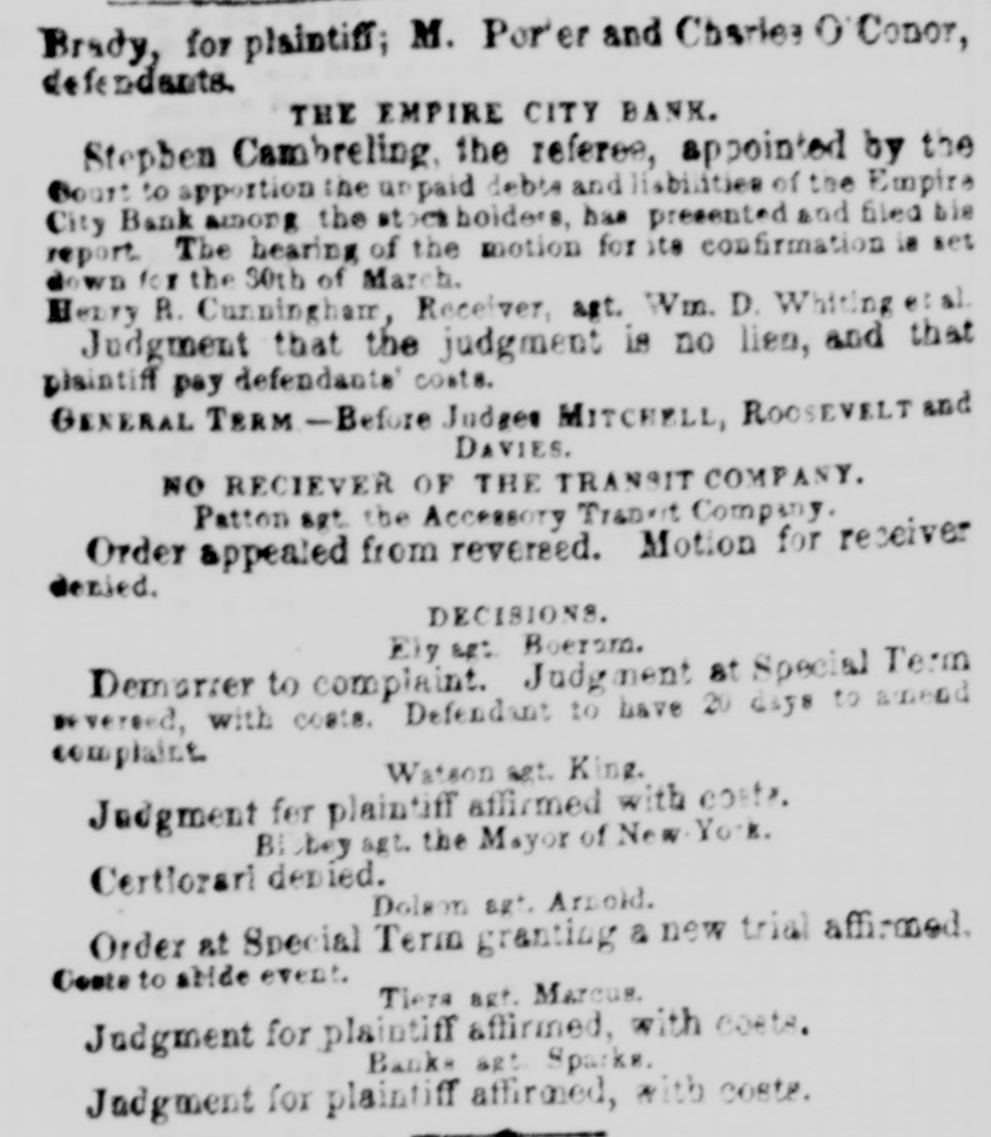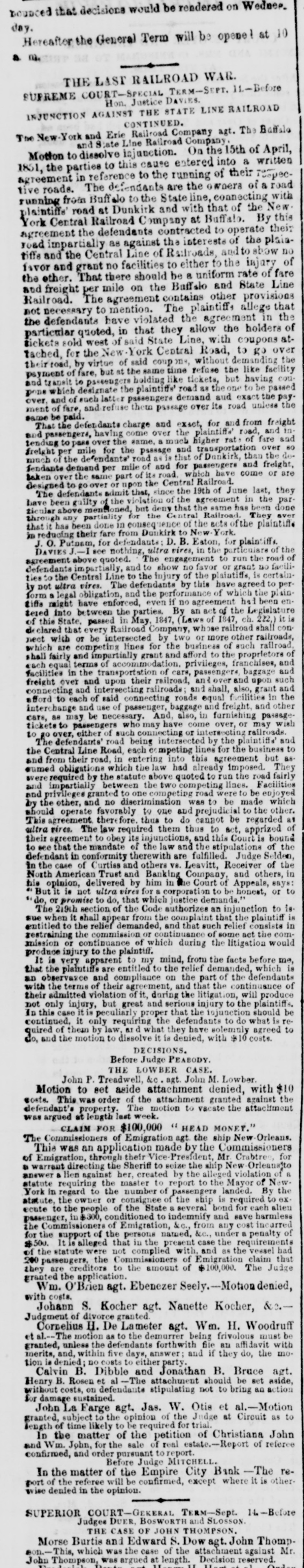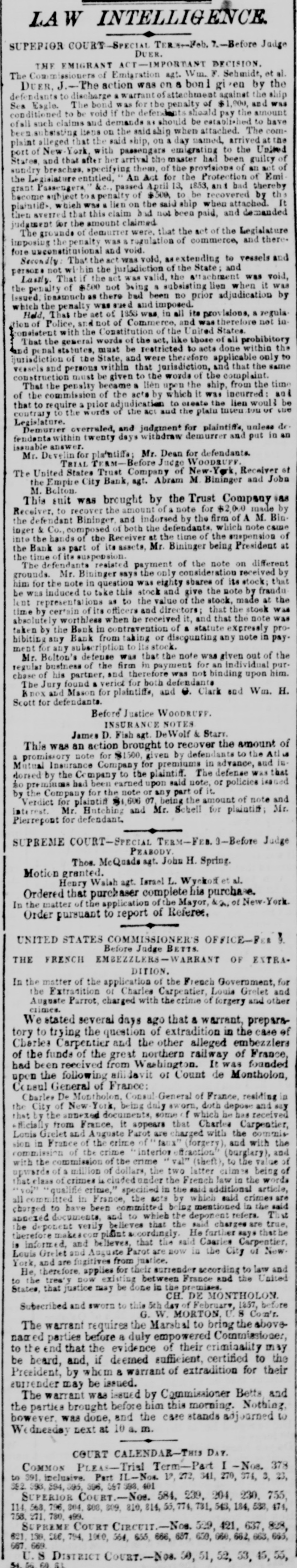 LAW INTELLIGENCE SUPERIOR COURT-SPECIAL TERM+Feb. 7.-Before Judge DUER. THE EMIGRANT ACT-IMPORTANT DECISION. The issioners of Emigration agt. Wm. F. Schmidt, et al. DUER, The action was on 8 bon gi en by the defendants to discharge a warrant of attachment against the ship Sea Eagle. The bond was for the penalty of $1,000, and was conditioned to be void if the defendent should pay the amount ofall such claims and demands as should be established to have been subsisting liens on the saidship when attached. The complaint alleged that the said ship, on a day named, arrived at the port of New York, with passengars emigrating to the United States, and that after her arrival the master had been guilty of sundry breaches. specifying them, of the provisions of an net of the Legislature entitled, An Act for the Protection of Emi grant Passengers, &c., passed April 13, 1853, an bad thereby become jeet tos penalty of $500, to be recovered by the plaintifs, which was lien on the said ship when attached. It then averred that this claim bad not been paid, and demanded judgment for the amount claimed The grounde of demurrer were, that the act of the Legialature imposing the penalty was & regulation of commerce, and therefore unconstitutional and void. Secondly That the act was void, asextending to vessels and persons not wi hin the juriadiction of the State; and Lastly. That if the act was valid, the attachment was void, the penalty of $500 not being a subsisting lien when it was issued. inasmuch as there bad been no prior adjudication by which the penalty was sued and imposed. Held, That the aet of 1858 was in all its provisions, & regula tion of Police, and not of Commerce, and wastherefore not in consistent with the Constitution of the United States. That the general words of the act, like those of all probibitory and nal statutes, must be restricted to acts done within the jurisdiction of the State, and were therefore applicable only to vessels and persons within that jurisdiction, and that the same construction must be given to the words of the complaint. That the penalty became lién upon the ship, from the time of the commission of the acts by which it was incurred: and that to require a prior adjudication to create the lien woul be contrary to the words of the act and the platu tuten tou or the Legislature. Demurrer overraled, and judgment for plaintiffs, unless de fendantswithin twenty days withdraw demurrer and put in an issuable answer. Mr. Develin for plaintiffs; Mr. Dean for defendants. TRIAL FAM-Before Judge WOODRUFF. The United States Trust Company of New-York, Receiver of the Empire City Bank, agt. Abram M Bininger and John M. Belton. This suit was brought by the Trust Company was Receiver. to recover the amount of note for made by the defendant Bininger and indorsed by the firm of A M. Bininger & Co., composed of both the defendants, which note came into the hands of the Receiver at the time of the suspension of the Bank as part of its assets, Mr. Bininger being President at the time of its suspension. The defendants resisted payment of the note on different grounds. Mr. Bininger says the only consideration received by him for the note in question was eighty sbares of its stock; that be was induced to take this stock and give the note by fraudu lent represental as to the value of the stock, made at the time by certain of its officers and directors; that the stock was absolutely worthless when be received it, and that the note was taken by the Bank in contravention of a statute expressly prohibiting any Bank from taking or discounting any note in pay. ment for any subs ription to its stock. Mr. Bolton's defense was that the note was given out of the regular business of the firm in payment for an individual purchase of his partner, and therefore was not binding upon him. The Jury found a veriet for both defendants Knox and Mason for plaintiffs, and G. Clark and Wm. H. Scott for defendants. Before' Justice WOODRUFF. INSURANCE NOTES James D. Fish agt. DeWolf & Starr. This was an action brought to recover the amount of a promissory note for $1500, given by defendants to the Atl LS Mutual Insurance Company for premiums in advance, and in dorsed by the Company to the plaintiff. The defense was that no miums had been earned upon said note, or policies issued by the Company for the note or any part of it. Verdict for plaintiff $1,606 07 being the amount of note and Interest. Mr. Hutching and Mr. Schell for plaintiff; Mr. Pierrepont for defendant. SUPREME COURT-SPECIAL TERM-FEB. 9-Before Judge PEABODY Thos. McQuads agt. John H. Spring. Motion granted. Henry Walah agt. Israel L. Wyckoff et al. Ordered that purchaser complete his purchase. In the matter of the application of the Mayor, & of New-York. Order pursuant to report of Referes. UNITED STATES COMMISSIONER'S OFFICE-FER 1. Before Judge BETTS. THE FRENCH EMBEZZLERS-WARRANT OF EXTRADITION. In the matter of the application of the French Government, for the Extradition of Charles Carpentier, Louis Grelet and Auguste Parrot, charged with crime of forgery and other crimes. We stated several days ago that & warrant, preparatory to trying the question of extradition in the case of Charles Carpentier and the other alleged embezzlera of the funds of the great northern railway of France, had been received from Washington. It was founded upon the following alli davit or Count de Montholon, Consul General of France: Charles De Montholon, Consul General of France. residing in the City of New York, being duly sworn, doth depose and say that by the annexed documents, some I which be has received efficially from France, it appears that Charles Carpentier, Louis Grelet and Auguste Parot are charged with the commission in France of the crime of taux (forgery), and with the commission of the crime interior fraction (burgiary), and with the commission of the crime val" (theft), to the Va of upwards of a million of dollars, the two latter crimes being of that clas