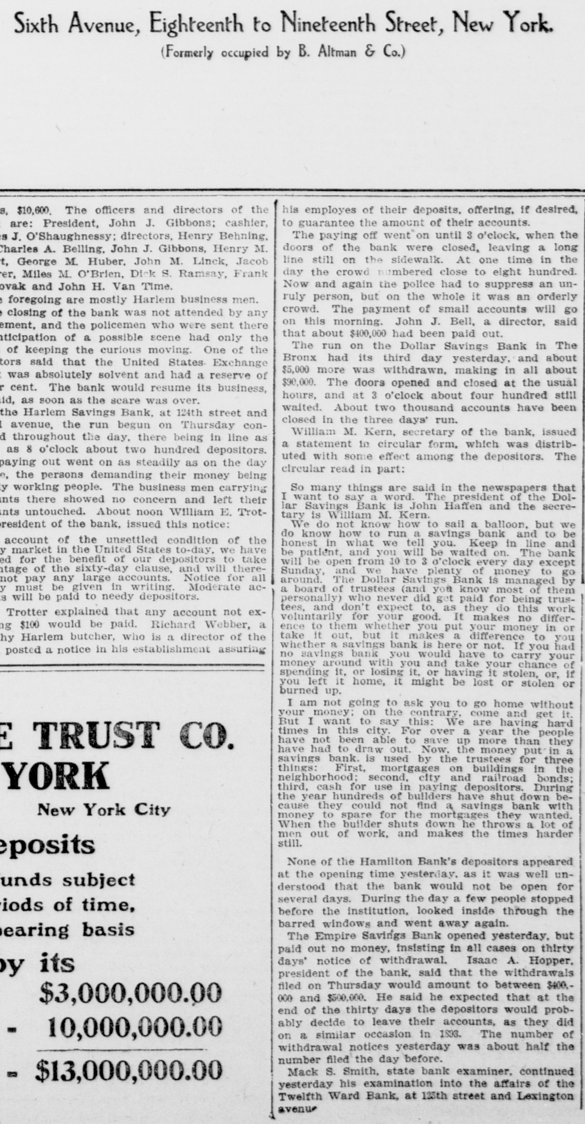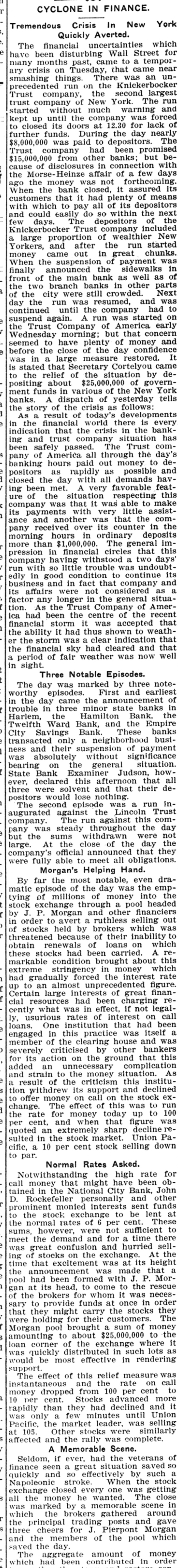 CYCLONE IN FINANCE. remendous Crisis In New Yo Quickly Averted. The financial uncertainties which been disturbing Wall Street f months past, came to a tempo crisis on Tuesday, that came nea recedented mashing rust company, things. run on the There the second Knickerbock was an large un company of New York. The rt arted without much warning an up until the company was force closed its doors at 12.30 for lack arther funds. During the day near TI 8,000,000 was paid to depositors. company had been promise 15,000,000 from other banks; but b of disclosures in connection with Morse-Heinze affair of a few da: /hen the the money that bank it was closed, had not plenty it forthcomin assured of mean I istomers which to pay all of its deposito could easily do SO within the ne: days. The depositors of tl nickerbocker Trust company include large proportion of wealthier Ne orkers, and after the run starte oney came out in great chunk /hen the suspension of payment wa nally announced the sidewalks of the main bank as well as two branch banks in other par the city were still crowded. Ne the run was resumed, and wa ontinued until the company had ispend again. A run was started o Trust Company of America ear /ednesday morning; but that concer to have plenty of money as the close of the day confidence in a large measure restored. stated that Secretary Cortelyou can the relief of the situation by de ositing about $25,000,000 of govern funds in various of the New Yo anks. A dispatch of yesterday tel story of the crisis as follows: As a result of today's developmen the financial world there is ever dication that the crisis in the banl and trust company situation ha safely passed. The Trust con any of America all through the day anking hours paid out money to de ositors as rapidly as possible an osed the day with all demands hay been met. A very favorable fea of the situation respecting th ompany was that it was able to mal payments with very little assis and another was that the con received over its counter in tl orning hours in ordinary deposi than $1,000,000. The general in ression in financial circles that th ompany having withstood a two day with so little trouble was undoub in good condition to continue i usiness and in fact that company an affairs were not considered as any longer in the general situa As the Trust Company of Ame had been the centre of the rece nancial storm it was accepted th ability it had thus shown to weat the storm was a clear indication th financial sky had cleared and th period of fair weather was now we sight. Three Notable Episodes. The day was marked by three not orthy episodes. First and earlie the day came the announcement ouble in three minor state banks tl arlem, the Hamilton Bank, welfth Ward Bank, and the Empi Savings Bank. These banl ansacted only a neighborhood bus and their suspension of payment absolutely without significan earing on the general situatio Bank Examiner Judson, hov declared this afternoon that a were solvent and that their de ositors would lose nothing. The second episode was a run in ugurated against the Lincoln Tru The against this con ompany. the was sums steady run withdrawn throughout were the da n At the close of the day tl ompany's official announced that the fully able to meet all obligation Morgan's Helping Hand. By far the most notable, even dra episode of the day was the em) of millions of money into tl tock exchange through a pool head J. P. Morgan and other financie order to avert a ruthless selling o stocks held by brokers which w: reatened because of their inability btain renewals of loans on which stocks had been carried. A r arkable condition brought about th treme stringency in money which gradually forced the interest ra ertain to resources an large almost interests had unprecedented been of charging great figur finar r ently what was in effect, if not lega usurious rates of interest on ca One institution that had be agaged in this practice was itself