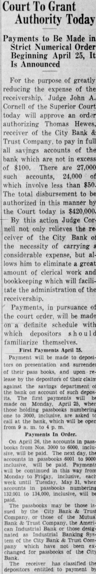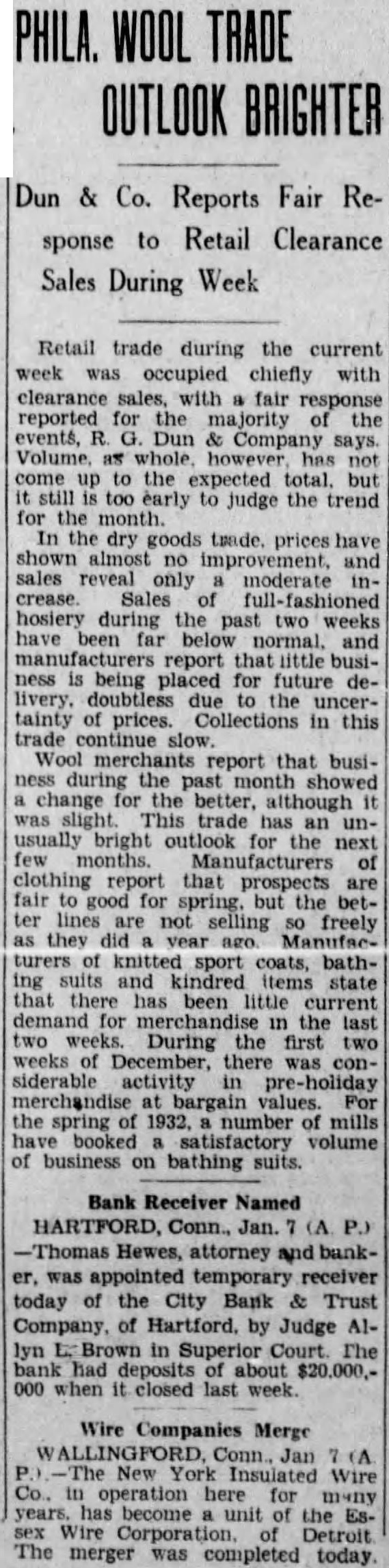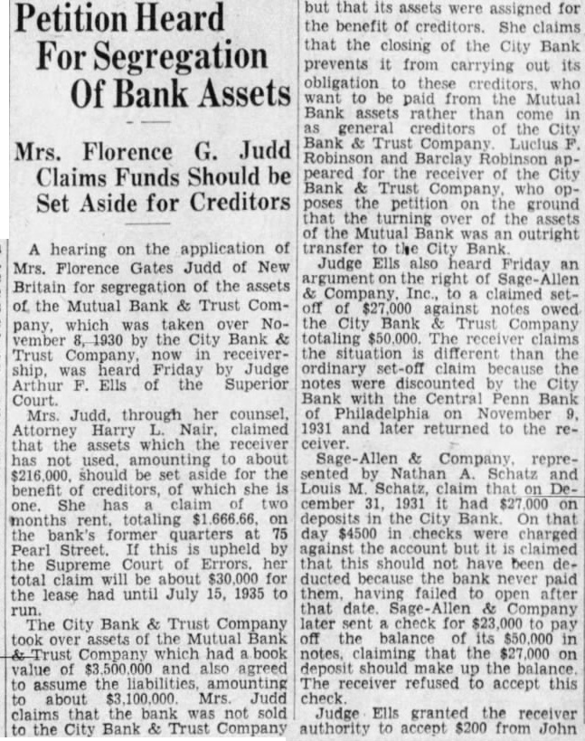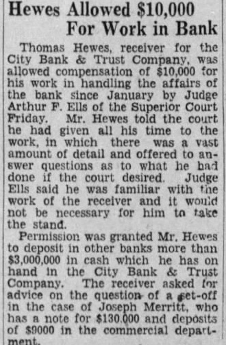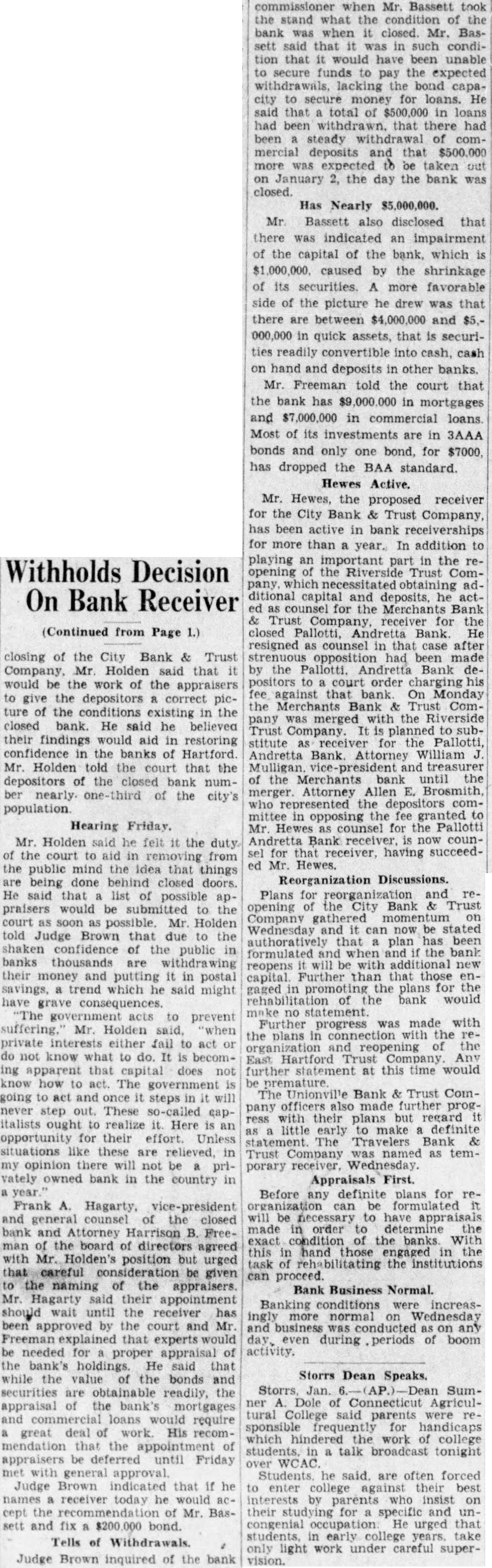Withholds Decision On Bank Receiver (Continued from Page 1.) closing of the City Bank & Trust Company, Holden that would be the work of the appraisers to give the depositors correct picture of the conditions existing the closed bank. He said he believed their findings would aid in restoring confidence in the banks Hartford Mr. Holden told the court that the depositors of the closed bank number of the city's Hearing Friday. Mr. Holden said he felt the duty of the court aid in removing from the public mind the idea that things are being done behind closed doors. He said that list of possible praisers would submitted the court as possible. Mr. Holden told Judge Brown that to the shaken confidence of the public in banks thousands their and putting in postal trend which he said might acts to prevent suffering. Mr. Holden "when private either fail to act or not know what to do. becoming apparent that capital does not know how act. The government going once steps will never step out. These so-called capitalists ought realize it. Here an opportunity for their effort. Unless situations these are in my opinion there will not be privately owned bank in the country in Frank A. Hagarty. vice-president and counsel closed bank and Attorney Harrison B. Freeman of the board of directors agreed with Mr. Holden's position but urged that careful consideration be given naming of the Mr. said their appointment should wait until the receiver has been by the court and Mr that be needed proper appraisal of the bank's holdings He said that while the value of the bonds and securities are readily, the appraisal of the bank's require great deal of His recommendation that the appointment of appraisers be deferred until Friday with general Judge Brown indicated that if he names receiver today he would accept the of Mr. Bassett and fix bond. Tells of Withdrawals. Judge Brown inquired of the bank commissioner when Mr. Bassett took the stand what the of the bank when closed. Mr. Bassett said that in such condition that would been unable to secure funds pay the expected lacking the bond capamoney for loans. He said that total of $500,000 in loans had been that had been steady withdrawal of commercial deposits and that $500,000 more be taken out on January 2, the day the bank was closed. Has Nearly $5,000,000. Mr Bassett disclosed that there was indicated an impairment of the capital of the bank, which $1,000,000. caused by the shrinkage of its securities. A more favorable side of the picture he drew was that there are between $4,000,000 and 000,000 in quick assets, that is securities readily convertible into cash, cash on hand and deposits in other banks. Mr. Freeman told the court that the bank has in mortgages and $7,000,000 in commercial loans Most of its investments are in 3AAA bonds and only one bond, for $7000. has dropped the BAA standard. Hewes Active. Mr. Hewes, the proposed receiver for the City Bank & Trust Company, has been active in bank receiverships for more than year. In addition to playing an important in the reopening the Riverside Trust Company, which ditional capital and deposits. he actas counsel the Merchants Bank Trust Company, receiver for closed Pallotti, Andretta Bank He resigned as counsel in that case after opposition had been made by the Pallotti. Bank his fee against that On Monday the Bank Company the Trust Company. is planned stitute for the Pallotti, Andretta Bank Attorney William Mulligan and treasurer of the Merchants bank until the merger Attorney Allen E. Brosmith, who represented the depositors committee in opposing the fee granted Mr. Hewes as counsel for the Pallotti Andretta Bank receiver is now counsel for receiver, having succeedMr. Reorganization Discussions. Plans for reorganization reCity Bank Trust opening Company gathered momentum Wednesday it can now be stated authoratively plan has been formulated the bank reopens with new capital Further that those gaged promoting the plans the bank would no Further progress was made with the plans in connection the reopening of the East Hartford statement at this time would The Bank Trust Comofficers also made further progress with their plans but regard little early to make definite statement The Travelers Bank Trust Company named as temporary receiver. Wednesday. Appraisals First. Before definite plans for can be formulated be to have appraisals made in order determine the exact condition the banks With this hand those in the the institutions can Bank Business Normal. Banking conditions were increasmore normal and any day, during periods of boom activity. Storrs Dean Speaks. Storrs, Jan. SumDole Connecticut Agricultural College said parents were sponsible for handicaps which hindered the work college students. talk broadcast tonight WCAC. Students he said. are often forced enter college against best interests by on their for specific and un congenial occupation He urged that early take only light work under careful supervision.