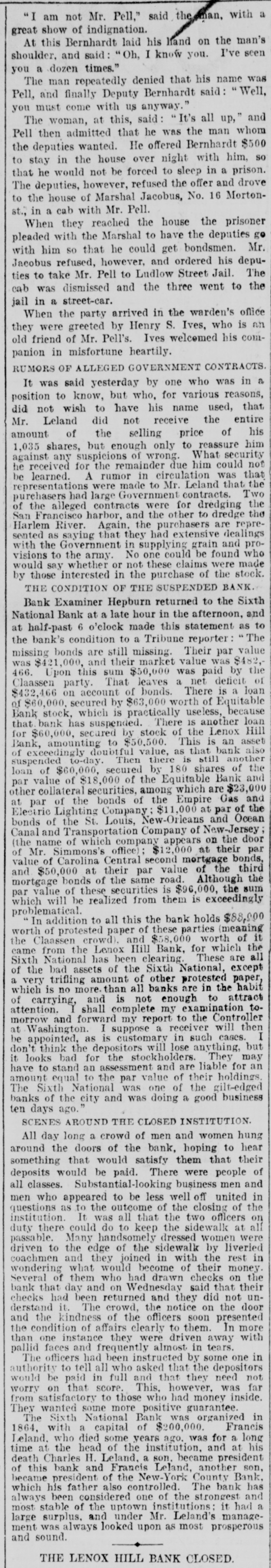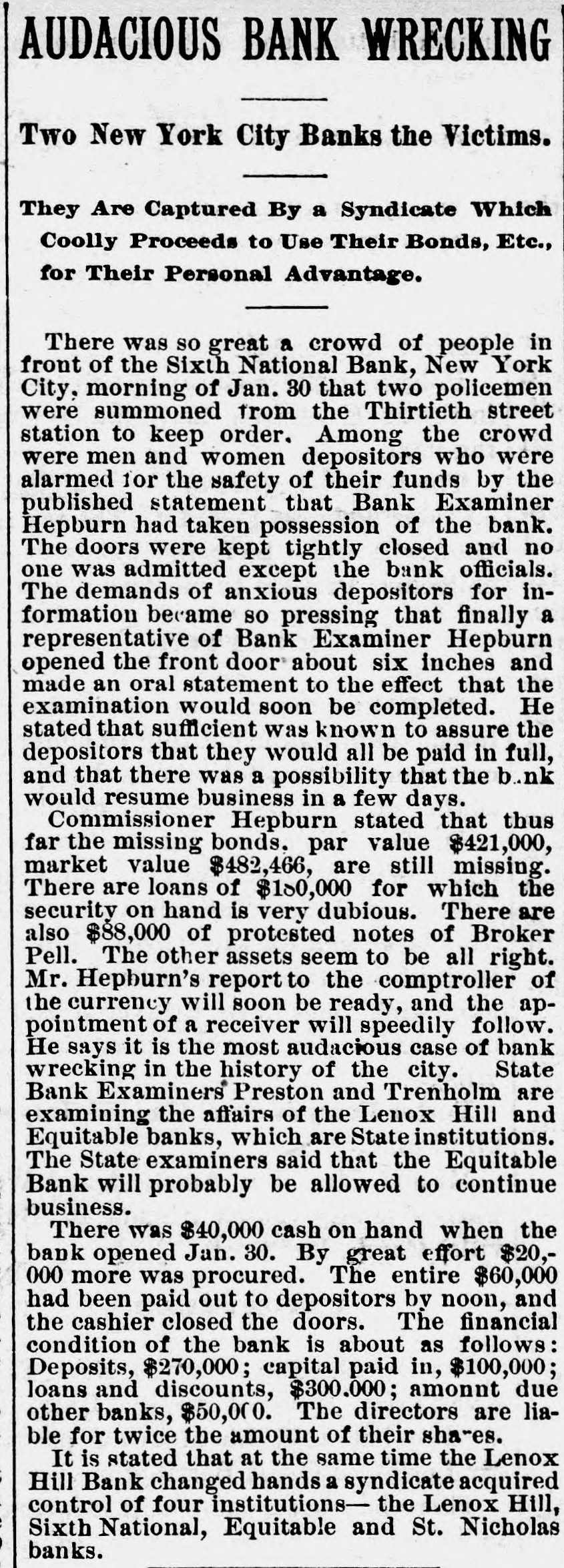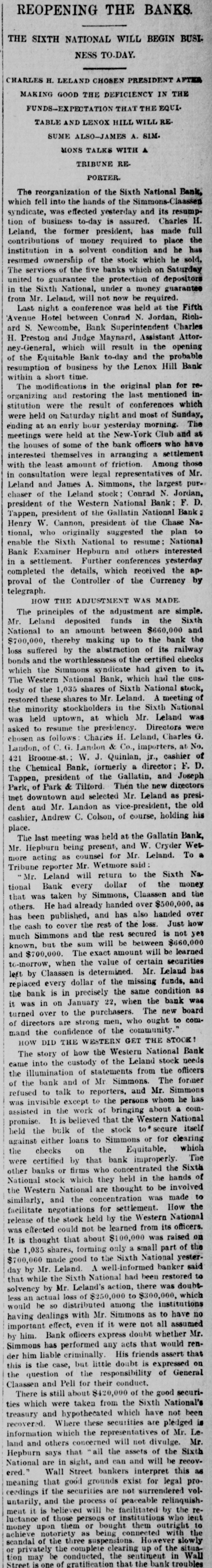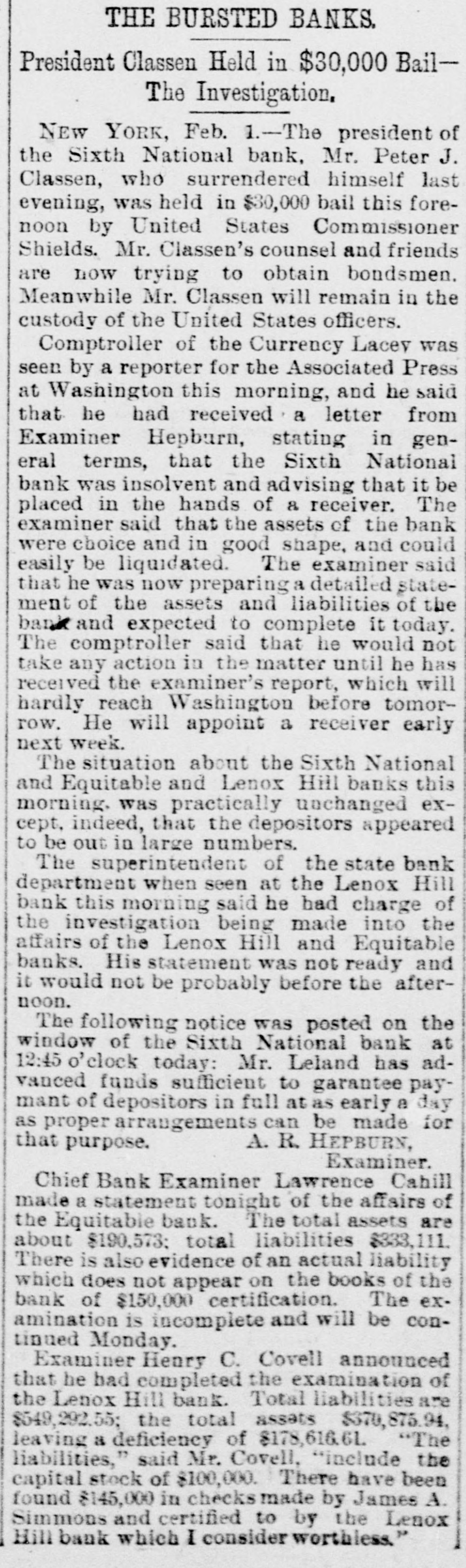 (SPECIAL TELEGRAM TO THE DISPATCH.] NEW YORK, February 1.-The depositors of the Sixth National Bank were comforted to-day by hearing that they would get their money. The assurance was backed up by a check for half a million dollars from Charles K. Leland, the ex-President of the bank, who sold his shares in the bank for $650,000, and turned over the bank and its assets to the enterprising financiers who emptied its safe. A syndicate of five powerful banks has come to the front, and will make advances on the bank's quick assets, in the shape of bonds and other securities now in the possession of A. B. Hepburn, the National Bank Examiner. According to the best authority the face value of these securities is $1,774,000, so that with the aid of Mr. Leland's check for $500,000, it is pretty certain that the obligations to the depositors, amounting to $1,800,000, will be met. It will take several months to bring about this liquidation, and as it is scarcely to be presumed that the syndicate of banks has come to the rescue from purely philanthropic motives, it may be that Mr. Leland will be called on for a further contribution. A RECEIVER TO COME. The Controller of the Currency said at Washington to-day that Examiner Hepburn, in a letter sent on Friday, had pronounced the bank insolvent, and had advised the appointment of a receiver. A receiver would be appointed early next week, alter the Controller had received Mr. Hepburn's report, which will hardly reach him before Monday. This was probably said, however, before to-day's news had reached the Controller, and it may be that the expenses of a receivership will be avoided. It is not yet definitely known how the minority stockholders will come out. Mr. Leland and his friends say that everything possible will be done for the stockholders alter the depositors have been taken care of. F. D. Tappen, President of the Gallatin Bank, who says he has worn out a set of teeth talking about this case, is authority for the statement that Mr. Leland's check for $500,000 is only preliminary, and that more will be forthcoming from him, if it is necessary. SOMETHING SOOTHING. Early in the day there were indications at the Sixth National that something interesting and soothing was to happen. The Bank Examiner had passed half the night locked up in the bank with his assistants, and had completed his investigation and sent his report to Washington. With him at the bank, to-day, were Mr. Tappen and Mr. Wetmore, the latter counsel for Mr. Leland, At 11:30 this notice was put up: Mr. Leland has advanced funds sufficient to guarantee payments of depositors in full, at as early a date as proper arrangements can be made for that purpose. A. B. HEPBURN, Bank Examiner. The banks in the syndicate formed to take the assets and pay depositors are the Gallatin, the American Exchange, the Chemical, the Merchants and the Bank of Commerce. They are to make advances on the securities now in the possession of the Bank Examiner, taking the securities as collateral. It is the intention that, as fast as the depositors are paid, they shall sign a release of all claims against Mr. Leland. Mr. Tappen says that under the arrangement, as at present agreed upon, Mr. Leland will take everything that is left after the syndicate has settled with the depositors, and the syndicate itself has been settled with, and with other advances, if necessary, from bis own bank account, make a just and equitable settlement with the minority stockholders. Mr. Tappen's figures make the actual loss of the bank to be $700,000, as it was given in THE DISPATCH on Friday. MIDNIGHT STATEMENT. At midnight the following statement of the affairs of the Equitable Bank was given out by Chief Examiner Lawrence F. Cahill: I find commercial paper, commonly called loans and discounts, amounting to $151,823, a portion of which seems to be secured by nominal collaterals, at the value of which I have not yet determined. Also, United States bonds deposited with the banking department, as a guarantee of good faith, the market value of which is $1,240. The cash on hand is $2,295, and the furniture and fixtures, including the safe, estimated to be worth $500. There is due from banks the sum of $234 50, making a total assests of $160.593. There are said to be 300 shares of Sixth National Bank stock hypothecated with another bank, the par value of which is $30,000, the market value of which I have not yet determined. This will make the total $190,593. The liabilities are: Capital, $100,000; certified checks, $4,435; due depositors. $31,118; due banks a (items not yet proven), $198,593. This shows deficit of $143,553. There is also evidence of an actual liability which does not appear ou the books of the bank of $150,000 certification. The examination is incomplete, and will be continued Monday. LENOX BANK FIGURES. At the same hour Examiner Henry C. Covell announced that he had that evening reported an examination of the Lenox Hill Bank. The liabilities are $549,292 55; the total assets, $370,675 94, leaving a deficit of $178,616 61. "The liabilities, said Mr. Covell, "include the capital stock of $100,000. The assets on hand I have reduced to a conservative point, and feel confident that the depositors will receive 70 to 75 per cent on their claims. There have been found in the bank $145,000 in checks made by James A. Simmons, and certified to by the Lenox Hill Bank, which I consider worthless." An Albany paper this evening says: P.J. Claassen, the wrecker of the Sixth National Bank, in New York, is a former Albanian, at one time keeping a saloon on Upper Broadway, near the New York Central Railroad viaduct. When he went to New York. some 20 years ago. he had little or no money, and gave no promise of unusual financial genius. WOMEN AT WEDDINGS.