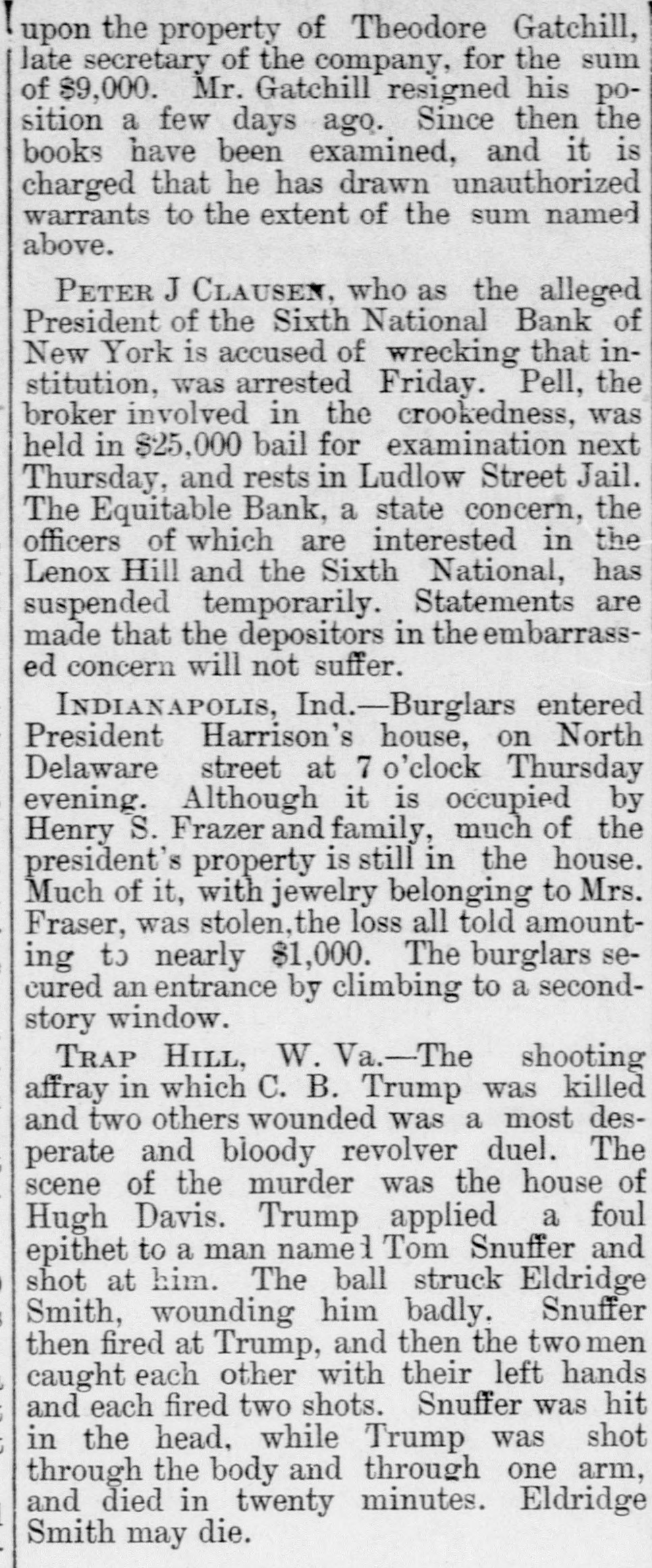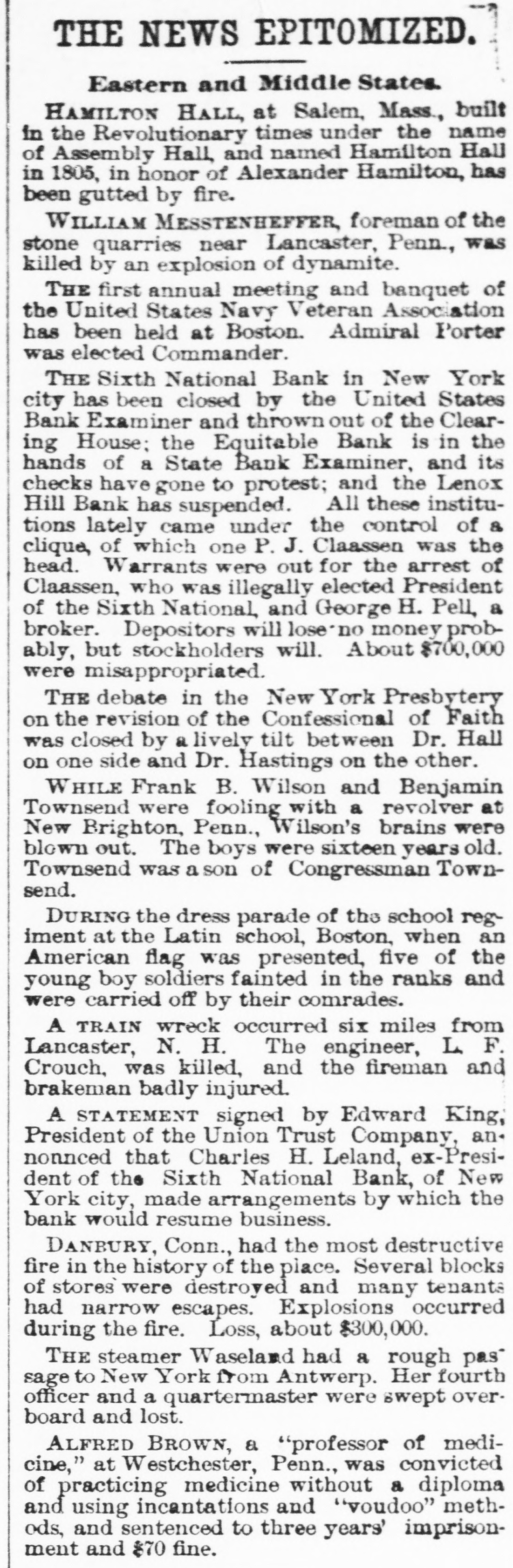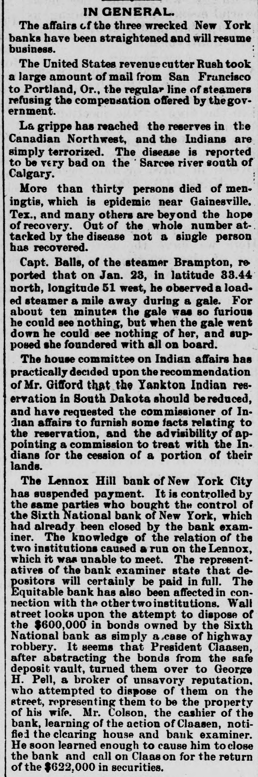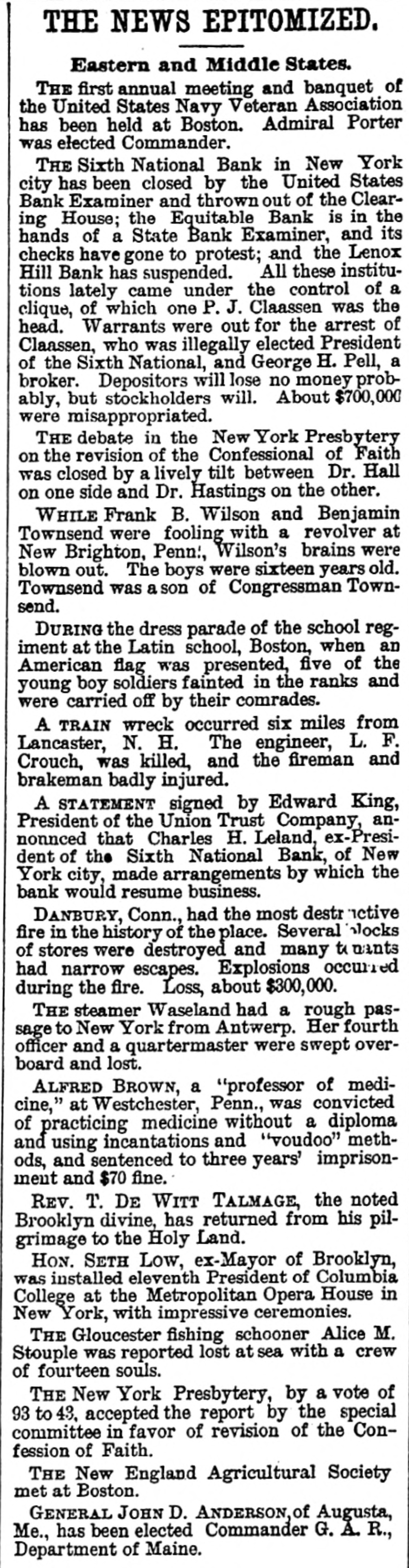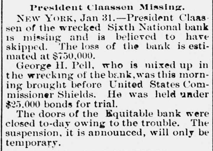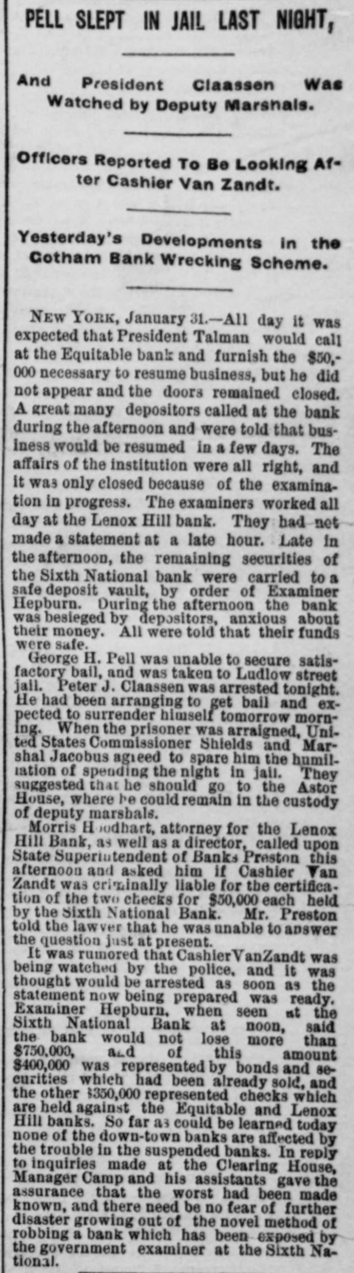 (SPECIAL TELEGRAM TO THE DISPATCH.] NEW YORK, February 1.-The depositors of the Sixth National Bank were comforted to-day by hearing that they would get their money. The assurance was backed up by a check for half a million dollars from Charles K. Leland, the ex-President of the bank, who sold his shares in the bank for $650,000, and turned over the bank and its assets to the enterprising financiers who emptied its safe. A syndicate of five powerful banks has come to the front, and will make advances on the bank's quick assets, in the shape of bonds and other securities now in the possession of A. B. Hepburn, the National Bank Examiner. According to the best authority the face value of these securities is $1,774,000, so that with the aid of Mr. Leland's check for $500,000, it is pretty certain that the obligations to the depositors, amounting to $1,800,000, will be met. It will take several months to bring about this liquidation, and as it is scarcely to be presumed that the syndicate of banks has come to the rescue from purely philanthropic motives, it may be that Mr. Leland will be called on for a further contribution. A RECEIVER TO COME. The Controller of the Currency said at Washington to-day that Examiner Hepburn, in a letter sent on Friday, had pronounced the bank insolvent, and had advised the appointment of a receiver. A receiver would be appointed early next week, alter the Controller had received Mr. Hepburn's report, which will hardly reach him before Monday. This was probably said, however, before to-day's news had reached the Controller, and it may be that the expenses of a receivership will be avoided. It is not yet definitely known how the minority stockholders will come out. Mr. Leland and his friends say that everything possible will be done for the stockholders alter the depositors have been taken care of. F. D. Tappen, President of the Gallatin Bank, who says he has worn out a set of teeth talking about this case, is authority for the statement that Mr. Leland's check for $500,000 is only preliminary, and that more will be forthcoming from him, if it is necessary. SOMETHING SOOTHING. Early in the day there were indications at the Sixth National that something interesting and soothing was to happen. The Bank Examiner had passed half the night locked up in the bank with his assistants, and had completed his investigation and sent his report to Washington. With him at the bank, to-day, were Mr. Tappen and Mr. Wetmore, the latter counsel for Mr. Leland, At 11:30 this notice was put up: Mr. Leland has advanced funds sufficient to guarantee payments of depositors in full, at as early a date as proper arrangements can be made for that purpose. A. B. HEPBURN, Bank Examiner. The banks in the syndicate formed to take the assets and pay depositors are the Gallatin, the American Exchange, the Chemical, the Merchants and the Bank of Commerce. They are to make advances on the securities now in the possession of the Bank Examiner, taking the securities as collateral. It is the intention that, as fast as the depositors are paid, they shall sign a release of all claims against Mr. Leland. Mr. Tappen says that under the arrangement, as at present agreed upon, Mr. Leland will take everything that is left after the syndicate has settled with the depositors, and the syndicate itself has been settled with, and with other advances, if necessary, from bis own bank account, make a just and equitable settlement with the minority stockholders. Mr. Tappen's figures make the actual loss of the bank to be $700,000, as it was given in THE DISPATCH on Friday. MIDNIGHT STATEMENT. At midnight the following statement of the affairs of the Equitable Bank was given out by Chief Examiner Lawrence F. Cahill: I find commercial paper, commonly called loans and discounts, amounting to $151,823, a portion of which seems to be secured by nominal collaterals, at the value of which I have not yet determined. Also, United States bonds deposited with the banking department, as a guarantee of good faith, the market value of which is $1,240. The cash on hand is $2,295, and the furniture and fixtures, including the safe, estimated to be worth $500. There is due from banks the sum of $234 50, making a total assests of $160.593. There are said to be 300 shares of Sixth National Bank stock hypothecated with another bank, the par value of which is $30,000, the market value of which I have not yet determined. This will make the total $190,593. The liabilities are: Capital, $100,000; certified checks, $4,435; due depositors. $31,118; due banks a (items not yet proven), $198,593. This shows deficit of $143,553. There is also evidence of an actual liability which does not appear ou the books of the bank of $150,000 certification. The examination is incomplete, and will be continued Monday. LENOX BANK FIGURES. At the same hour Examiner Henry C. Covell announced that he had that evening reported an examination of the Lenox Hill Bank. The liabilities are $549,292 55; the total assets, $370,675 94, leaving a deficit of $178,616 61. "The liabilities, said Mr. Covell, "include the capital stock of $100,000. The assets on hand I have reduced to a conservative point, and feel confident that the depositors will receive 70 to 75 per cent on their claims. There have been found in the bank $145,000 in checks made by James A. Simmons, and certified to by the Lenox Hill Bank, which I consider worthless." An Albany paper this evening says: P.J. Claassen, the wrecker of the Sixth National Bank, in New York, is a former Albanian, at one time keeping a saloon on Upper Broadway, near the New York Central Railroad viaduct. When he went to New York. some 20 years ago. he had little or no money, and gave no promise of unusual financial genius. WOMEN AT WEDDINGS.
