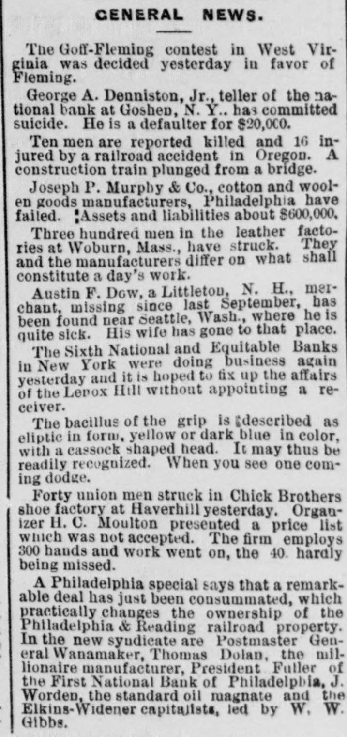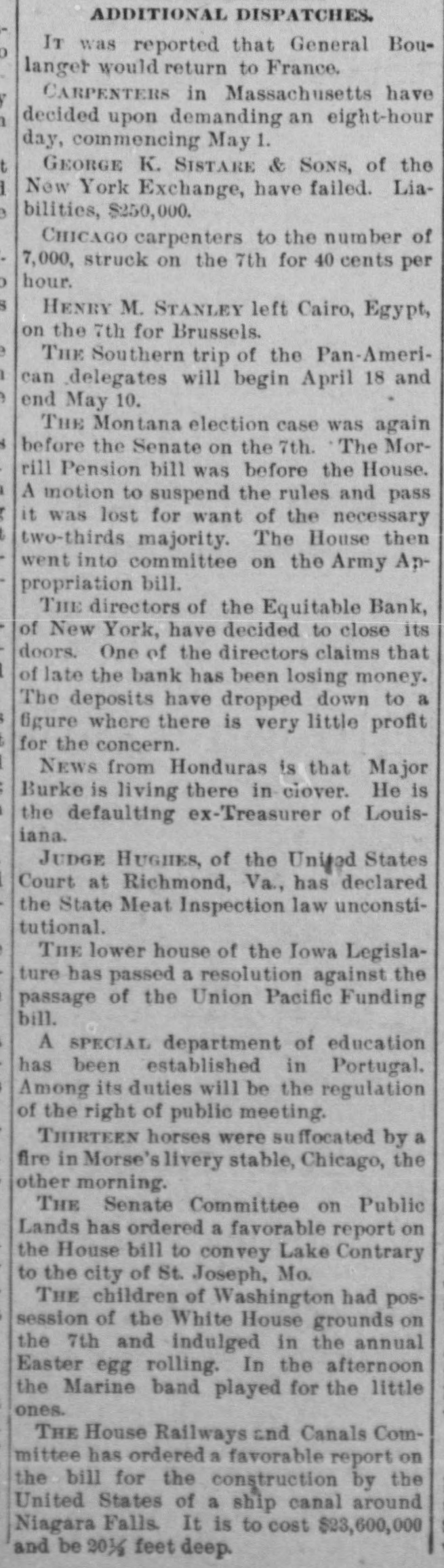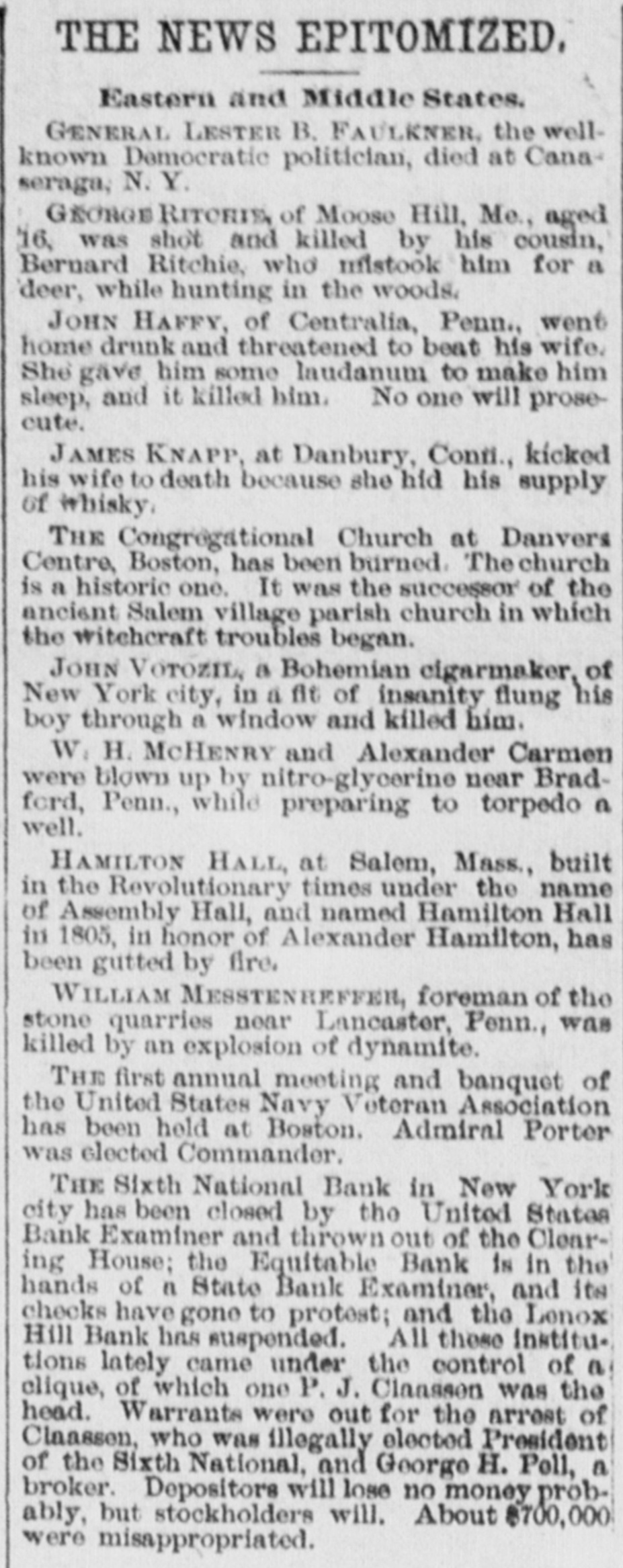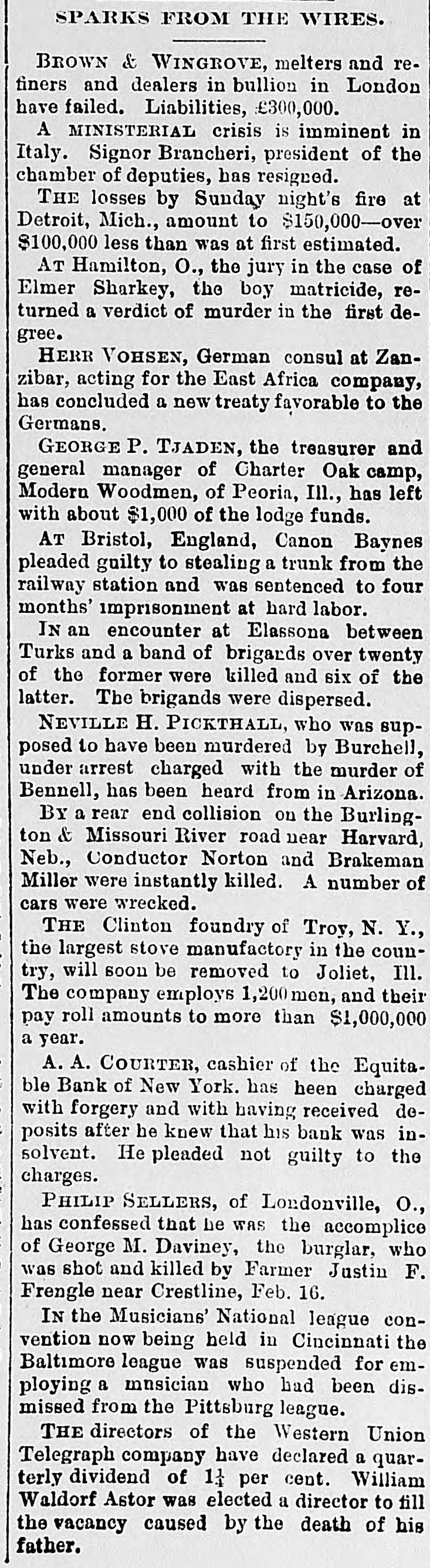 (SPECIAL TELEGRAM TO THE DISPATCH.] NEW YORK, February 1.-The depositors of the Sixth National Bank were comforted to-day by hearing that they would get their money. The assurance was backed up by a check for half a million dollars from Charles K. Leland, the ex-President of the bank, who sold his shares in the bank for $650,000, and turned over the bank and its assets to the enterprising financiers who emptied its safe. A syndicate of five powerful banks has come to the front, and will make advances on the bank's quick assets, in the shape of bonds and other securities now in the possession of A. B. Hepburn, the National Bank Examiner. According to the best authority the face value of these securities is $1,774,000, so that with the aid of Mr. Leland's check for $500,000, it is pretty certain that the obligations to the depositors, amounting to $1,800,000, will be met. It will take several months to bring about this liquidation, and as it is scarcely to be presumed that the syndicate of banks has come to the rescue from purely philanthropic motives, it may be that Mr. Leland will be called on for a further contribution. A RECEIVER TO COME. The Controller of the Currency said at Washington to-day that Examiner Hepburn, in a letter sent on Friday, had pronounced the bank insolvent, and had advised the appointment of a receiver. A receiver would be appointed early next week, alter the Controller had received Mr. Hepburn's report, which will hardly reach him before Monday. This was probably said, however, before to-day's news had reached the Controller, and it may be that the expenses of a receivership will be avoided. It is not yet definitely known how the minority stockholders will come out. Mr. Leland and his friends say that everything possible will be done for the stockholders alter the depositors have been taken care of. F. D. Tappen, President of the Gallatin Bank, who says he has worn out a set of teeth talking about this case, is authority for the statement that Mr. Leland's check for $500,000 is only preliminary, and that more will be forthcoming from him, if it is necessary. SOMETHING SOOTHING. Early in the day there were indications at the Sixth National that something interesting and soothing was to happen. The Bank Examiner had passed half the night locked up in the bank with his assistants, and had completed his investigation and sent his report to Washington. With him at the bank, to-day, were Mr. Tappen and Mr. Wetmore, the latter counsel for Mr. Leland, At 11:30 this notice was put up: Mr. Leland has advanced funds sufficient to guarantee payments of depositors in full, at as early a date as proper arrangements can be made for that purpose. A. B. HEPBURN, Bank Examiner. The banks in the syndicate formed to take the assets and pay depositors are the Gallatin, the American Exchange, the Chemical, the Merchants and the Bank of Commerce. They are to make advances on the securities now in the possession of the Bank Examiner, taking the securities as collateral. It is the intention that, as fast as the depositors are paid, they shall sign a release of all claims against Mr. Leland. Mr. Tappen says that under the arrangement, as at present agreed upon, Mr. Leland will take everything that is left after the syndicate has settled with the depositors, and the syndicate itself has been settled with, and with other advances, if necessary, from bis own bank account, make a just and equitable settlement with the minority stockholders. Mr. Tappen's figures make the actual loss of the bank to be $700,000, as it was given in THE DISPATCH on Friday. MIDNIGHT STATEMENT. At midnight the following statement of the affairs of the Equitable Bank was given out by Chief Examiner Lawrence F. Cahill: I find commercial paper, commonly called loans and discounts, amounting to $151,823, a portion of which seems to be secured by nominal collaterals, at the value of which I have not yet determined. Also, United States bonds deposited with the banking department, as a guarantee of good faith, the market value of which is $1,240. The cash on hand is $2,295, and the furniture and fixtures, including the safe, estimated to be worth $500. There is due from banks the sum of $234 50, making a total assests of $160.593. There are said to be 300 shares of Sixth National Bank stock hypothecated with another bank, the par value of which is $30,000, the market value of which I have not yet determined. This will make the total $190,593. The liabilities are: Capital, $100,000; certified checks, $4,435; due depositors. $31,118; due banks a (items not yet proven), $198,593. This shows deficit of $143,553. There is also evidence of an actual liability which does not appear ou the books of the bank of $150,000 certification. The examination is incomplete, and will be continued Monday. LENOX BANK FIGURES. At the same hour Examiner Henry C. Covell announced that he had that evening reported an examination of the Lenox Hill Bank. The liabilities are $549,292 55; the total assets, $370,675 94, leaving a deficit of $178,616 61. "The liabilities, said Mr. Covell, "include the capital stock of $100,000. The assets on hand I have reduced to a conservative point, and feel confident that the depositors will receive 70 to 75 per cent on their claims. There have been found in the bank $145,000 in checks made by James A. Simmons, and certified to by the Lenox Hill Bank, which I consider worthless." An Albany paper this evening says: P.J. Claassen, the wrecker of the Sixth National Bank, in New York, is a former Albanian, at one time keeping a saloon on Upper Broadway, near the New York Central Railroad viaduct. When he went to New York. some 20 years ago. he had little or no money, and gave no promise of unusual financial genius. WOMEN AT WEDDINGS.
