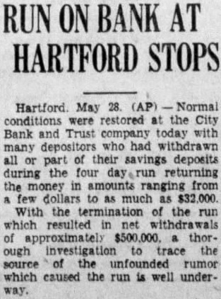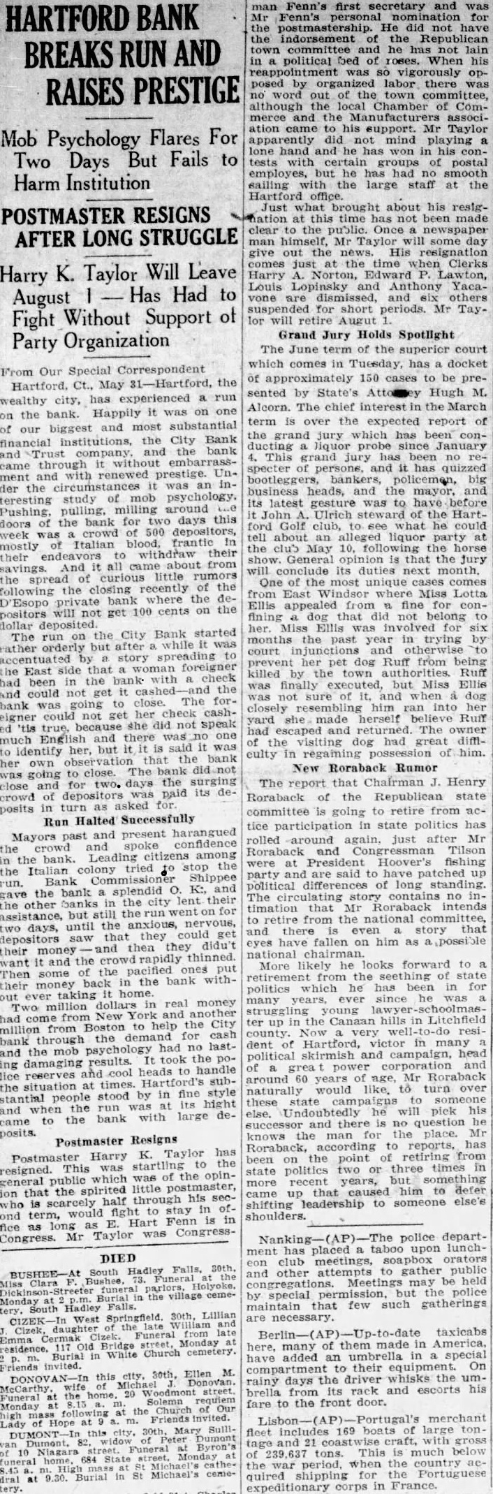From Our Special Correspondent Hartford. Ct., May 31-Hartford, the wealthy city, has experienced run on the bank. Happily it was on one our biggest and most substantial financial institutions, the City Bank Trust company. and the bank came through without ment and with renewed prestige. Under the was teresting study mob psychology. Pushing. pulling. milling around doors of the bank for two days this week was crowd 500 depositors, mostly Italian blood, frantic in their endeavors to withdraw their savings. And it all from spread of little following the closing recently of the D'Esopo bank where the positors will not get 100 cents on the dollar deposited. The run on the City Bank started rather orderly but after while accentuated by story spreading to the East side that woman foreigner had been in the bank check and could not get it cashed the bank was going to close. The foreigner could not get her check cashed true. she did not speak much English and there was one to identify her, but it said was her own that the bank was going to close. The bank close for two. days the surging decrowd of depositors paid its posits in turn as asked Run Halted Successfully Mayors past and present harangued confidence crowd and spoke in the the bank. Leading among the Italian colony tried to Shippee the run. the bank splendid city O. lent K:, their and other banks in the assistance, but still the run went on for two days, until the anxious, nervous, depositors that they could didu't get and then they money their want and the thinned. put the pacified Then some the bank withback in their money out taking million dollars in and real another money from New York had come to help the City from Boston million bank through the for cash and the mob psychology had no the last- potook ing damaging results. heads to handle reserves lice the situation at times. Hartford's substantial people stood by in fine hight style at its the run and with large deto the bank came posits.