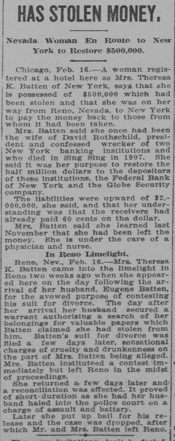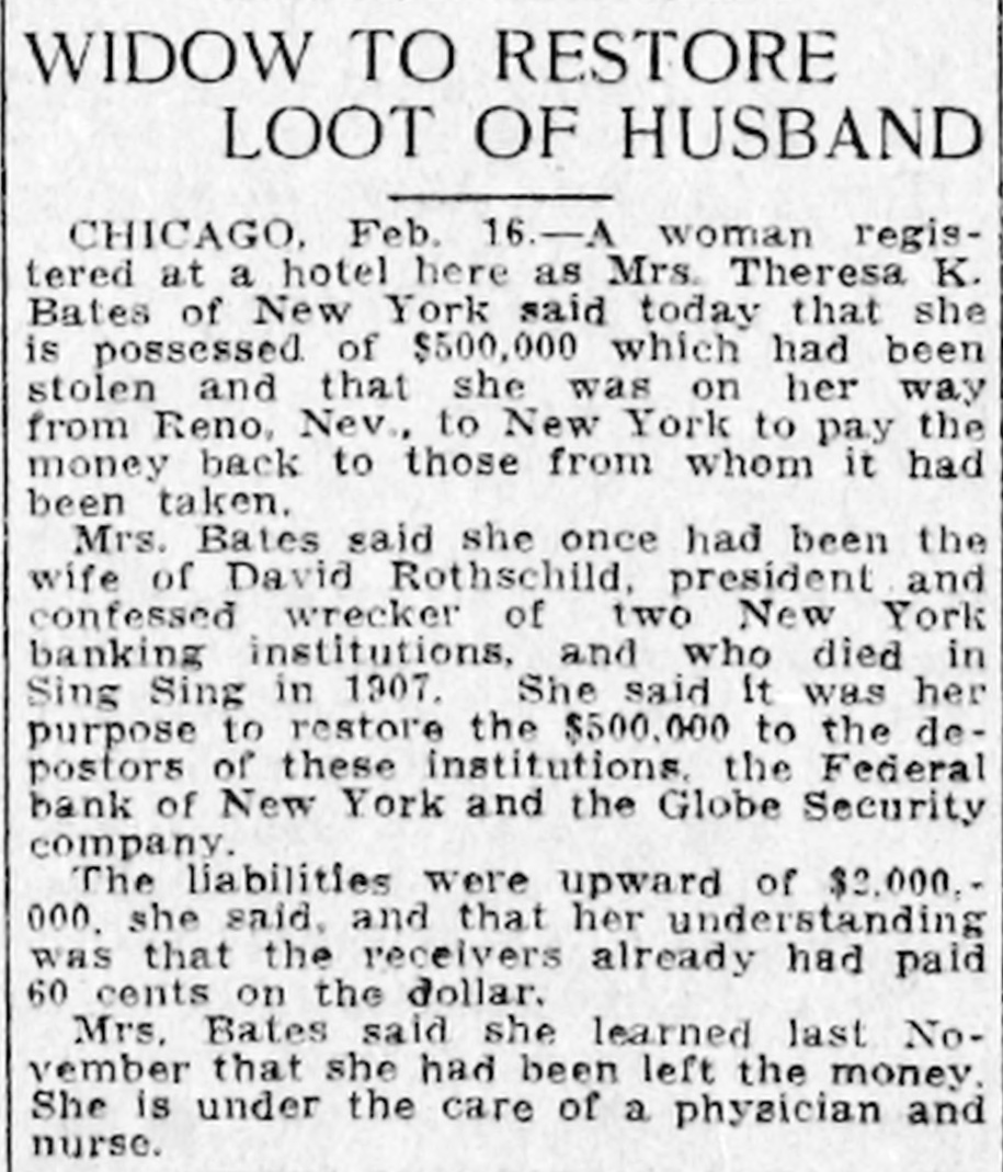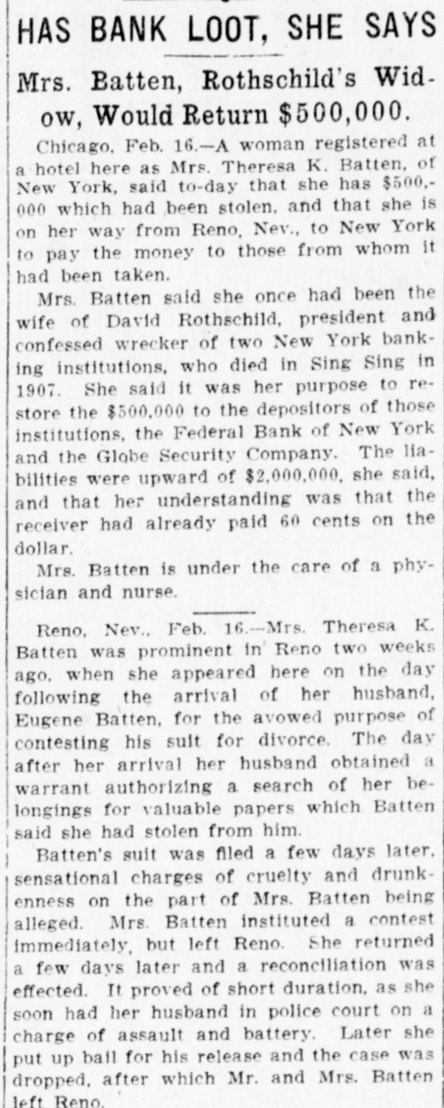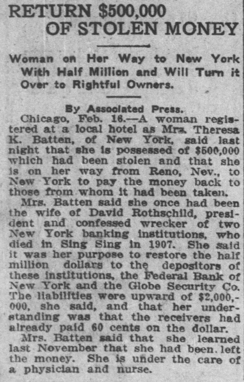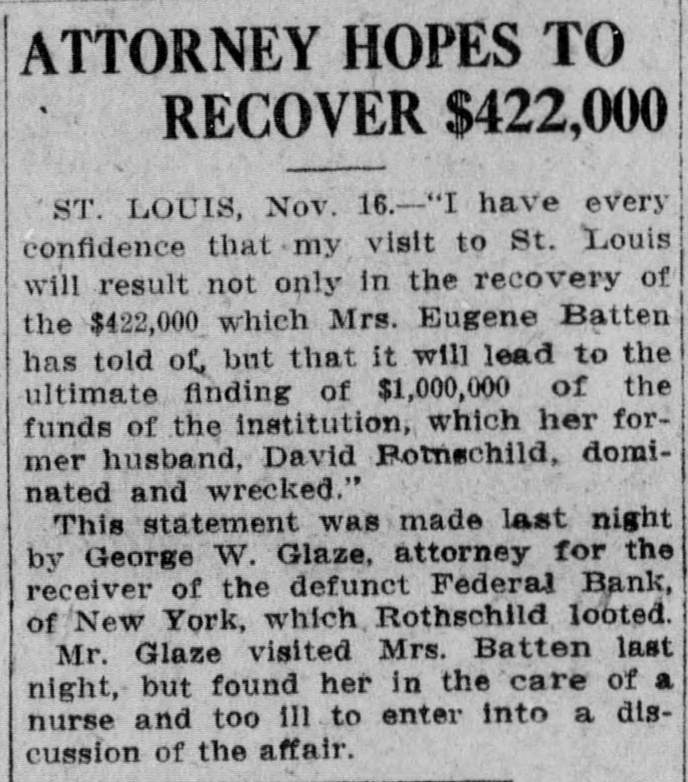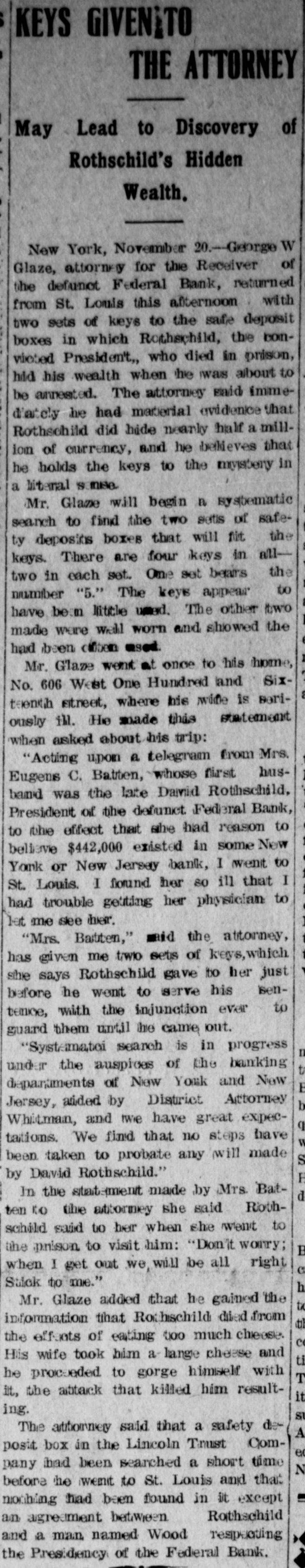 KEYS GIVENITO THE ATTORNEY May Lead to Discovery of Rothschild's Hidden Wealth. New York, November 20.-George W Glaze, attorney for the Receiver of the defunct Federal Bank, returned from St. Louis this afternoon with two sets of keys to the safe deposit boxes in which Rothschild, the comvicioned President,, who died in prison, hid his wealth when the was about to be annested. The attorney said immediately he had material avidence that Rothschild did hide nearly half a million of currency, and he believes that he holds the keys to the mystery in a literal samse. Mr. Glaze will begin n systematic search to find the two setts of safety deposits boxes that will fit the keys. There are four keys in alltwo in each set. One set bears the number "5." The keys appear to have been Ifititle used. The other two made were well worn and showed the had been cititen used. Mr. Glaze went at once to his home, No. 606 West One Hundred and Sixor telenth street, where his wide is seriously ill. (He made this statement when asked about his trip: "Acting upon a telegram from Mrs. Eugens C. Batten, whose first husband was the late David Rothschild, President of the defunct Federal Bank, to the effect that she had reason to believe $442,000 existed in some New York or New Jersey bank, I went to St. Louis. I flound her so ill that I had trouble getting her physician to let me slee her. "Mrs. Batten," maid the attorney, has given me trwo sets of keys,which she says Rothschild gave to her just before he went to serve his sentence, with the injunction ever to guard them until the came out. "Systematei search is in progress n under the auspices of the banking t departments of New York and New E Jersey, added by District Attorney b Whitman, and twie have great expecq tations. We find that no steps have been taken to probate any will made S by David Rothschild." H In the statement made by Mrs. Batd ten to the abtormey she said Rothschild said to her when she went to the prison to visit him: "Don't worry; B when I get out we, will be all right C Stick tome." h Mr. Glaze added that he gained the to information that Rothschild dived from till the effects of eating too much cheose. ce His wife took him a lange cheese and ti he proceeded to gorge himself with T it, the abtaick that killed him resultit ing. St The attionney said that a safety deA posit box in the Lincoln Trust Comec pany had been searched a short time N before he went to St. Louis and that II mothing had been found in it except an agreement between Rothschild and a man named Wood respecting X the Presidency of the Federal Bank. j