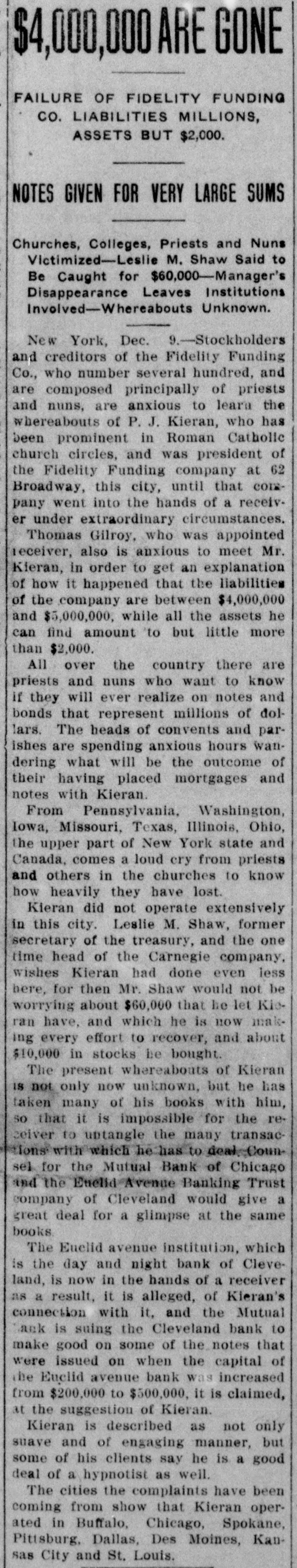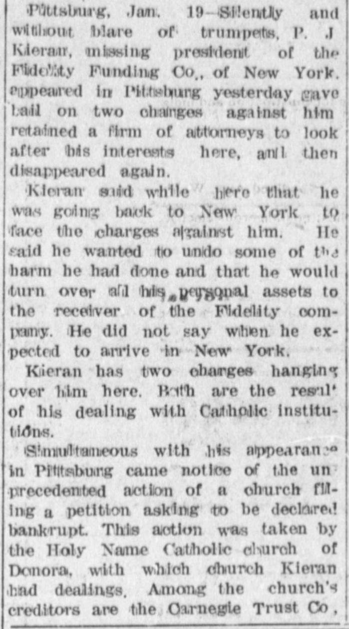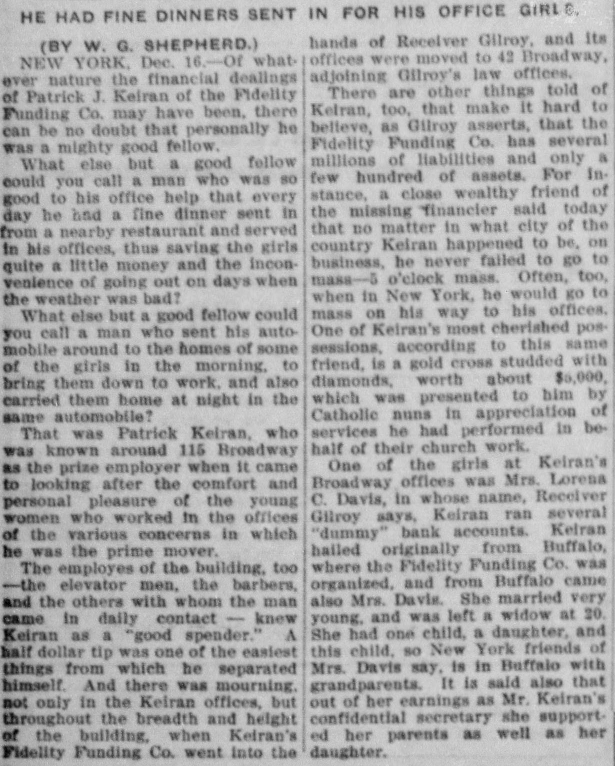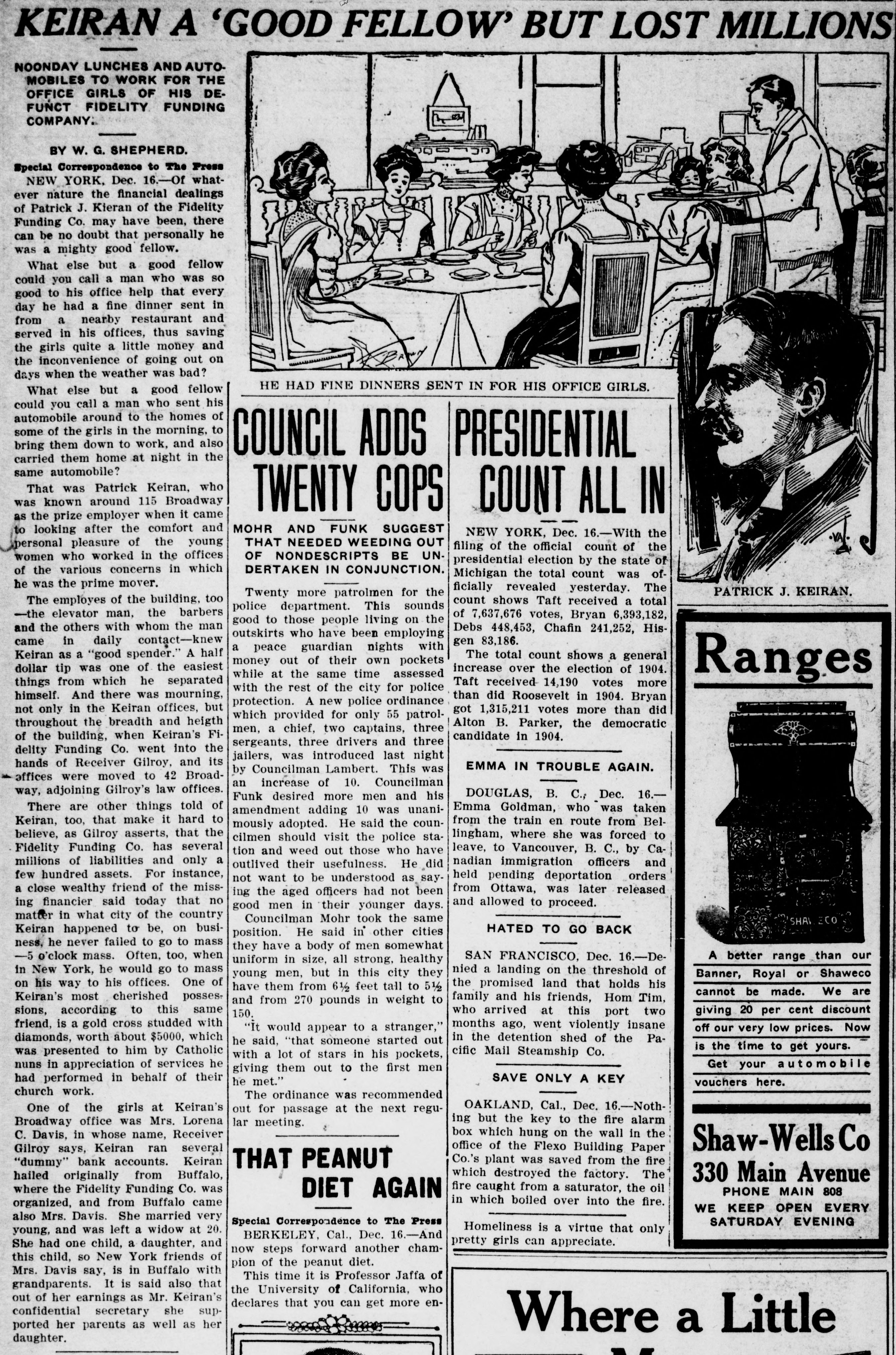 KEIRAN A 'GOOD FELLOW' BUT LOST MILLIONS NOONDAY LUNCHES AND AUTOMOBILES TO WORK FOR THE OFFICE GIRLS OF HIS DEFUNCT FIDELITY FUNDING COMPANY. BY W. G. SHEPHERD. Special Correspondence to The Press NEW YORK, Dec. 16.-Of whatever nature the financial dealings of Patrick J. Kieran of the Fidelity Funding Co. may have been, there can be no doubt that personally he was a mighty good fellow. What else but a good fellow could you call a man who was so good to his office help that every day he had a fine dinner sent in from a nearby restaurant and served in his offices, thus saving the girls quite a little money and the inconvenience of going out on days when the weather was bad? HE HAD FINE DINNERS SENT IN FOR HIS OFFICE GIRLS. What else but a good fellow could you call a man who sent his automobile around to the homes of some of the girls in the morning, to bring them down to work, and also COUNCIL ADDS PRESIDENTIAL carried them home at night in the same automobile? That was Patrick Keiran, who was known around 115 Broadway TWENTY COPS COUNT ALL as the prize employer when it came MOHR AND FUNK SUGGEST to looking after the comfort and NEW YORK, Dec. 16.-With the THAT NEEDED WEEDING OUT personal pleasure of the young filing of the official count of the OF NONDESCRIPTS BE UNwomen who worked in the offices presidential election by the state of DERTAKEN IN CONJUNCTION. of the various concerns in which Michigan the total count was ofhe was the prime mover. ficially revealed yesterday. The PATRICK J. KEIRAN. Twenty more patrolmen for the count shows Taft received a total The employes of the building, too police department. This sounds -the elevator man, the barbers of 7,637,676 votes, Bryan 6,393,182, good to those people living on the and the others with whom the man Debs 448,453, Chafin 241,252, Hisoutskirts who have been employing came in daily contact-knew gen 83,186. a peace guardian nights with Keiran as a "good spender." A half The total count shows a general money out of their own pockets increase over the election of 1904. dollar tip was one of the easiest while at the same time assessed Ranges Taft received 14,190 votes more things from which he separated with the rest of the city for police himself. And there was mourning, than did Roosevelt in 1904. Bryan protection. A new police ordinance not only in the Keiran offices, but got 1,315,211 votes more than did which provided for only 55 patrolthroughout the breadth and heigth Alton B. Parker, the democratic men, a chief, two captains, three candidate in 1904. of the building, when Keiran's Fisergeants, three drivers and three delity Funding Co. went into the jailers, was introduced last night hands of Receiver Gilroy, and its EMMA IN TROUBLE AGAIN. by Councilman Lambert. This was affices were moved to 42 Broadan increase of 10. Councilman way, adjoining Gilroy's law offices. DOUGLAS, B. C., Dec. 16.Funk desired more men and his There are other things told of Emma Goldman, who was taken amendment adding 10 was unaniKeiran, too, that make it hard to from the train en route from Belmously adopted. He said the counbelieve, as Gilroy asserts, that the lingham, where she was forced to cilmen should visit the police staFidelity Funding Co. has several leave, to Vancouver, B. C., by Cation and weed out those who have millions of liabilities and only a nadian immigration officers and outlived their usefulness. He did few hundred assets. For instance, held pending deportation orders not want to be understood as saya close wealthy friend of the missfrom Ottawa, was later released ing the aged officers had not been ing financier said today that no and allowed to proceed. good men in their younger days. matter in what city of the country Councilman Mohr took the same ECO HATED To GO BACK Keiran happened to be, on busiposition. He said in other cities ness, he never failed to go to mass they have a body of men somewhat -5 o'clock mass. Often, too, when A better range than our SAN FRANCISCO, Dec. 16.-Deuniform in size, all strong, healthy in New York, he would go to mass nied a landing on the threshold of young men, but in this city they Banner, Royal or Shaweco on his way to his offices. One of the promised land that holds his have them from 6½ feet tall to 51/2 cannot be made. We are Keiran's most cherished possesfamily and his friends, Hom Tim, and from 270 pounds in weight to sions, according to this same giving 20 per cent discount who arrived at this port two 150. friend, is a gold cross studded with months ago, went violently insane "It would appear to a stranger," off our very low prices. Now in the detention shed of the Padiamonds, worth about $5000, which he said, "that someone started out is the time to get yours. was presented to him by Catholic cific Mail Steamship Co. with a lot of stars in his pockets, Get your automobile nuns in appreciation of services he giving them out to the first men SAVE ONLY A KEY had performed in behalf of their he met." vouchers here. church work. The ordinance was recommended OAKLAND, Cal., Dec. 16.-NothOne of the girls at Keiran's out for passage at the next reguing but the key to the fire alarm Broadway office was Mrs. Lorena lar meeting. box which hung on the wall in the C. Davis, in whose name, Receiver Shaw-WellsCo office of the Flexo Building Paper Gilroy says, Keiran ran several Co.'s plant was saved from the fire "dummy" bank accounts. Keiran THAT PEANUT which destroyed the factory. The hailed originally from Buffalo, 330 Main Avenue fire caught from a saturator, the oil where the Fidelity Funding Co. was PHONE MAIN 808 DIET AGAIN in which boiled over into the fire. organized, and from Buffalo came WE KEEP OPEN EVERY also Mrs. Davis. She married very SATURDAY EVENING Special Correspondence to The Press Homeliness is a virtue that only young, and was left a widow at 20. BERKELEY, Cal., Dec. 16.-And pretty girls can appreciate. She had one child, a daughter, and now steps forward another chamthis child, s