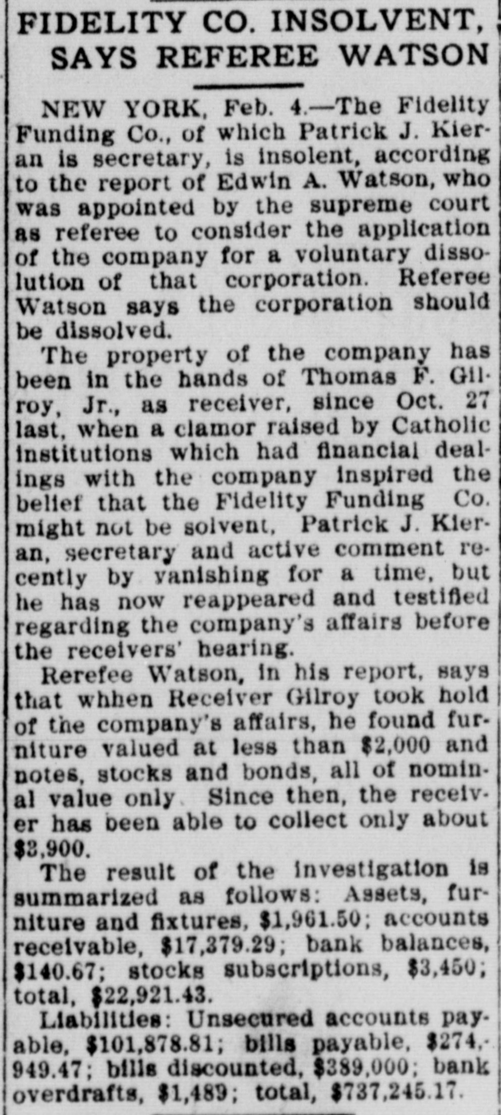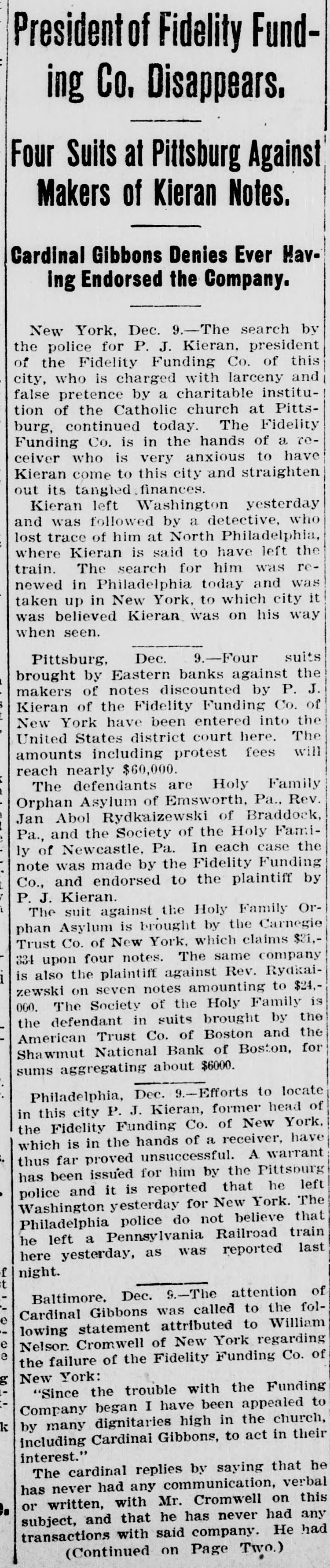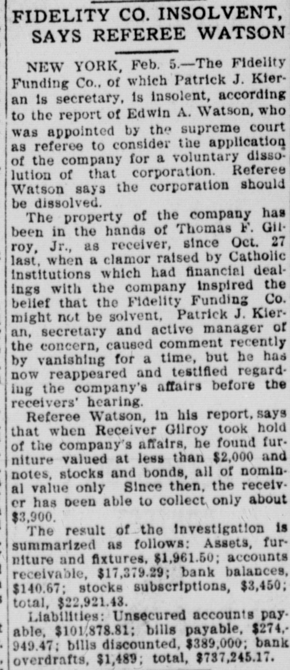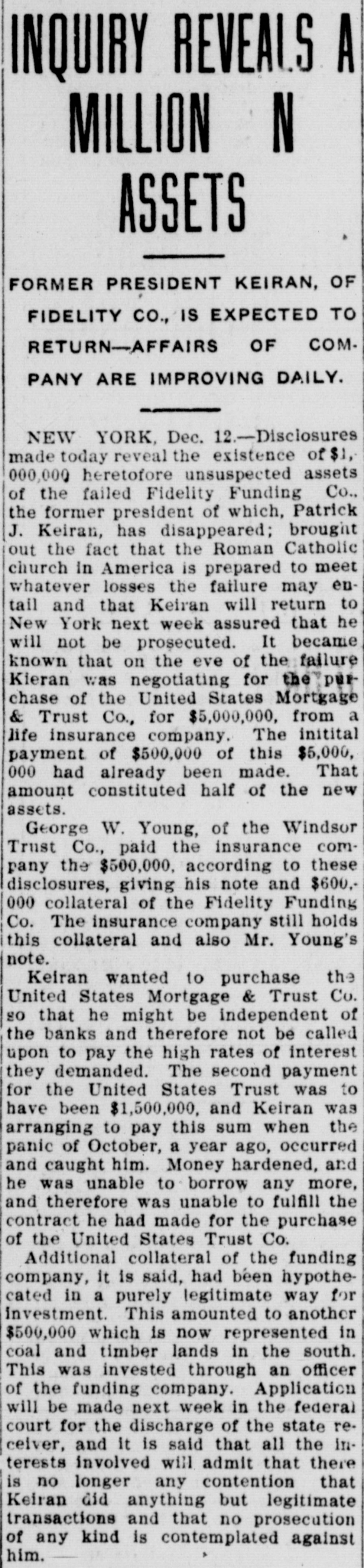 KEIRAN A 'GOOD FELLOW' BUT LOST MILLIONS NOONDAY LUNCHES AND AUTOMOBILES TO WORK FOR THE OFFICE GIRLS OF HIS DEFUNCT FIDELITY FUNDING COMPANY. BY W. G. SHEPHERD. Special Correspondence to The Press NEW YORK, Dec. 16.-Of whatever nature the financial dealings of Patrick J. Kieran of the Fidelity Funding Co. may have been, there can be no doubt that personally he was a mighty good fellow. What else but a good fellow could you call a man who was so good to his office help that every day he had a fine dinner sent in from a nearby restaurant and served in his offices, thus saving the girls quite a little money and the inconvenience of going out on days when the weather was bad? HE HAD FINE DINNERS SENT IN FOR HIS OFFICE GIRLS. What else but a good fellow could you call a man who sent his automobile around to the homes of some of the girls in the morning, to bring them down to work, and also COUNCIL ADDS PRESIDENTIAL carried them home at night in the same automobile? That was Patrick Keiran, who was known around 115 Broadway TWENTY COPS COUNT ALL as the prize employer when it came MOHR AND FUNK SUGGEST to looking after the comfort and NEW YORK, Dec. 16.-With the THAT NEEDED WEEDING OUT personal pleasure of the young filing of the official count of the OF NONDESCRIPTS BE UNwomen who worked in the offices presidential election by the state of DERTAKEN IN CONJUNCTION. of the various concerns in which Michigan the total count was ofhe was the prime mover. ficially revealed yesterday. The PATRICK J. KEIRAN. Twenty more patrolmen for the count shows Taft received a total The employes of the building, too police department. This sounds -the elevator man, the barbers of 7,637,676 votes, Bryan 6,393,182, good to those people living on the and the others with whom the man Debs 448,453, Chafin 241,252, Hisoutskirts who have been employing came in daily contact-knew gen 83,186. a peace guardian nights with Keiran as a "good spender." A half The total count shows a general money out of their own pockets increase over the election of 1904. dollar tip was one of the easiest while at the same time assessed Ranges Taft received 14,190 votes more things from which he separated with the rest of the city for police himself. And there was mourning, than did Roosevelt in 1904. Bryan protection. A new police ordinance not only in the Keiran offices, but got 1,315,211 votes more than did which provided for only 55 patrolthroughout the breadth and heigth Alton B. Parker, the democratic men, a chief, two captains, three candidate in 1904. of the building, when Keiran's Fisergeants, three drivers and three delity Funding Co. went into the jailers, was introduced last night hands of Receiver Gilroy, and its EMMA IN TROUBLE AGAIN. by Councilman Lambert. This was affices were moved to 42 Broadan increase of 10. Councilman way, adjoining Gilroy's law offices. DOUGLAS, B. C., Dec. 16.Funk desired more men and his There are other things told of Emma Goldman, who was taken amendment adding 10 was unaniKeiran, too, that make it hard to from the train en route from Belmously adopted. He said the counbelieve, as Gilroy asserts, that the lingham, where she was forced to cilmen should visit the police staFidelity Funding Co. has several leave, to Vancouver, B. C., by Cation and weed out those who have millions of liabilities and only a nadian immigration officers and outlived their usefulness. He did few hundred assets. For instance, held pending deportation orders not want to be understood as saya close wealthy friend of the missfrom Ottawa, was later released ing the aged officers had not been ing financier said today that no and allowed to proceed. good men in their younger days. matter in what city of the country Councilman Mohr took the same ECO HATED To GO BACK Keiran happened to be, on busiposition. He said in other cities ness, he never failed to go to mass they have a body of men somewhat -5 o'clock mass. Often, too, when A better range than our SAN FRANCISCO, Dec. 16.-Deuniform in size, all strong, healthy in New York, he would go to mass nied a landing on the threshold of young men, but in this city they Banner, Royal or Shaweco on his way to his offices. One of the promised land that holds his have them from 6½ feet tall to 51/2 cannot be made. We are Keiran's most cherished possesfamily and his friends, Hom Tim, and from 270 pounds in weight to sions, according to this same giving 20 per cent discount who arrived at this port two 150. friend, is a gold cross studded with months ago, went violently insane "It would appear to a stranger," off our very low prices. Now in the detention shed of the Padiamonds, worth about $5000, which he said, "that someone started out is the time to get yours. was presented to him by Catholic cific Mail Steamship Co. with a lot of stars in his pockets, Get your automobile nuns in appreciation of services he giving them out to the first men SAVE ONLY A KEY had performed in behalf of their he met." vouchers here. church work. The ordinance was recommended OAKLAND, Cal., Dec. 16.-NothOne of the girls at Keiran's out for passage at the next reguing but the key to the fire alarm Broadway office was Mrs. Lorena lar meeting. box which hung on the wall in the C. Davis, in whose name, Receiver Shaw-WellsCo office of the Flexo Building Paper Gilroy says, Keiran ran several Co.'s plant was saved from the fire "dummy" bank accounts. Keiran THAT PEANUT which destroyed the factory. The hailed originally from Buffalo, 330 Main Avenue fire caught from a saturator, the oil where the Fidelity Funding Co. was PHONE MAIN 808 DIET AGAIN in which boiled over into the fire. organized, and from Buffalo came WE KEEP OPEN EVERY also Mrs. Davis. She married very SATURDAY EVENING Special Correspondence to The Press Homeliness is a virtue that only young, and was left a widow at 20. BERKELEY, Cal., Dec. 16.-And pretty girls can appreciate. She had one child, a daughter, and now steps forward another chamthis child, s