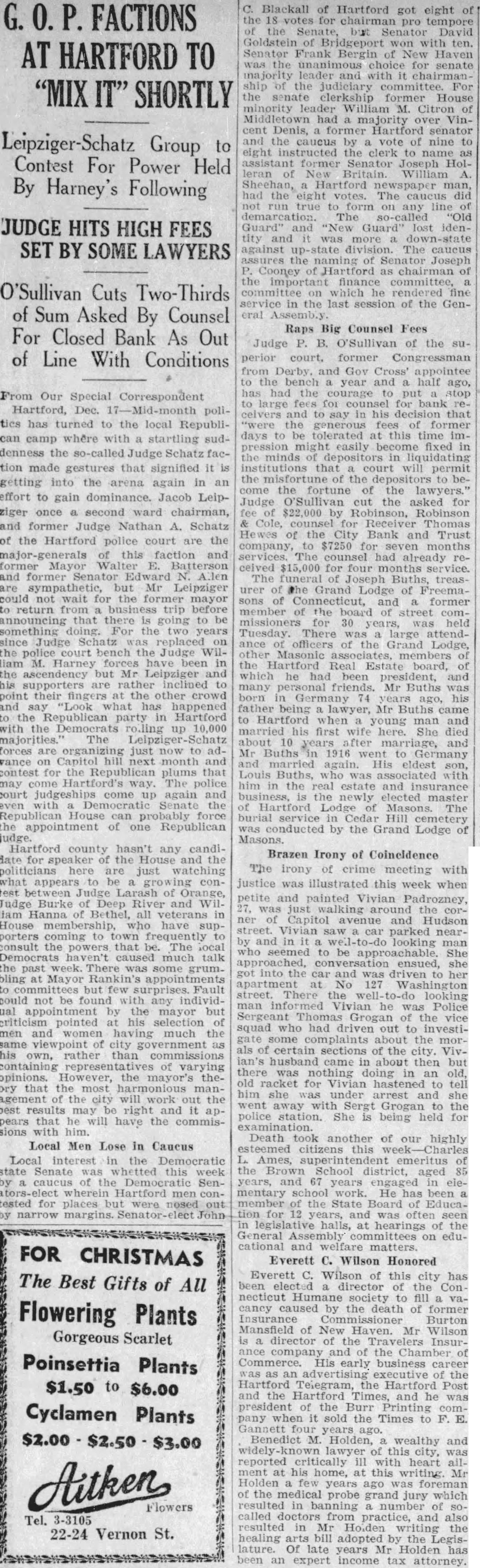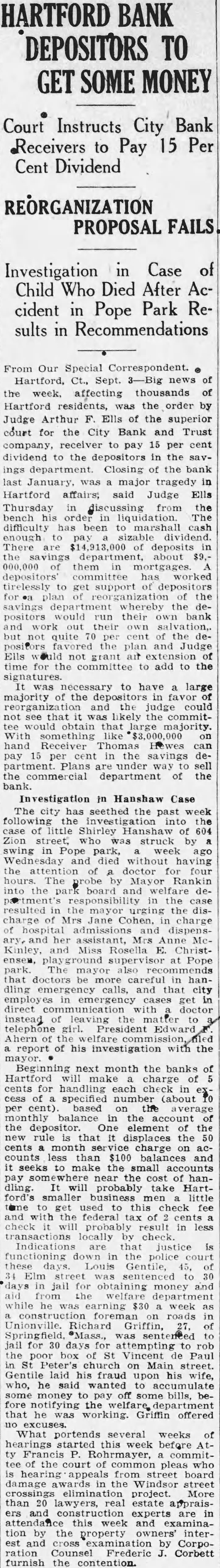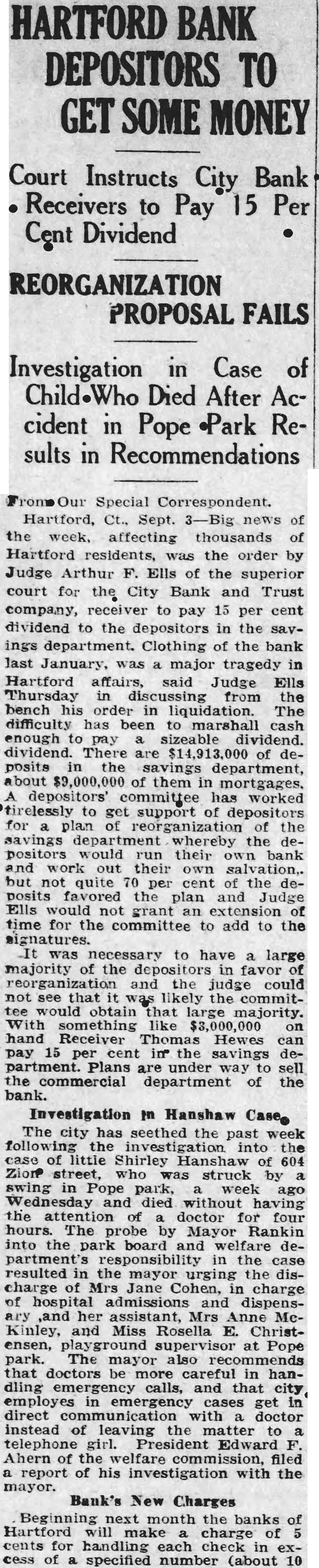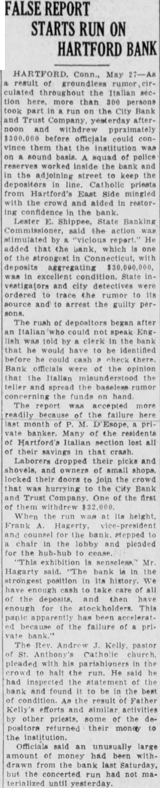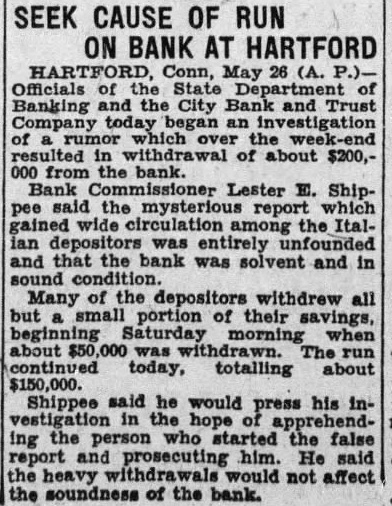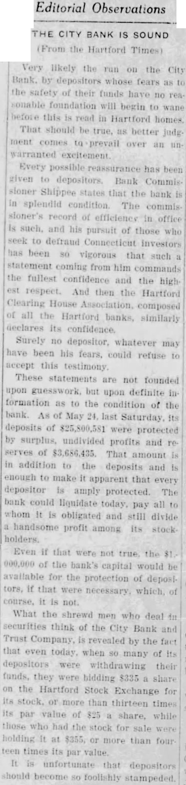 Mr. Holt told how, as news of the unjustified "run" became public, the better informed elements of the city voluntarily declared their faith in the soundness of the institution. Public statements of confidence were issued by the State Bank Commissioner and the Hartford Clearing House Association, which, in a half-page newspaper advertisement, pledged the resources of other member banks to aid the beleaguered bank. The head of a big New York City bank voluntarily sent up $250,000 for deposit and some of the large insurance companies in Hartford sent word that they were ready to assist in any practical manner while many individuals of large means came to the bank with offers of aid. The bank, however, did not have to ask aid of anyone, said Mr. Holt.