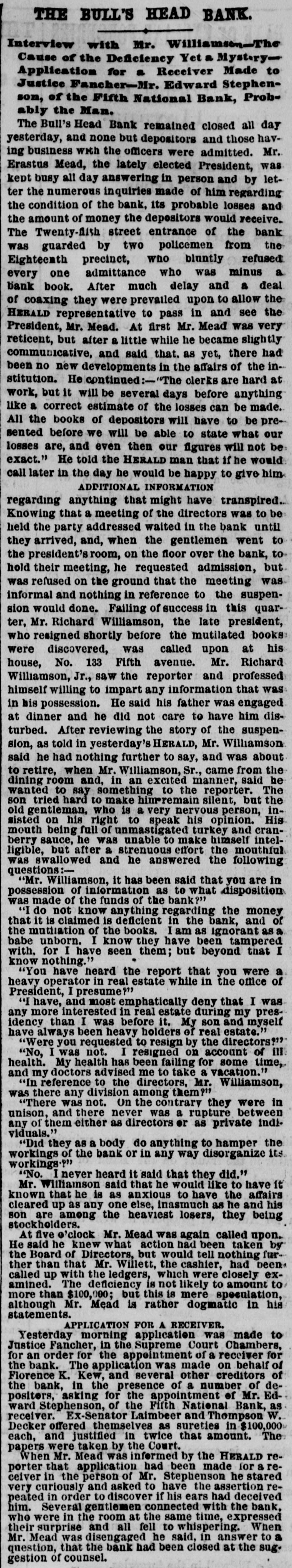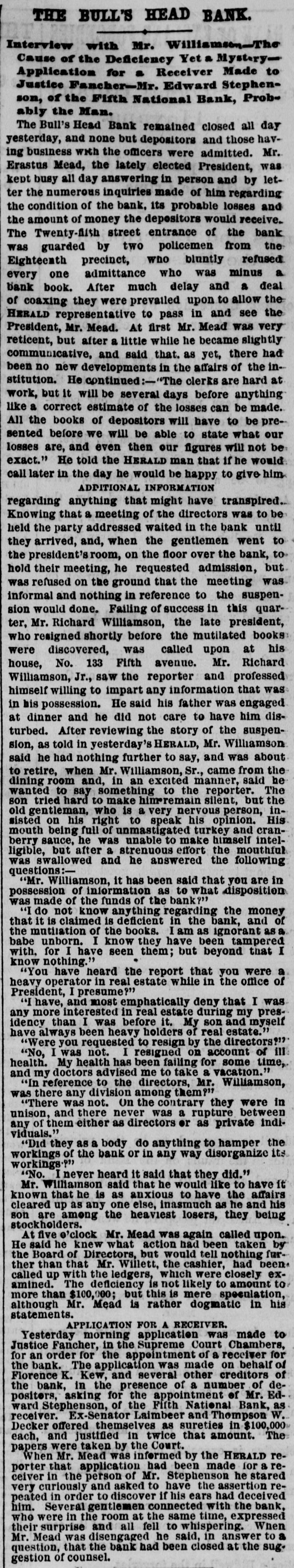 THE BULL'S HEAD BANK. Interview with Mr. Williamson-The Mysteryof the Deficiency Yet a Made to Cause for a Receiver Stephenson, Application Fancher-Mr. Edward ProbJustice of the Fifth National Bank, ably Bull's the Head Man. Bank remained closed those all hav- day The and none but depositors admitted. and Mr. yesterday, business with the officers were was ing Mead, the lately elected President, letErastus all day answering in person and regarding by kept busy numerous inquiries made of him losses and ter the of the bank, its probable receive. the condition of money the depositors would the bank the amount street entrance of from the The Twenty-fish by two policemen refused was guarded precinct, who bluntly minus Eighteenth admittance who was a deal a every book. one After much delay and to allow the bank they were prevailed upon and see the of coaxing representative to pass in was very HERALD Mead. At first Mr. Mead slightly President, but Mr. after a little while he became there had reticent, and said that. as yet, of the communicative, new developments in the affairs hard in- at been no He continued "The clerks are anything stitution. but it will be several days before be made. work, correct estimate of the losses can be prelike a books of depositors will have to what our All the before we will be able to state will not be sented and even then our figures If he would losses are, told the HERALD man that him call exact." later He in the day he would be happy to give ADDITIONAL INFORMATION anything that might directors have transpired. was to be regarding that a meeting of the bank until Knowing party addressed waited in the went to held the arrived, and, when the gentlemen over the bank, to they president's room, on the floor admission, but the meeting, he requested meeting was hold their the ground that the suspenwas refused and on nothing in reference to in the this quarinformal done. Failing of success president, sion would Richard Williamson, the mutilated late books ter, Mr. resigned shortly before the upon at his who discovered, was called Mr. Richard were 133 Fifth avenue. professed house, No. Jr., saw the reporter and that was Williamson, to impart any information was engaged himself willing He said his father him disin his possession. and he did not care to of have the suspenat dinner reviewing the story Williamson turbed. told After in yesterday's HERALD, Mr. and was about sion, as nothing further to say, from the said he had when Mr. Williamson, Sr., manner, came said The he to retire, room and, in an excited to the reporter. the wanted to say to make himeremain person, son tried who is a very his opinion. dining old gentleman, hard right something to speak nervous turkey silént, and but intel- cran- His insisted on being his full of unmastigated unable to make himself berry mouth sauce, but after he was a strenuous answered effort the the following mouthful questions: it has been to said what of information the bank?" ligible, was possession "Mr. swallowed Williamson, and he of as that disposition you money are in was made not of know the funds anything regarding in the bank, the and as a of that "I do it is claimed is deficient books. am as ignorant tampered with. for I have babe the mutilation unborn. of I know the seen they them; have but been beyond that I a were know "You nothing.' have heard in real the estate report while that in you the office of heavy any President, "I more have, operator interested and I presume?" most was emphatically in before real estate it. My deny during real son that and estate." my myself I pres- was idency have always than been I heavy to holders resign of by the directors?!! of ill "Were you requested I resigned on account some time, health. "No, I doctors My was health not. advised has been me to failing take Mr. for a vacation." Williamson, and was "In my there reference was any not. division to the on among the directors, contrary them?" a rupture they between were indi- in unison, "There them and either there as never directors was or as private the viduals." any of as a body do anything way to disorganize hamper its workings "Did they of the bank or in any did." workings "No. Williamson I never heard said it that said he that would to they have like the to have affairs his it are known cleared Mr. that up among as he any is the one as heaviest anxious else, inasmuch losers, as they he and upon. being stockholders. son o'clock Mr. Mead was had again been called taken by At five he knew what action would tell nothing furBoard of Mr. Willett, the cashier, were closely He the ther said than that Directors, but which amount had been ex- to Mr. called up with deficiency the ledgers, is not likely mere to speculation, his Mead although more amined. than The $100,00 but is this rather is dogmatic in statements. APPLICATION FOR application A RECEIVER. was made to Yesterday morning in the Supreme Court of a receiver Chambers, for Justice Fancher, for the appointment made on behalf of an order The application was other creditors of de- of bank, in the the appointment of Bank, the asking for the Fifth National for the Florence positors, bank. K. Kew, and of presence several of and Thompson a number Mr. Ed- W. as ward Stephenson, Ex-Senator Laimbeer sureties in $100,000 The receiver. offered themselves twice as that amount. each, were taken was by the informed by the made for reWhen Mr. had been he stared papers Decker and that justified Mead application in Mr. Court. Stephenson assertion HERALD re- reporter ceiver in the person and asked of to have ears the had deceived peated very curiously in order gentlemen to discover connected if his time, with expressed the bank. him. who were Several in the and room all at fell the to same said, whispering. in answer When to a Mr. their Mead surprise that was disengaged the bank had he been closed at the suggestion question, of counsel.