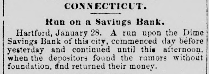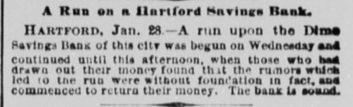 CONNECTICUT. Run on a Savings Bank. Hartford, January 28. A run upon the Dime Savings Bank of this city, commenced day before yesterday and continued until this afternoon, when the depositors found the rumors without foundation, and returned their money.