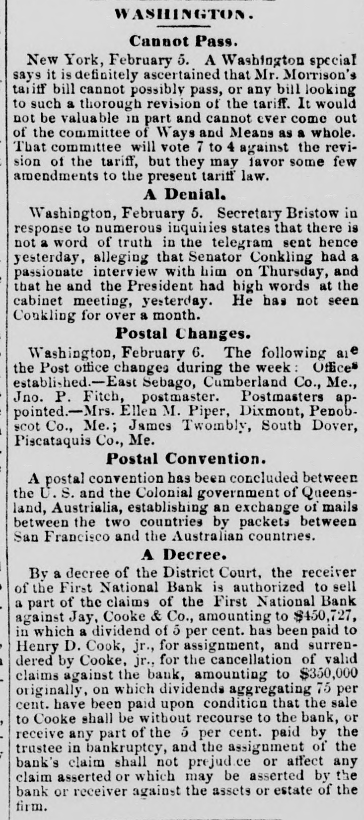 WASHINGTON. Cannot Pass. New York, February 5. A Washington special says it is definitely ascertained that Mr. Morrison's tariff bill cannot possibly pass, or any bill looking to such a thorough revision of the tariff. It would not be valuable in part and cannot ever come out of the committee of Ways and Means as a whole. That committee will vote 7 to 4 against the revision of the tariff, but they may lavor some few amendments to the present tariff law. A Denial. Washington, February 5. Secretary Bristow in response to numerous inquiries states that there is not a word of truth in the telegram sent hence yesterday, alleging that Senator Conkling had a passionate interview with him on Thursday, and that he and the President had high words at the cabinet meeting, yesterday. He has not seen Conkling for over a month. Postal Changes. Washington, February 6. The following al the Post office changes during the week: Office* established.-East Sebago, Cumberland Co., Me., Jno. P. Fitch, postmaster. Postmasters appointed.-Mrs. Ellen M. Piper, Dixmont, Penobscot Co., Me.; James Twombly, South Dover, Piscataquis Co., Me. Postal Convention. A postal convention has been concluded between the U. S. and the Colonial government of Queensland, Austrialia, establishing an exchange of mails between the two countries by packets between San Francisco and the Australian countries. A Decree. By a decree of the District Court, the receiver of the First National Bank is authorized to sell a part of the claims of the First National Bank against Jay, Cooke & Co., amounting to $450,727, in which a dividend of 5 per cent. has been paid to Henry D. Cook, jr., for assignment, and surrendered by Cooke, jr., for the cancellation of valid claims against the bank, amounting to $350,000 originally, on which dividends aggregating 75 per cent. have been paid upon condition that the sale to Cooke shall be without recourse to the bank, or receive any part of the 5 per cent. paid by the trustee in bankruptcy, and the assignment of the bank's claim shall not prejud.ce or affect any claim asserted or which may be asserted by the bank or receiver against the assets or estate of the firm.