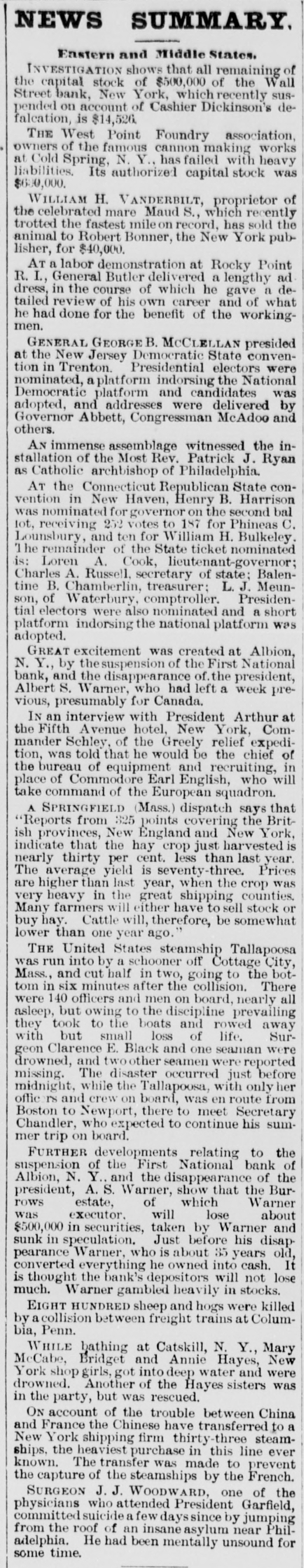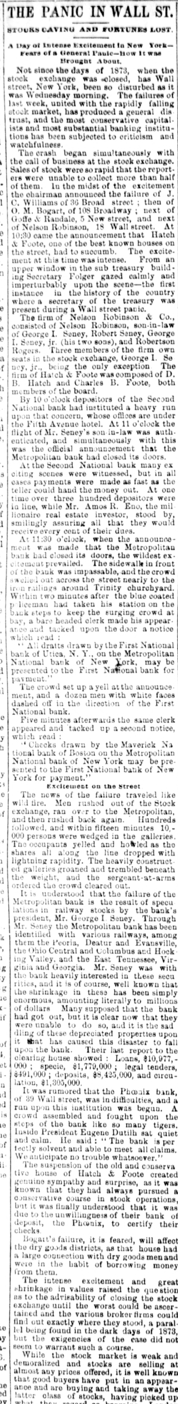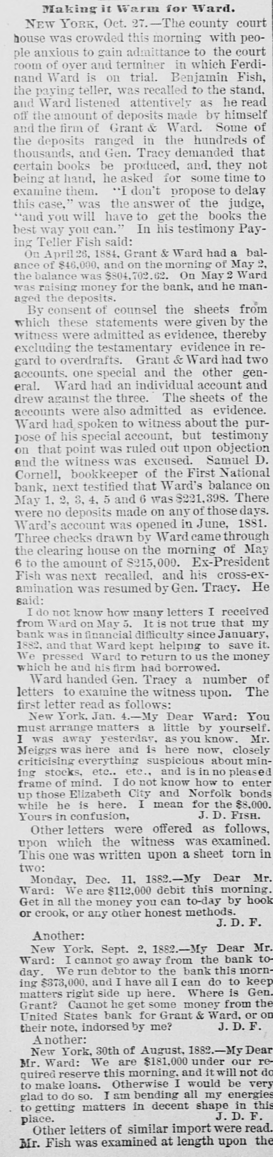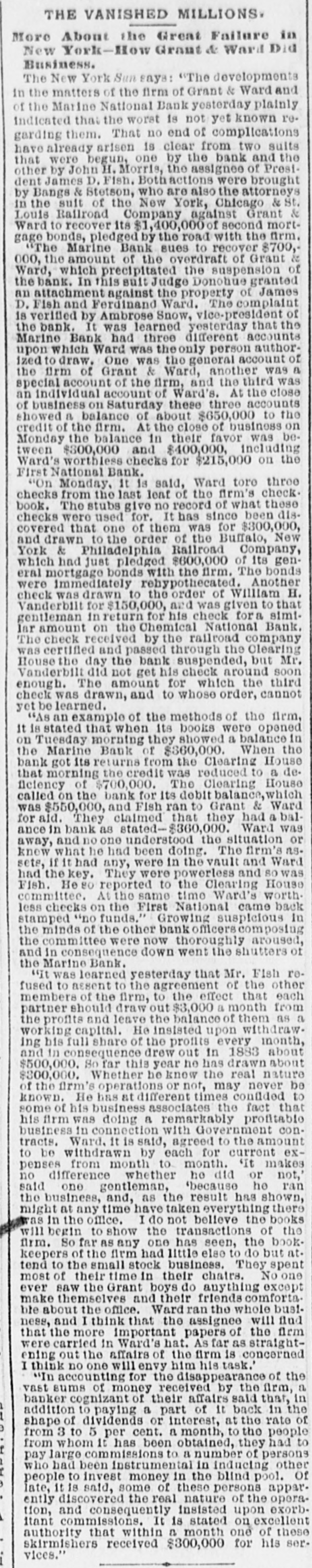 the more About Great THE VANISHED MILLIONS. Failure & Did Ward New Grant York-Hot Business. @The developments & and Ward The New matters York of the firm Bank of Grant yesterday known plainly rein of the the Marine that National the worst no is end not of yet complications two suits indicated garding them. arison That is clear by the from bank of and Prest- the have already begun one the assignee were brought other that were by John D. H. Fish. Morris, Both who are actions also Chicago the attorneys & St. dent by Bangs James suit & Stetson, of the Company New York, against of second Grant mort- & Ward Louis in the to Railroad recover pledged its $1,400,000 by the Bues road to recover with of the Grant $700, frrm. of gage "The bonds, Marine Bank of the overd Buspension the granted 000, Ward, the which amount In this precipitated Buit Judge the property Donobue The complaint of James of the an Fish bank. and Ambrose against snow, Ward. yesterday vico-president accounts that the 18 D. verified by It was learned different authorMarine the bank Bank Ward had was three the the only general person account was of a upon to which draw. Grant one was & Ward, and another the third close was the ized firm account of of the firm, of Ward's At the accounts special individual account Saturday these $650,000 three to the on tween of showed an business a the balance on firm. of At in the about their close favor of business including was beworthless toro credit Monday of $300,000 the balance checks and $400,000, for $215,000 on three the First Ward's "on National Monday. Bank. it last is 10af said, record of the Ward of firm's what been check. these dischecks The from stubs the give for. no It has since for $300, New book. checks were used one of them of was the Buffalo, Company, covered the Railroad its drawn $600,000 The York had just with the H. and which & that Philadelphia to bonds pledged order rebypothecated firm. William of Another bonds general were mortgago Immediately drawn to the o order and was given for a to simi- that in on the railroad check gentleman vanderbill amount was received for return $150,000, Chemical by for the through his check National the company Clearing Bank, Mr. The lar check and passed suspendent but soon certified day the bank his check the third was did amount to for whose order, be enough. check was Vanderburge House the drawn, not and get methods which of the opened cannot Arm, of an when its a the yet "As learned. example that of the showed books were balance When on Marine Bank from the reduced to a got its the credit was Clearing bank it the 18 stated Tuesday morning returns they $360,000. The Clearing House House which dethat morning $700,000. debit balance, & Ward ficiency of bank for its ran to Grant had a bal called $550,000 on the and claimed Fish that they Ward was or for was aid. in bank They as understood The situation firm's Ward ns. knew away, ance what and no he one any, had were been in doing. powerless the vault and and House so was sets, the key. if it had reported They were to the time Clearing Ward's worth. back had He 80 same National came in committee. Fish. checks on the the First Growing suspicious minds of the were other down now thoroughi went the shutters stamped the less the committee in consequence "no funds.' bank that Mr. aroused, Fish other re- of the and Marine was learned Bank. the yesterday agreement of that the from each should the to of the frrm, to 3,000 a them as fused members partners "It assent and leave to draw out insisted the balance effect upon every of month withdraw- month, the profits capital. He profits 1883 about working full share of drew the out in drawn about $500,000. Whether be or not, may confided $300,000. ing and his in consequence So operations far this year know no times has the the real fact never nature that be to known. He business remarkably of the firm's has at different associates profitablo some firm was with to the business in it is said, for it to did his of his Ward. connection doing by a each agreed Government current amount makes not, con- exfrom whether tracts. to penses be withdrawn month month. because no or no shown, ran difference result has there no said the business, one time and, have as the taken believe everything the of books the was might in at the any office. show I do the Transactions has seen, do but book at. begin so far AS any little elso to They spent keepers the of the small stock their chairs. tend will firm. to to time firm in had one business. do anything comforta. No one except most ever of saw themselves their the Grant and boys Ward their ran friends the whole will busi- find ness, make bie about and I the think office. important that the papers assignee As far of as concerned straight- the firm were affairs him his ening that the carried out the more in will Ward's lenvy of hat. the firm appearance task.' is firm, of the I in a "In sums acco of money of their affairs it back said in the of vast think no unting one for the received by the that, cognizant part of at the rate banker addition to dividends paying a or interest, month, to they the people had to shape of per cent. obtained, of persons from from large 3 whom to com 5 it missions Instrumental has been to a the number in inducing blind pool. appar- other Of who pay had to been invest money of in these persons of the operapeople late, it 18 said, some the real insisted nature upon excellent exorbauthority received itant tion, that within $300,000 skirmishers ently discoversequently and commissions. It n is month stated one for on of his these services."