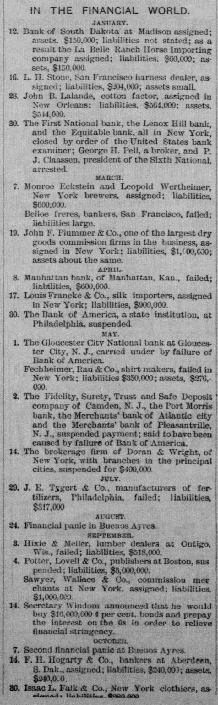 [Continued from 2d page.] IN THE FINANCIAL WORLD. JANUARY. 12. Bank of South Dakota at Madison assigned: assets, $100,000; liabilities not stated: as a result the La Belle Ranch Horse Importing company asigned: liabilities. $60,000; sets, $150,000. IS L. H. Stone, San Francisco harness dealer, an signed; liabilities, $204,000; essets small. S. John B. Lalande, cotton factor. assigned in New Orleans: liabilities, $564,000; assets. $544,000. 30. The First National bank. the Lenox Hill bask, and the Equitable bank. all in New York, closed by order of the United States bank examiner: George H. Pell, a broker. and P. J. Classen, president of the Sixth National arrested MARCH. 2. Monroe Eckstein and Leopold Wertheimer, New York brewers, assigned; liabilities, $600,000. Belloe freres, bankers. San Francisco, failed: liabilities large. 19. John F. Plummer & Co., one of the largest dry goods commission firms in the business, as signed in New York: liabilities, $1,000,000; assets about the same. APRIL & Manhattan bank, of Manhattan, Kan., failed: liabilities, $600,000. 17. Louis Franoke & Co., silk importers, assigned in New York: liabilities, $900,000. 80. The Bank of America, a state institution, at Philadelphia. suspended MAY. 1. The Gloucester City National bank at Glouces ter City, N. J., carried under by failure of Bank of America. Fechheimer, Rau & Co., shirt makers. failed in New York; liabilities $350,000; assets, $276, 000 2. The Fidelity, Surety, Trust and Safe Deposit company of Camden, N. J., the Port Morris bank, the Merchants' bank of Atlantic city and the Merchants bank of Pleasantville, N. J., suspended payment; said to have been caused by failure of Bank of America. 14. The brokerage firm of Doran & Wright, of New York, with branches in the principal cities, suspended for $400,000 JULY. 29. J. E. Tygert & Co., manufacturers of fer tilizers, Philadelphia, failed: liabilities, $817,000 AUGUST 24. Financial paule in Buenos Ayrea SEPTEMBER. 3. Hixie & Meller, lumber dealers at Ontigo, Wis, failed; liabilities, $518,000. 4. Potter, Lovell & Co., publishers at Boston, sus pended: liabilities, $5,000,000. Sawyer, Wallace & Co., commission mer chants at New York, assigned: liabilities $1,000,000 14. Secretary Windom announced that be would buy $16,000,000 4 per cent. bonds and prepay the interest on the Gs in order to relieve financial stringency. OCTOBER 7. Second financial panic at Buenos Ayres. 14. F. H. Hogarty & Co., bankers at Aberdeen. S. Dak., assigned; liabilities, $240,000; assets $840,000. 30 Isaac L. Falk & Co., New York clothiers, as signed; liabilities, $280,000. Isadore Rosenthal, New York cloak manu facturer, assigned: liabilities, $150,00): as sets, $51,000. 31 Leopold Bros. & Co., Chicago clothiers, as signed; liabilities, $825,000; assets, $325,000 NOVEMBER. 11. Great excitement in Wall street, New York, and fears of a panic: three failures an nounced: Charles M. Whitney & Co., David Ri chmond, and Decker, Howell & Co., with liabilities of $10,000,000; assets more. John T. Walker & Sons, New York, import ers, assigned: liabilities, $1,100,000; assets, $1,300,000. sed 12. The North River bank, of New York, its doors, and there were two small Bulures on the Stock Exchange. 15 Financial panic in England, and probably in America, averted by the Bank of England and others guaranteeing £9,000,000 for the firm of Baring Bros., embarrassed by drop in foreign securities. 16. The Kansas City Packing and Refrigerator company assigned; liabilities, $750,000. 20. Barker Bros. & Co., Philadelphia bankers, sus pended. 22. United States Rolling Stock company, of Illi nois, Alabama and Ohio, liquidated; liabili ties, $3,816,000; assets, $6,053,000. 24. Thomas Fawcett & Co., coal dealers of Pitts burg, assigned: liabilities, $400,000; assets. $600,000 25. Richard H. Allen & Co., bankers and commis sion merchants, New York, assigned, liabili ties $1,000,000; Thomas H. Allen & Co., Memphis correspondents of the New York firm, also went under: liabilities, $750,000: as sets, $1,500,000 Receiver appointed in New York for the Ore gon Improvement company, Henry Villard's pet scheme; liabilities, $2,000,000; assets much larger 26. Bell & Eyster, bankers, assigned at Duluth Minn.: liabilities, $5,235,211: assets, $4,124, 112 28. B. K. Jamison & Co., Philadelphia bankers, as signed DECEMBER. 2. Bank of Commerce, at West Superior, Wis. assigned. First National bank of Texarkana, Ark., sus pended; liabilities, $150,000; assets, $225,000 5. Delamater & Co., bankers, Meadville, Pa., as signed V. & A. Meyer, of New Orleans, assigned liabilities. $1,500,000; assets, $2,000,000