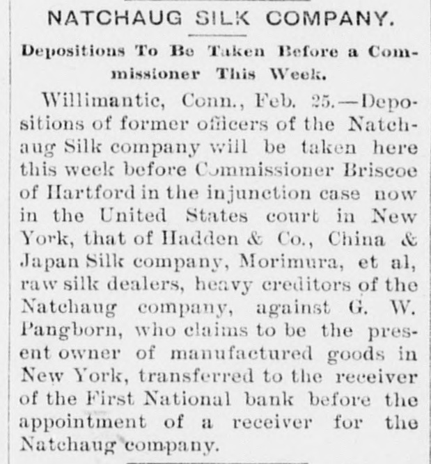 NATCHAUG SILK COMPANY. Depositions To Be Taken Before a Commissioner This Week. Willimantic, Conn., Feb. 25.-Depositions of former officers of the Natchaug Silk company will be taken here this week before Commissioner Briscoe of Hartford in the injunction case now in the United States court in New York, that of Hadden & Co., China & Japan Silk company, Morimura, et al, raw silk dealers, heavy creditors of the Natchaug company, against G. W. Pangborn, who claims to be the present owner of manufactured goods in New York, transferred to the receiver of the First National bank before the appointment of a receiver for the Natchaug company.
