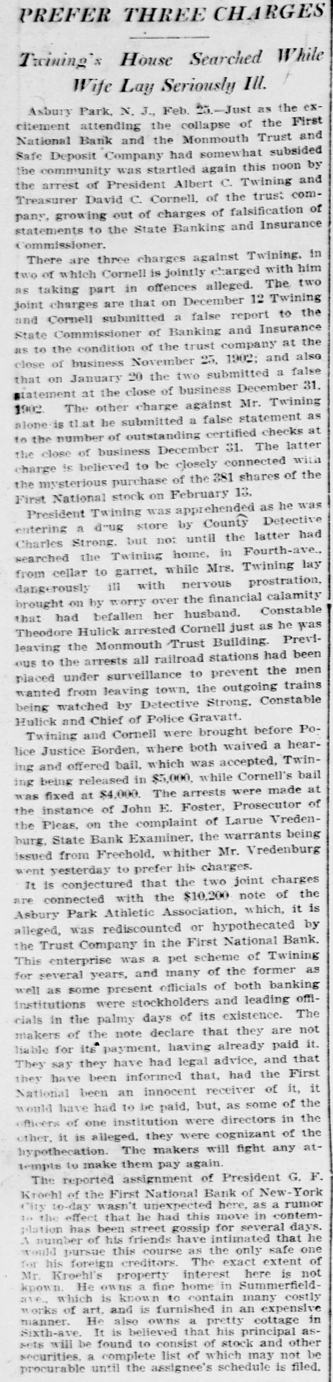 PREFER THREE CHARGES Twining's House Searched While f Wife Lay Seriously Ill. Asbury Park, N. J., Feb. 20.-Just as the excitement attending the collapse of the First National Bank and the Monmouth Trust and Safe Deposit Company had somewhat subsided the community was startled again this noon by the arrest of President Albert C. Twining and Treasurer David C. Cornell, of the trust company, growing out of charges of falsification of statements to the State Banking and Insurance Commissioner. There are three charges against Twining. in two of which Cornell is jointly charged with him as taking part in offences alleged. The two joint charges are that on December 12 Twining and Cornell submitted a false report to the State Commissioner of Banking and Insurance as to the condition of the trust company at the close of business November 25. 1902; and also that on January 20 the two submitted a false statement at the close of business December 31. 1902 The other charge against Mr. Twining tlat he submitted a false statement as of outstanding of business December alone-is to the the close number certified 31. The checks latter at charge is believed to be closely connected with the mysterious purchase of the 381 shares of the First National stock on February 13. President Twining was apprehended as he was entering a drug store by County Detective Charles Strong, but not until the latter had searched the Twining home, in Fourth-ave., from cellar to garret, while Mrs. Twining lay dangerously ill with nervous prostration, brought on by worry over the financial calamity that had befallen her husband. Constable Theodore Hulick arrested Cornell just as he was the Monmouth Trust Building. Previarrests all railroad ous leaving to the stations prevent had the been men placed under surveillance to wanted from leaving town, the outgoing trains being watched by Detective Strong. Constable Hulick and Chief of Police Gravatt. Twining and Cornell were brought before Police Justice Borden, where both waived a hearing and offered bail, which was accepted, Twining being released in $5,000, while Cornell's bail was fixed at $4,000. The arrests were made at of John E. Foster, Prosecutor of on the complaint of the the Pleas, instance warrants Larue Vreden- being burg, State Bank Examiner, the issued from Freehold, whither Mr. Vredenburg went yesterday to prefer his charges. It is conjectured that the two joint charges are connected with the $10,200 note of the Asbury Park Athletic Association, which, it is alleged, was rediscounted or hypothecated by the Trust Company in the First National Bank. This enterprise was a pet scheme of Twining for several years, and many of the former as well as some present officials of both banking institutions were stockholders and leading officials in the palmy days of its existence. The makers of the note declare that they are not having have had legal liable They say for they its payment, advice, already and paid that it. they have been informed that, had the First National been an innocent receiver of it, it would have had to be paid, but, as some of the officers of one institution were directors in the other. it is alleged. they were cognizant of the hypothecation. The makers will fight any attempts to make them pay again. The reported assignment of President G. F. Kroehl of the First National Bank of New-York City to-day wasn't unexpected here, as a rumor to the effect that he had this move in contemplation has been street gossip for several days. A number of his friends have intimated that he would pursue this course as the only safe one for his foreign creditors. The exact extent of Mr. Kroehl's property interest here is not known. He owns a fine home in Summerfieldave., which is known to contain many costly works of art. and is furnished in an expensive manner. He also owns a pretty cottage in Sixth-ave. It is believed that his principal assets will be found to consist of stock and other securities. a complete list of which may not be procurable until the assignee's schedule is filed.