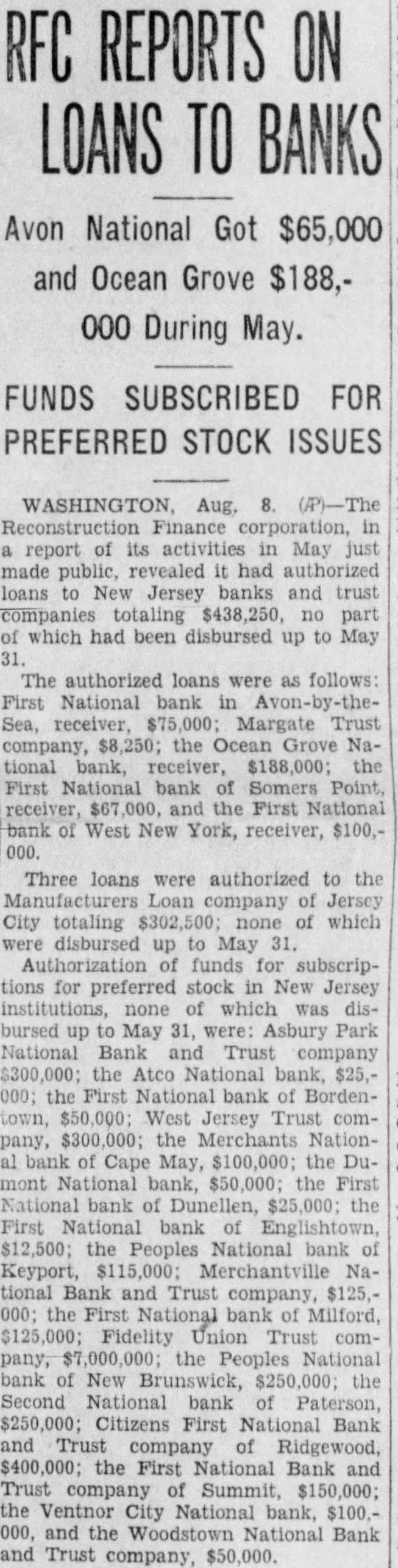 REPORTS ON LOANS TO BANKS Avon National Got $65,000 and Ocean Grove $188,During May. FUNDS SUBSCRIBED FOR PREFERRED STOCK ISSUES Aug. report of activities May revealed had loans New Jersey banks and trust $438,250, no which had been disbursed up to The authorized loans were follows: First National Margate Trust company, the Ocean Grove National bank, receiver, $188,000; the First National bank Somers receiver, the First National New York, receiver, $100,000. Three loans were authorized to company Jersey totaling none of which disbursed up May funds for subscriptions for preferred stock in New Jersey which disbursed May were: Asbury Park National Bank Trust company the Atco National bank, $25,the First National bank BordenWest Jersey Trust company, the Merchants Nationbank Cape May, the DuNational bank, the First National bank Dunellen, the First National bank Englishtown, the Peoples National bank Keyport, $115,000; Merchantville NaBank and Trust company, $125,the First National bank Milford, $125,000; Fidelity Union Trust comthe Peoples National Brunswick, the Second National bank Paterson, $250,000; Citizens First Bank and company Ridgewood, $400,000; the First National Bank and Trust company Summit, $150,000; Ventnor National bank, and Woodstown National Bank and Trust company,