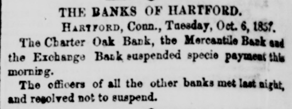 The Charter Oak, Mercantile, and Exchange banks have suspended specie payments.
